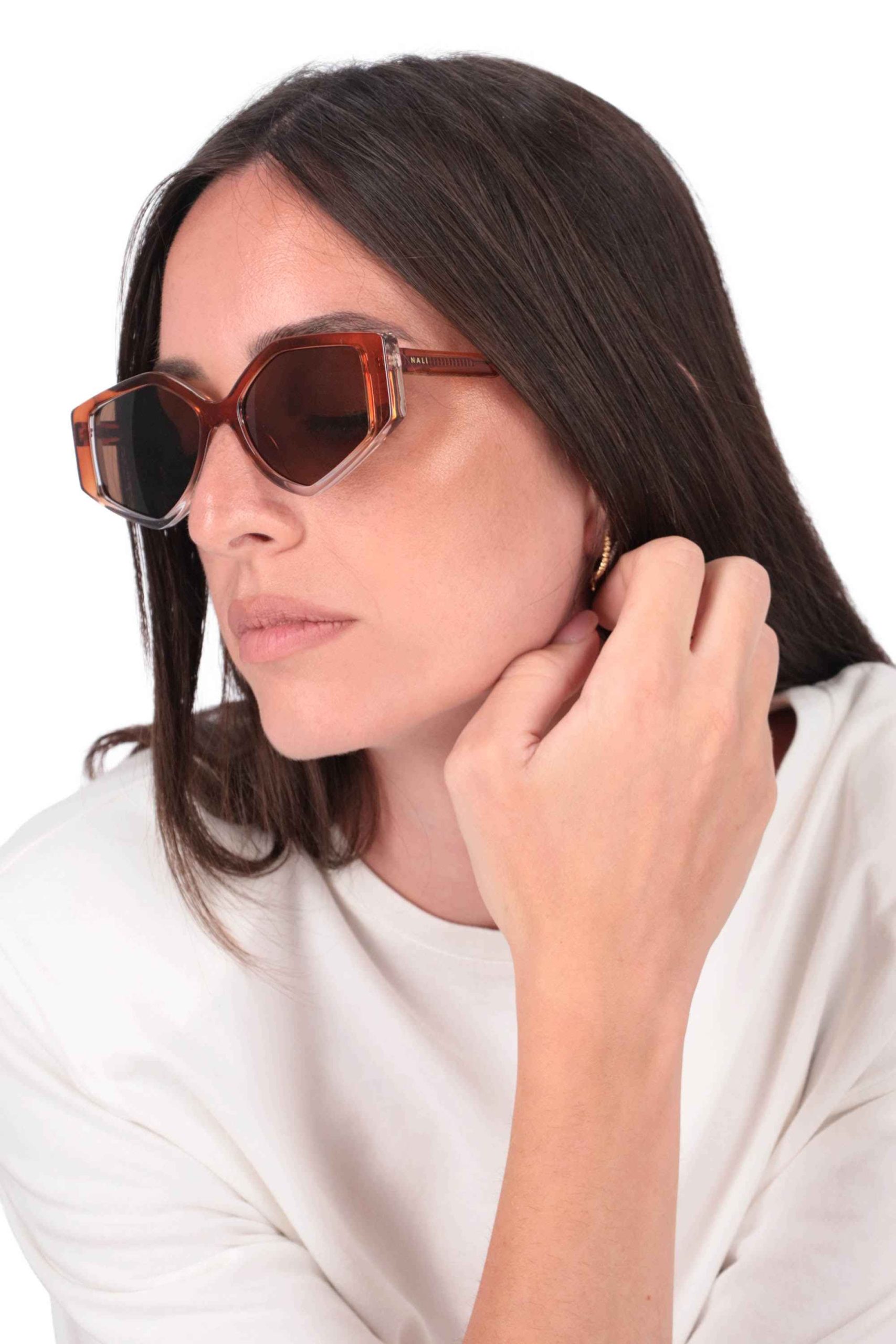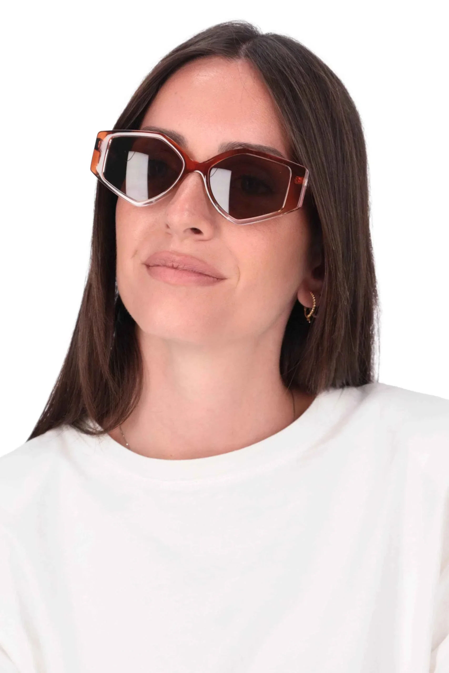 Gli occhiali sono realizzati in policarbonato, con montatura in cellulosa dalla forma geometrica e trasparente.