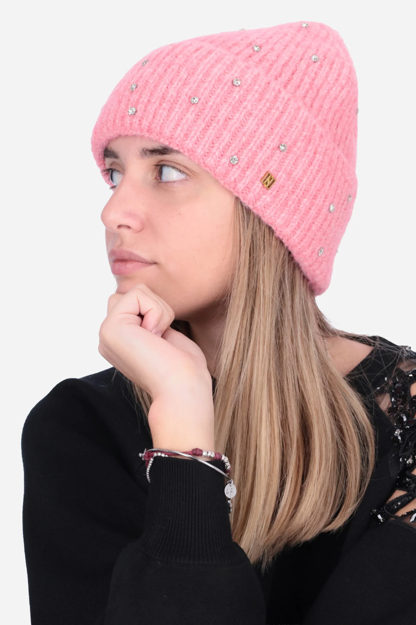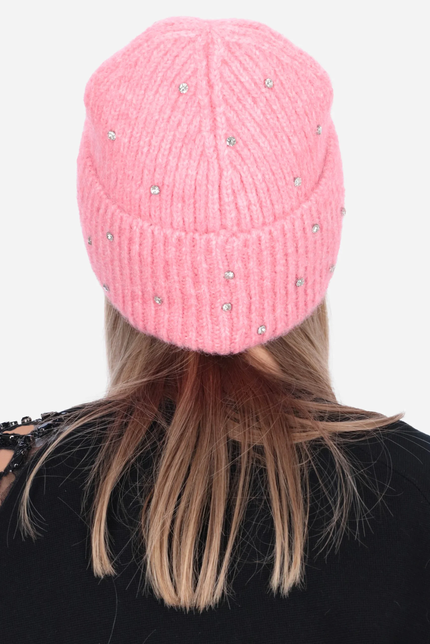 Il cappello è realizzato in maglia con applicazione di strass all over e risvolto sul fondo.