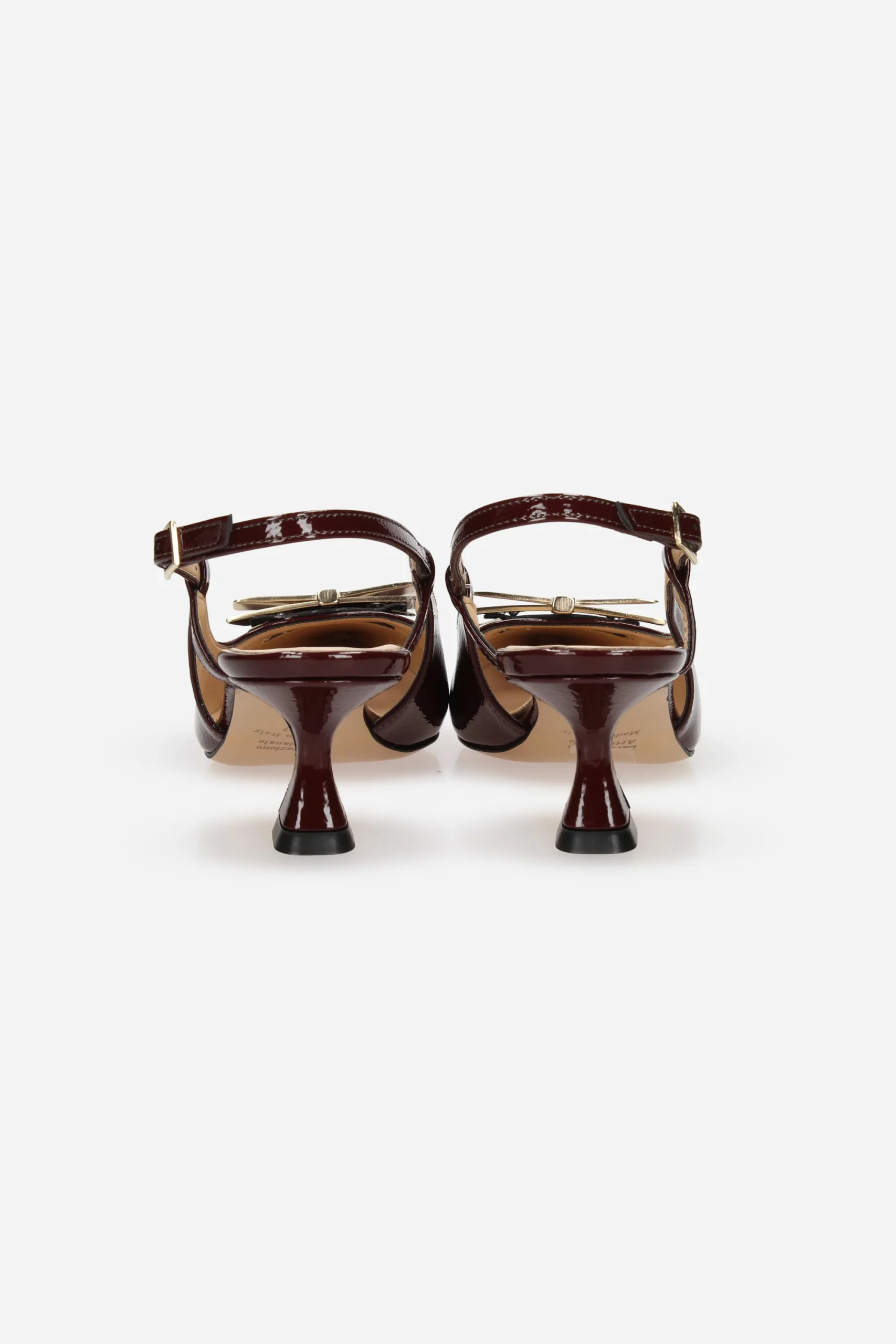 Presenta accessorio sul davanti e cinturino al tallone con fibbia regolabile, plantare in pelle.