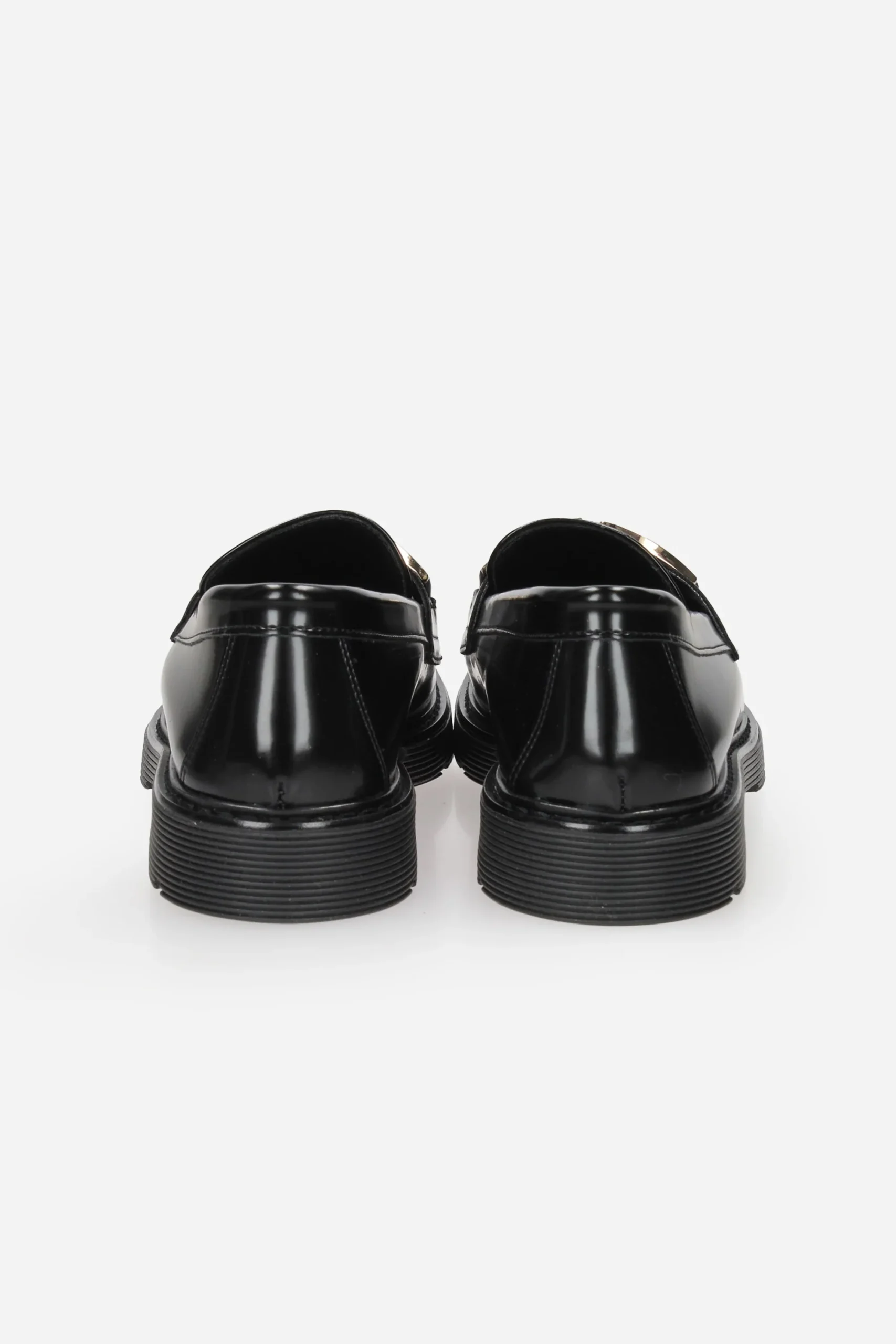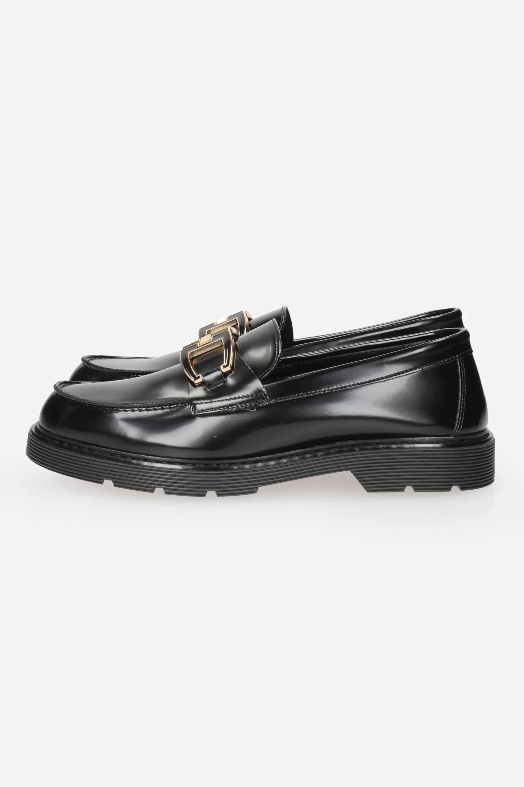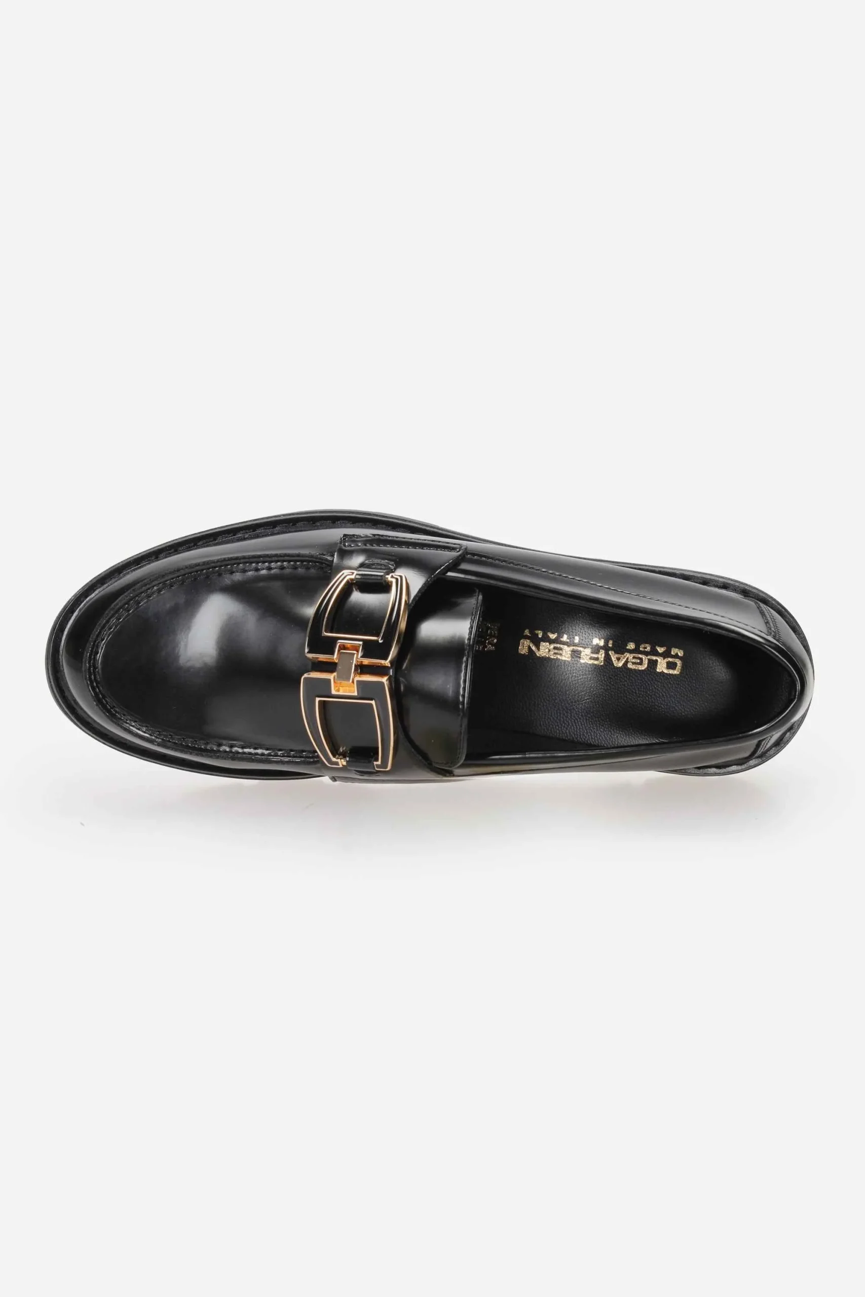 Presenta impuntura e fascia con accessorio in metallo sul davanti, plantare in pelle.