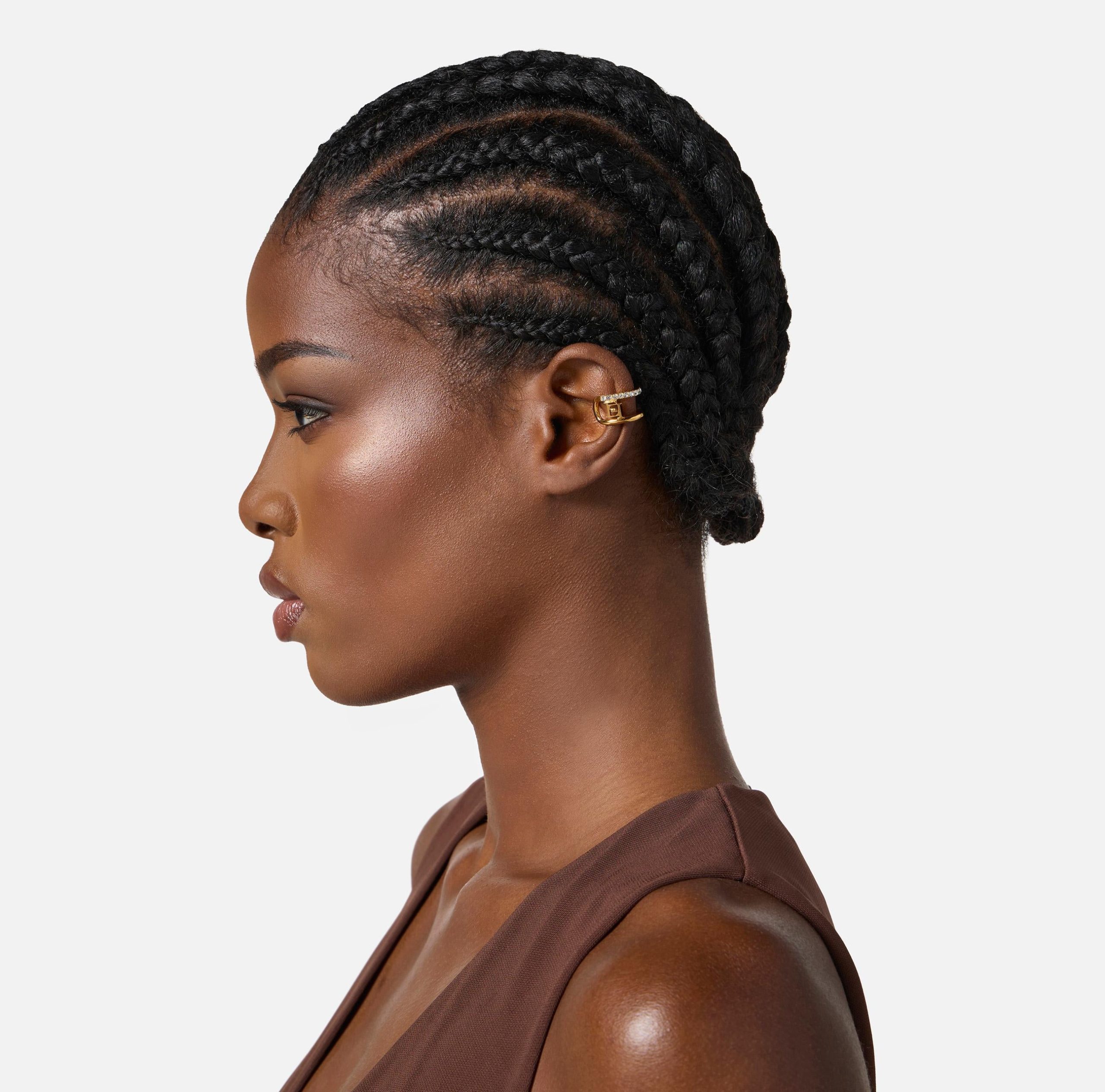 Orecchini earcuff in metallo con finitura dorata, impreziositi dalle decorazioni in strass e dal doppio logo centrale.