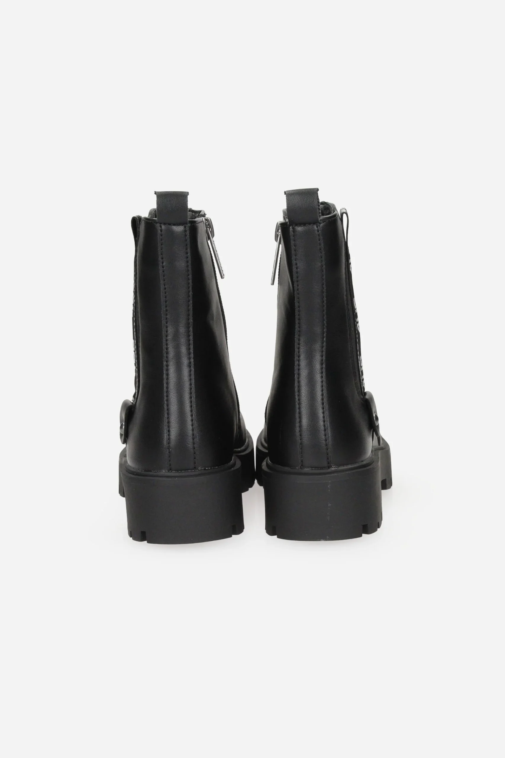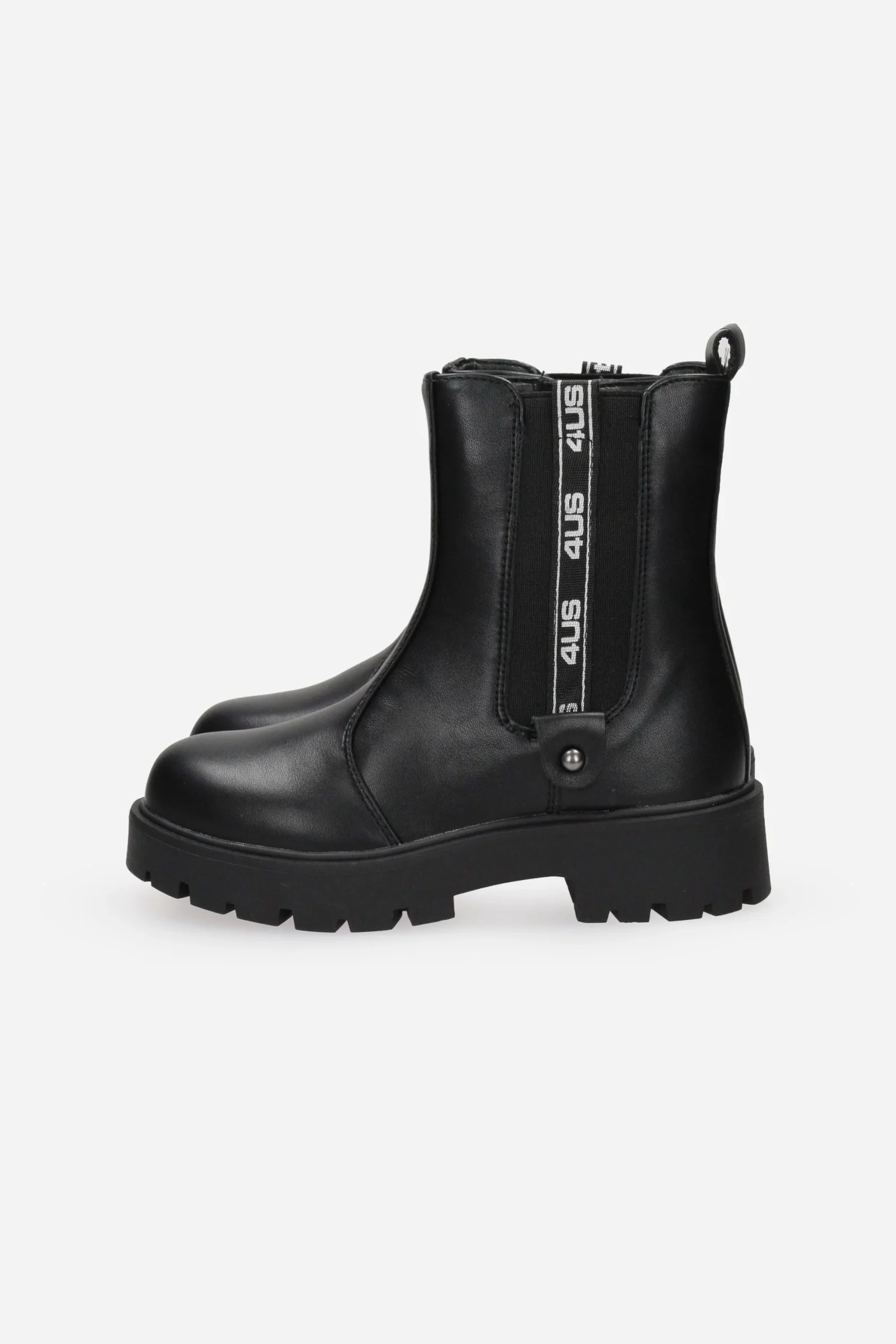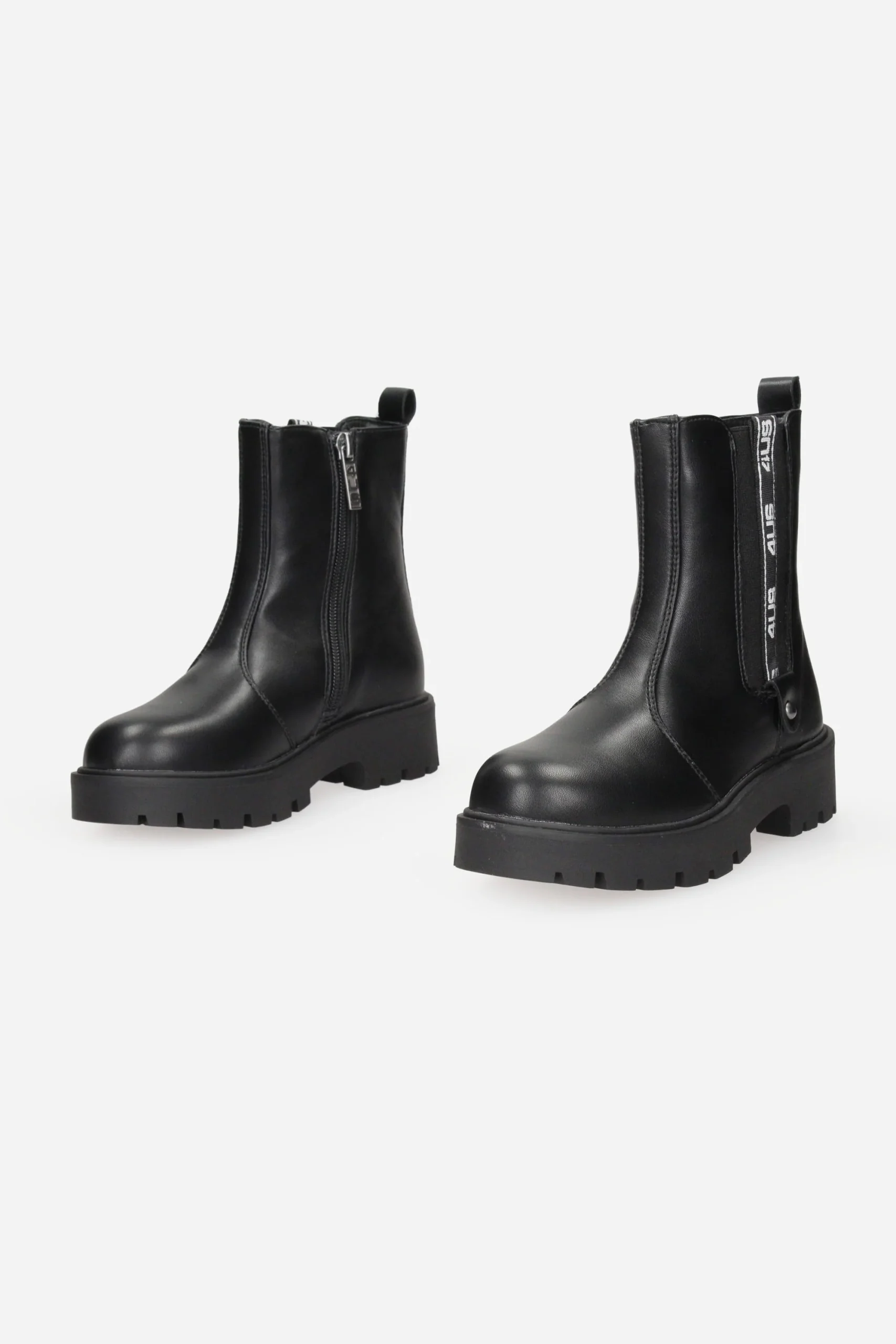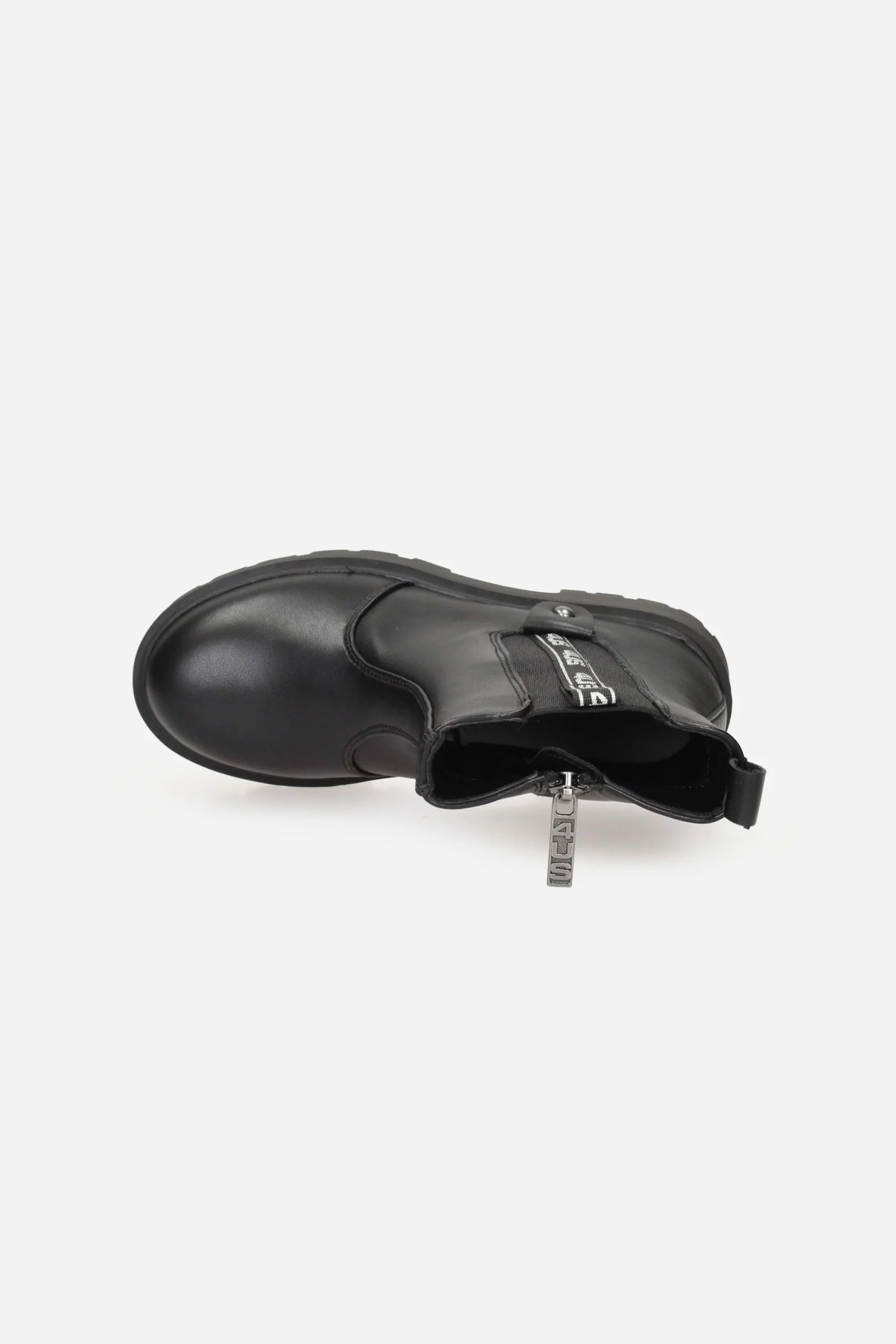 Presenta fascia elastica con logo e strass, chiusura zip sul lato interno, plantare anatomico in pelle.