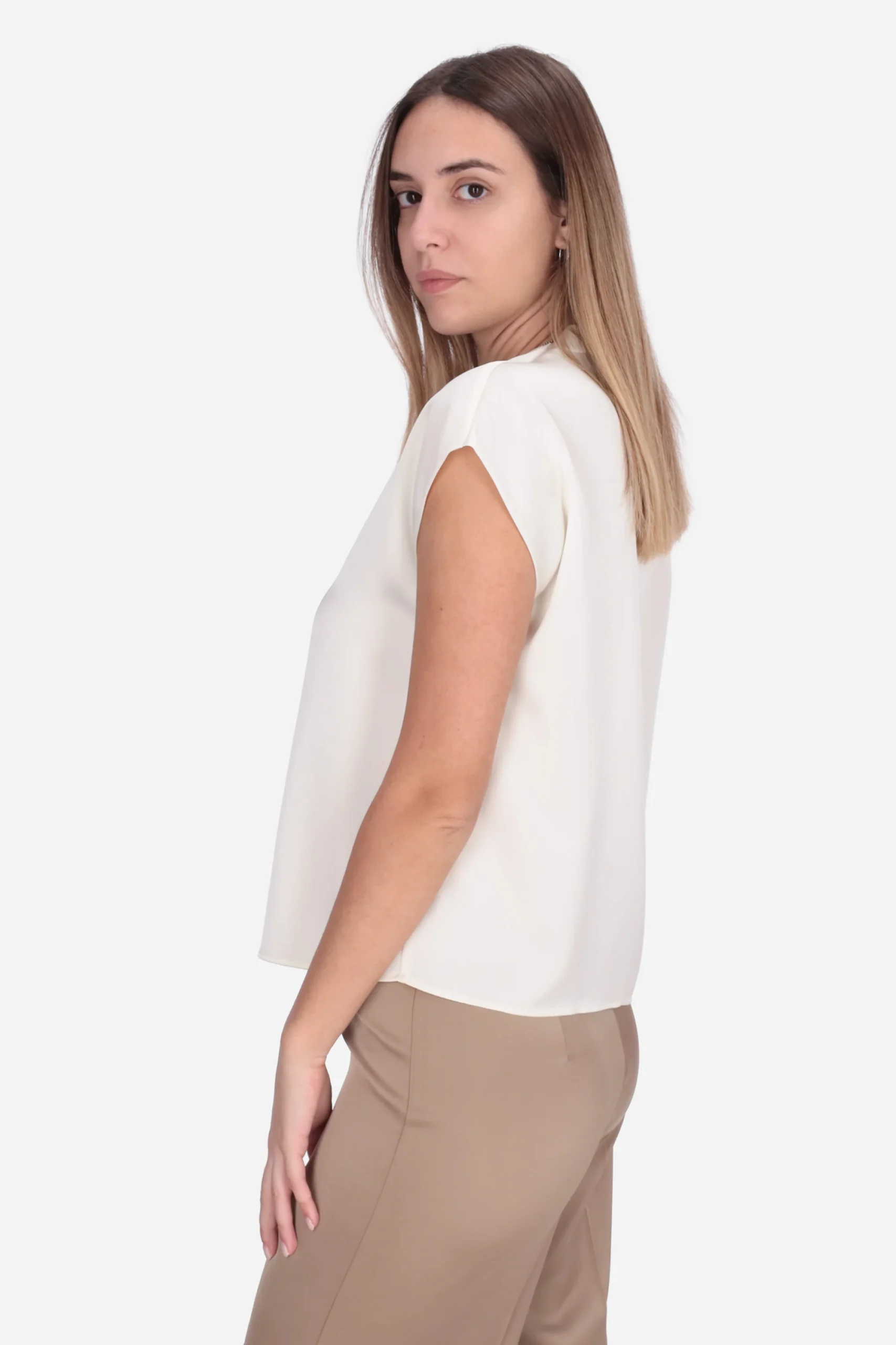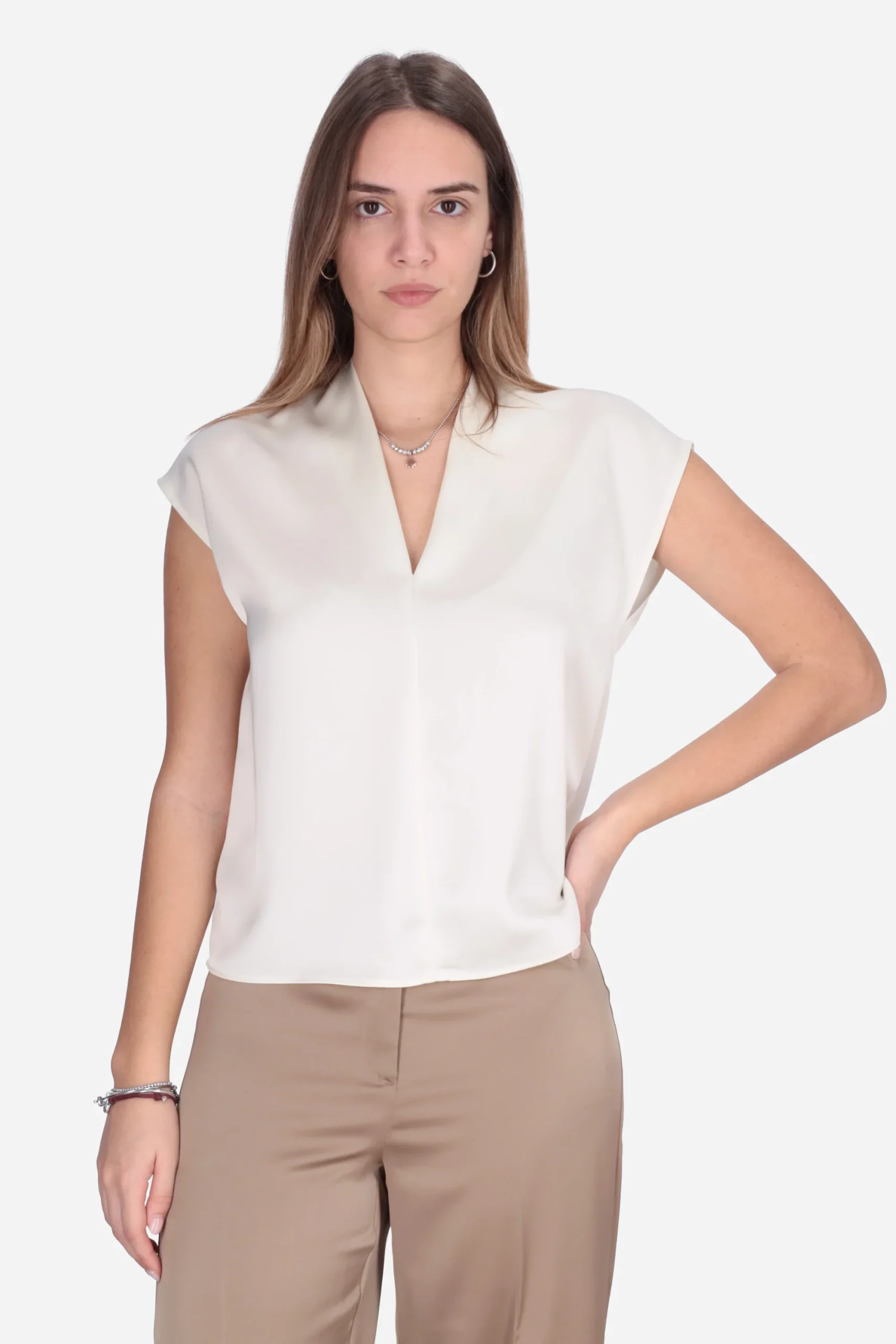 Presenta scollatura a V e maniche corte ad aletta.