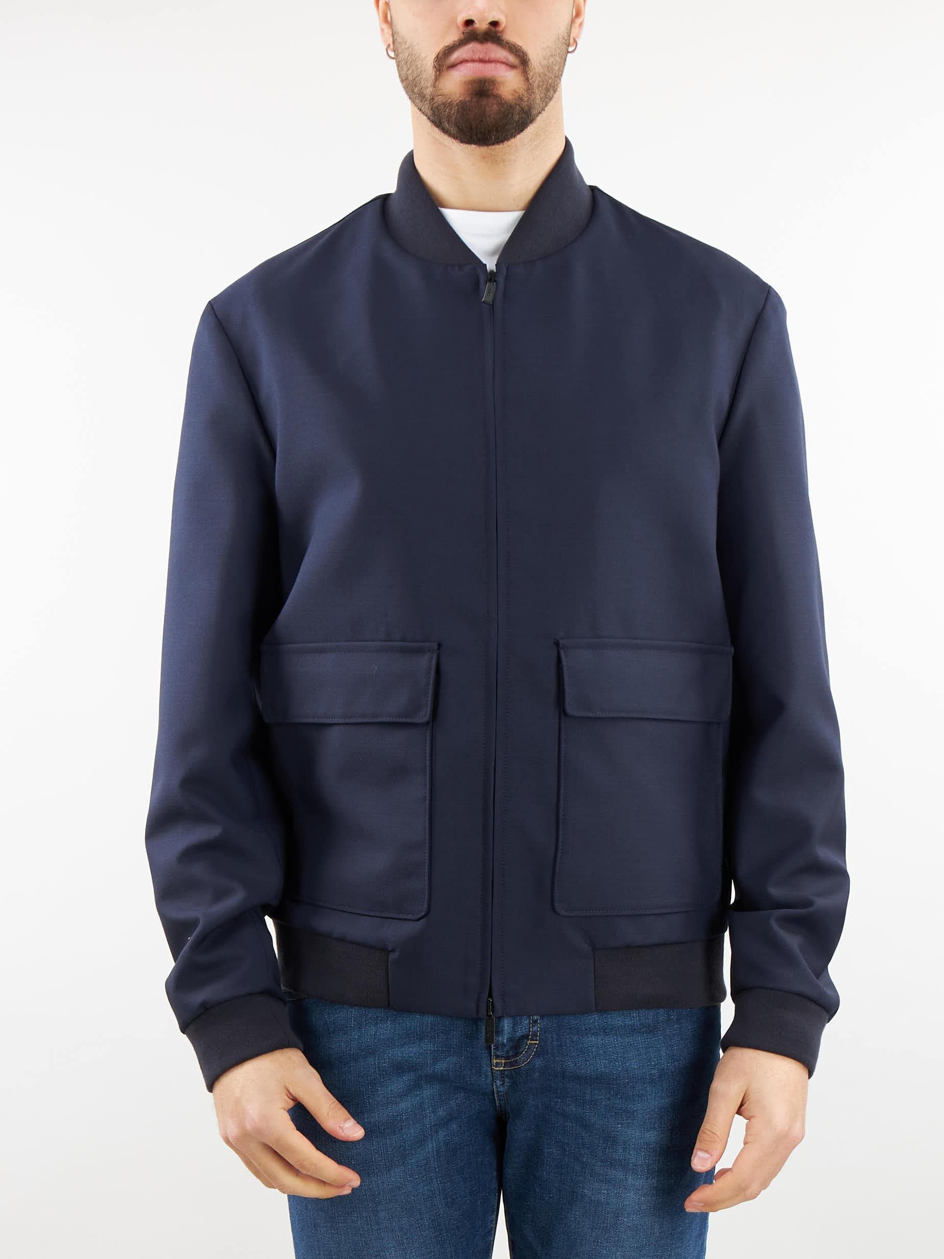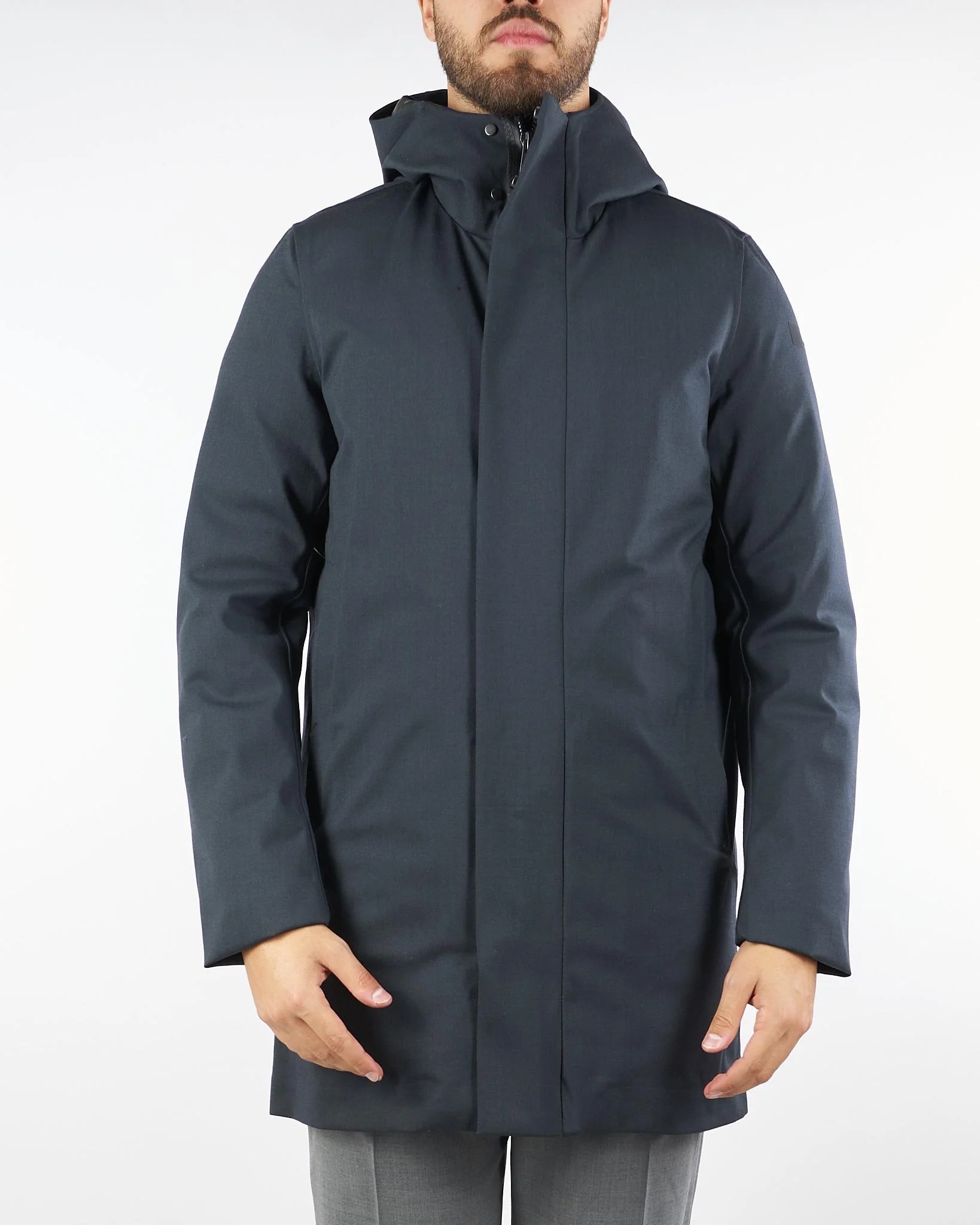 Presenta collo e polsi a camicia, tasche applicate con pattina sul davanti, chiusure con bottoni e interno foderato.