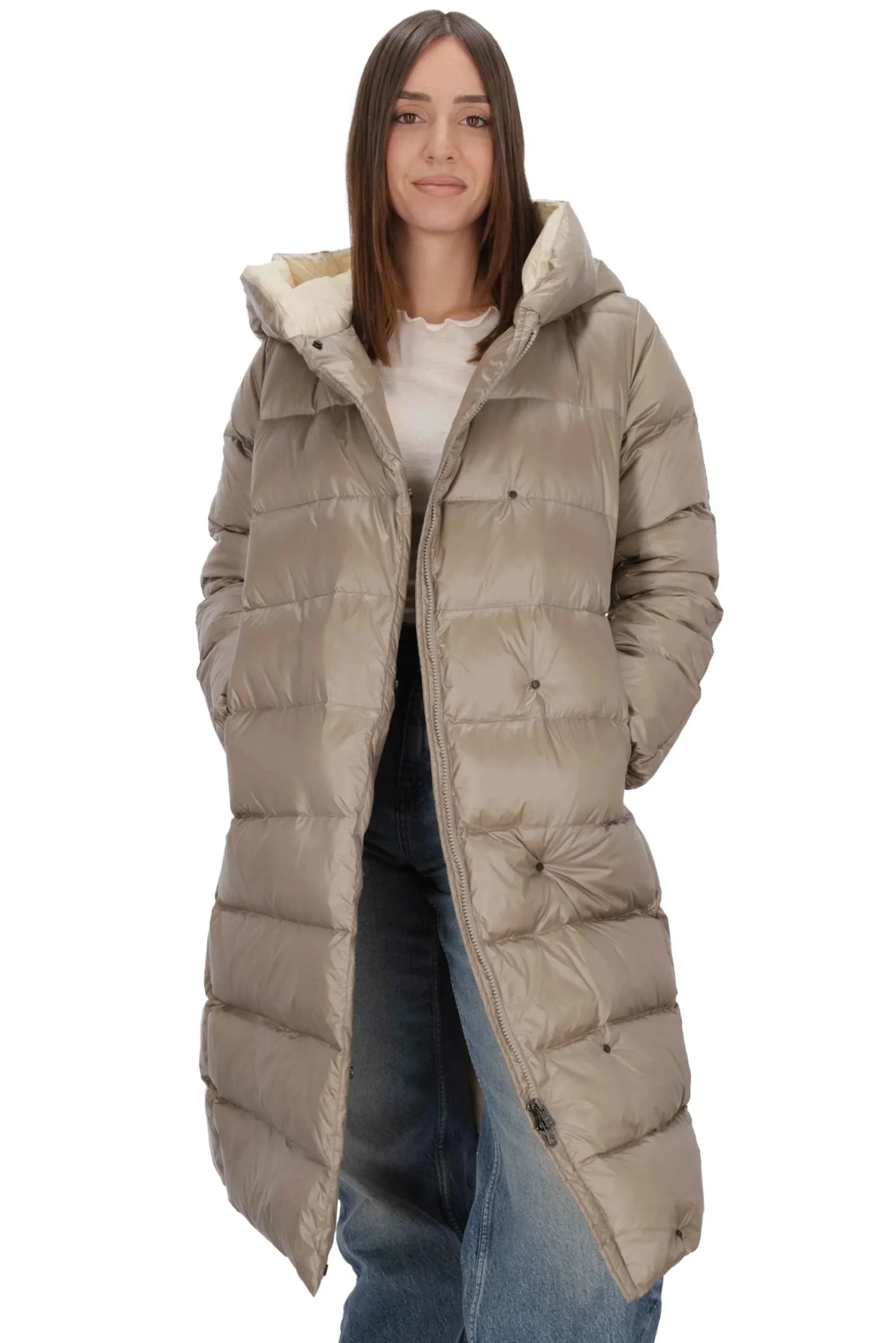 Il piumino è realizzato in tessuto tecnico opaco e trapuntato, con imbottitura in piuma.