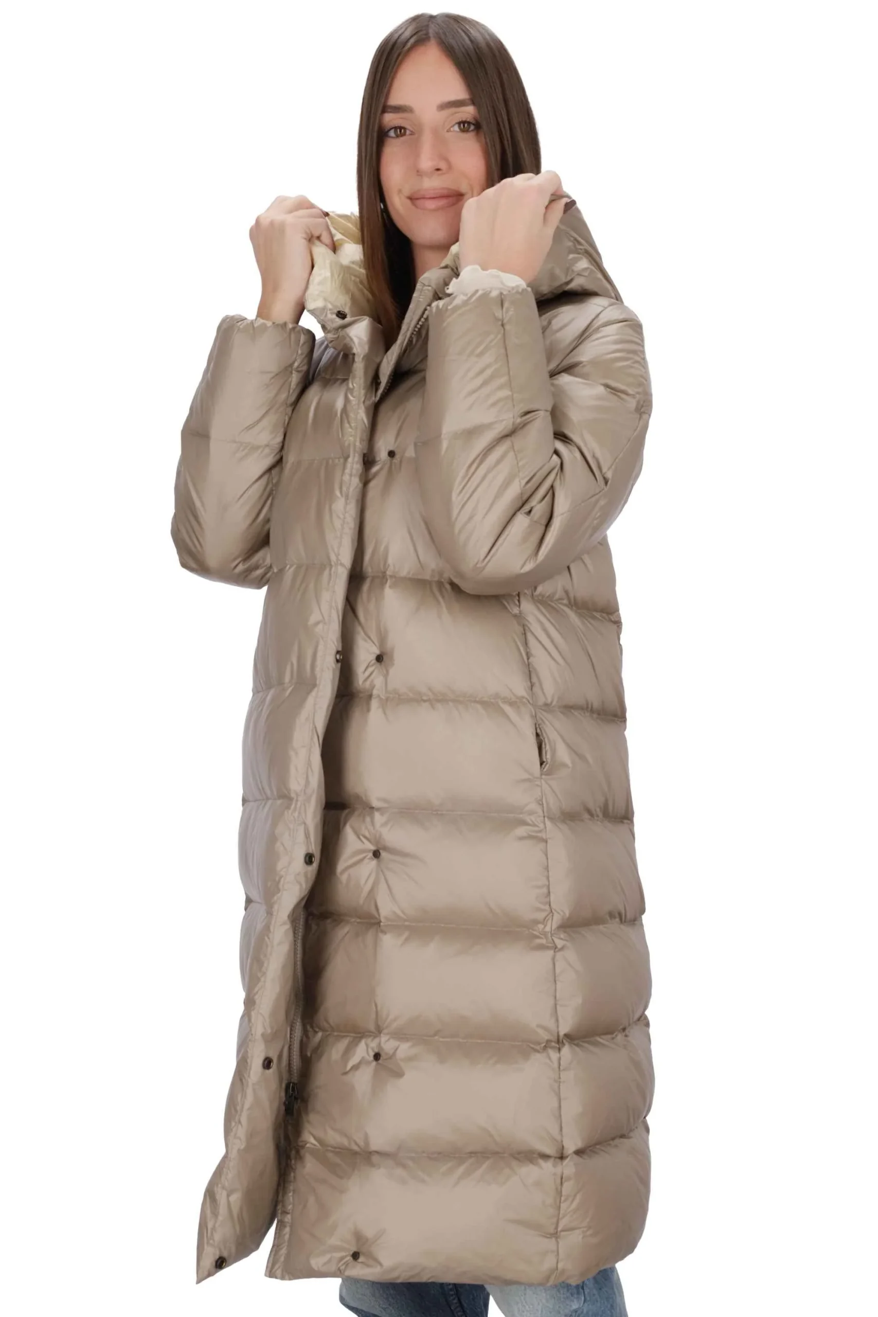 Presenta fodera interna, chiusura con zip doppio cursore e bottoni automatici, collo alto con cappuccio e tasche a filetto con bottone.