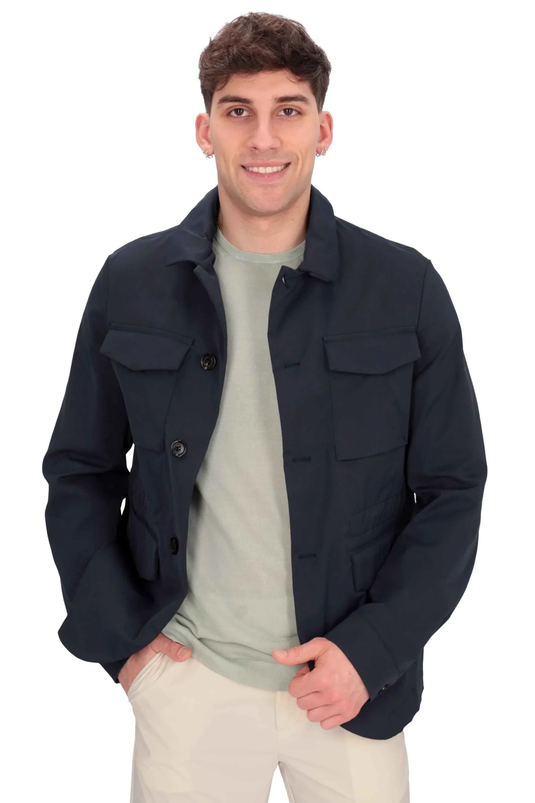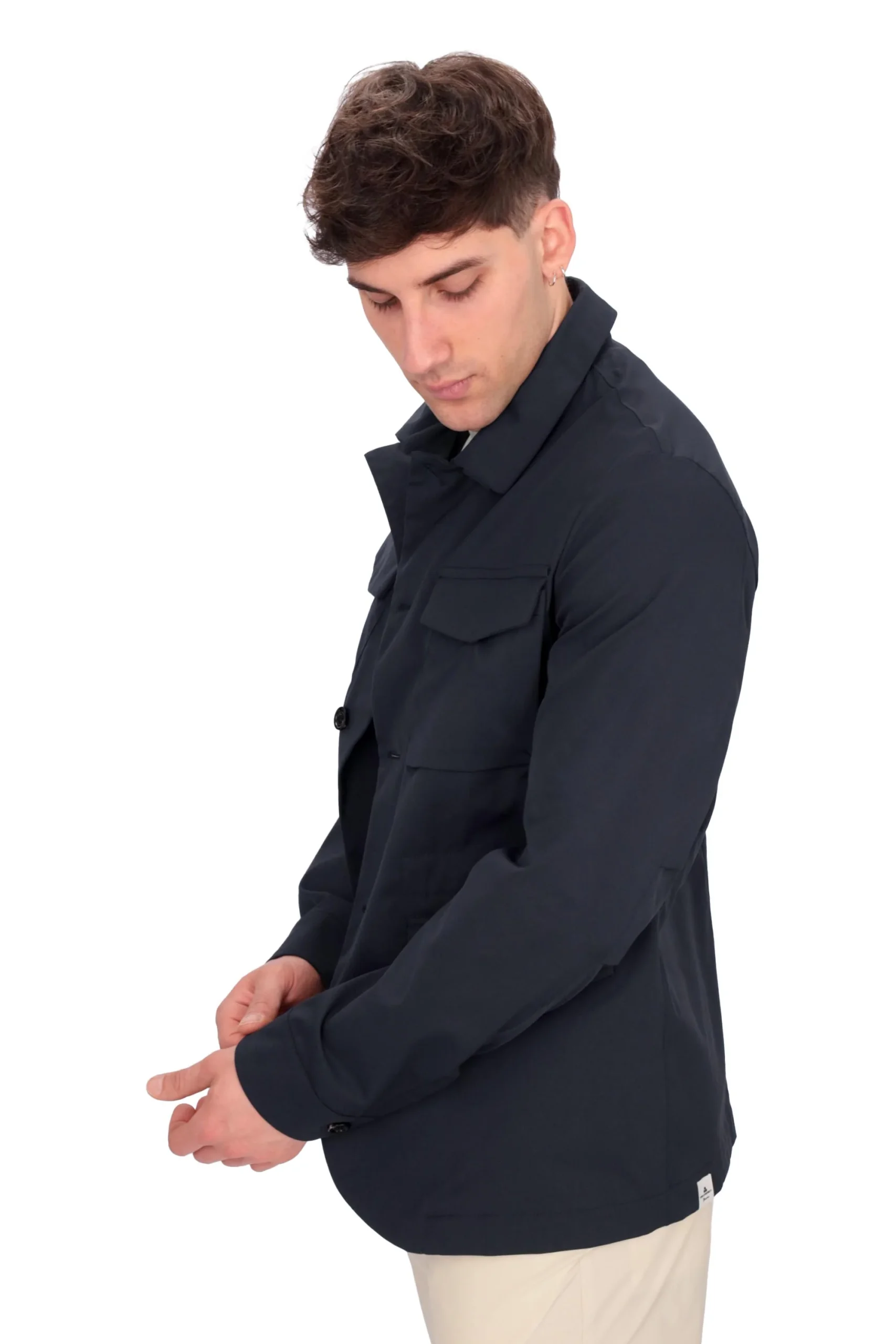 Presenta maniche lunghe con polsini, monopetto con doppio bottone, patte sui fianchi e taschini sul petto.