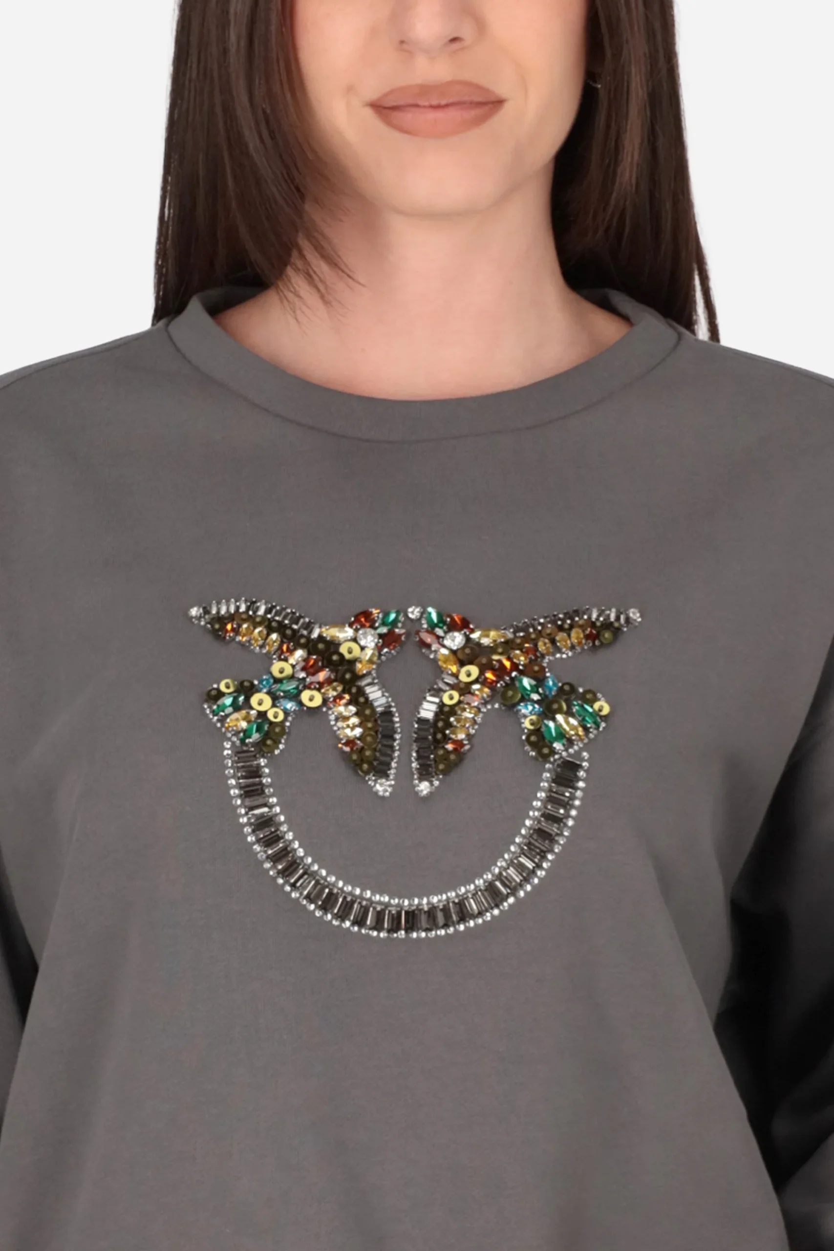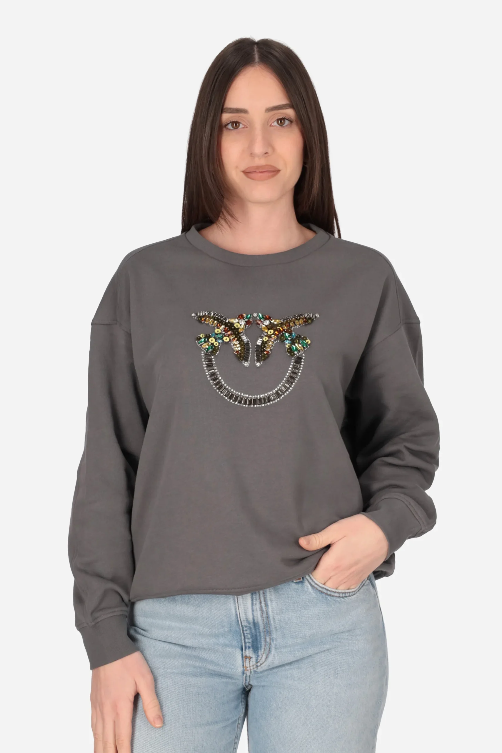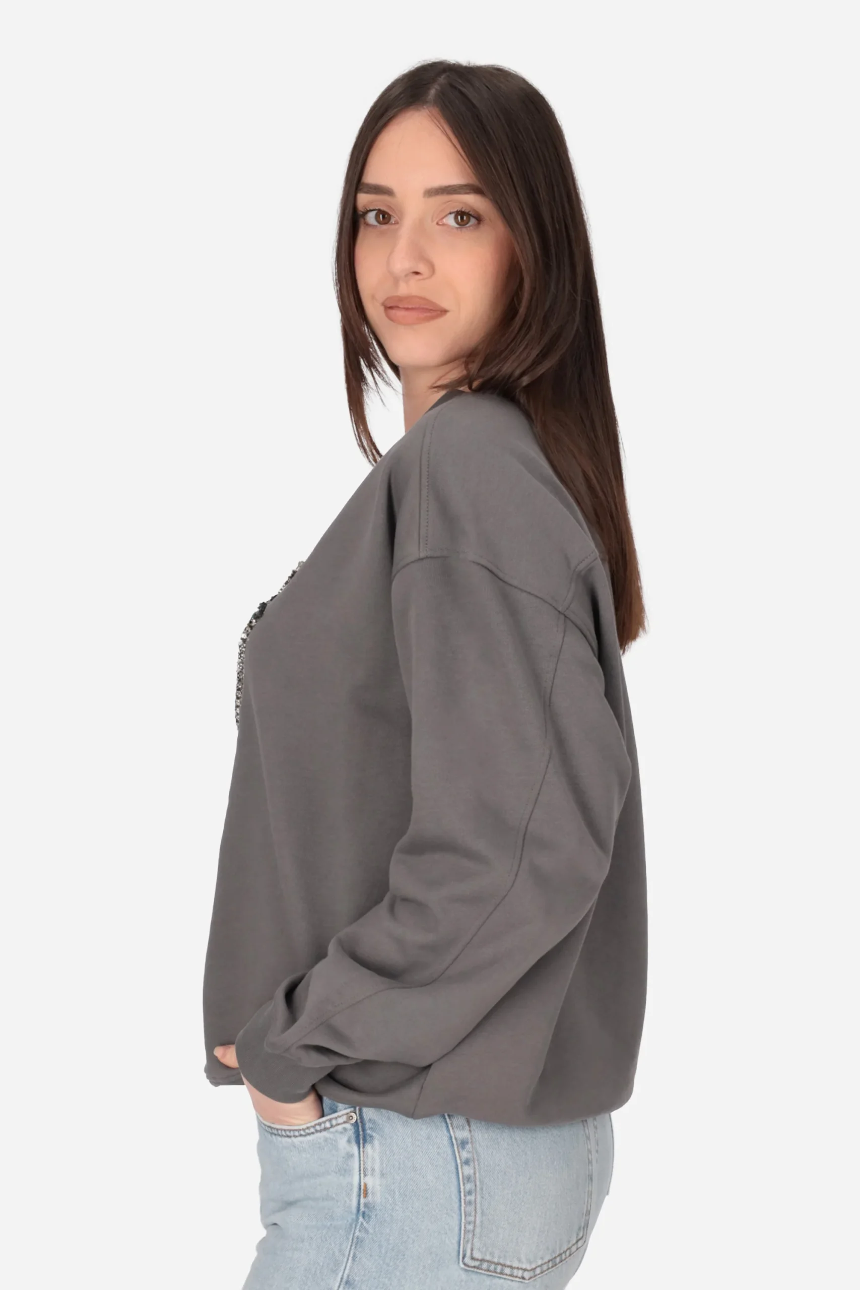 La felpa è realizzata in cotone, personalizzata con logo davanti con applicazioni di strass.