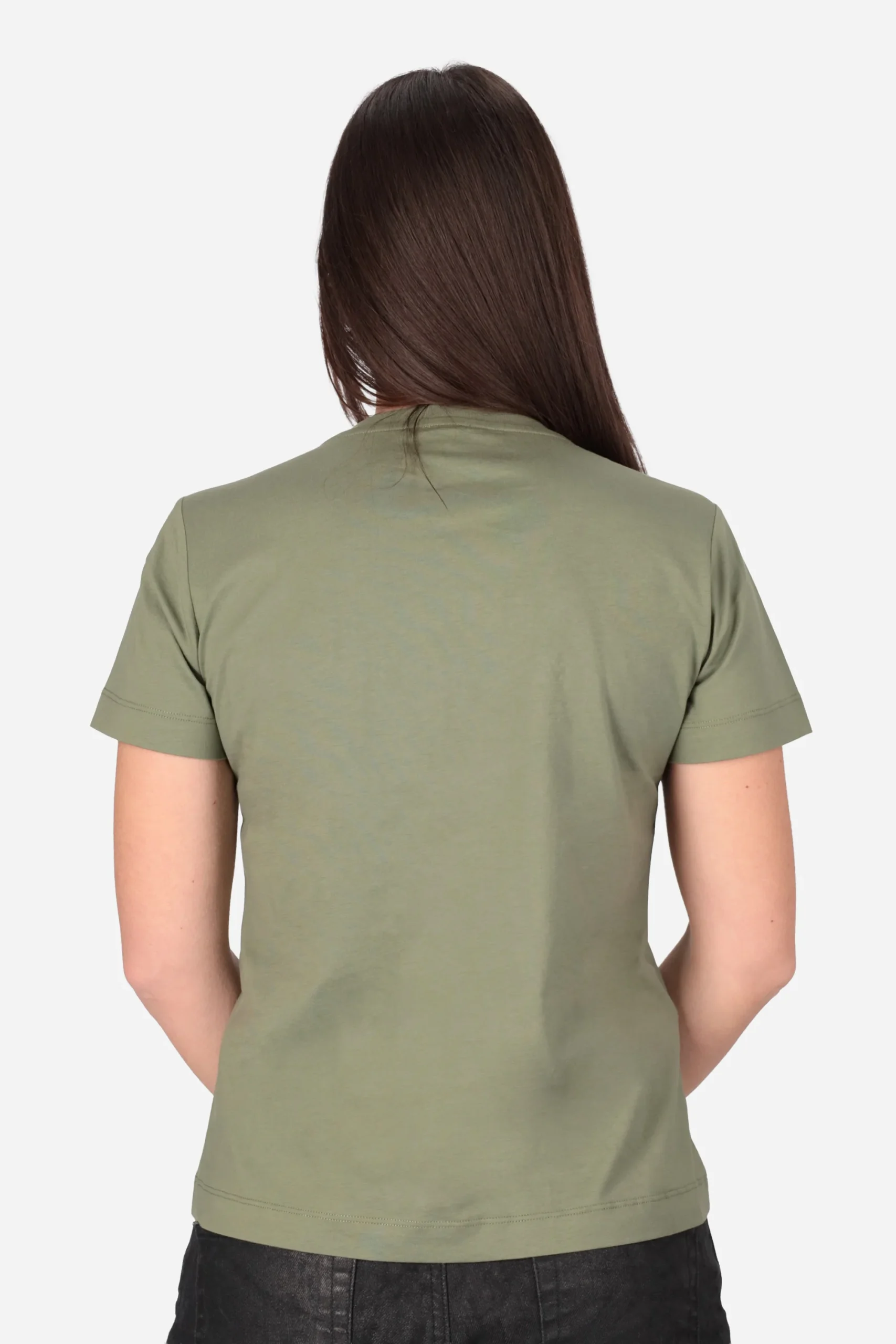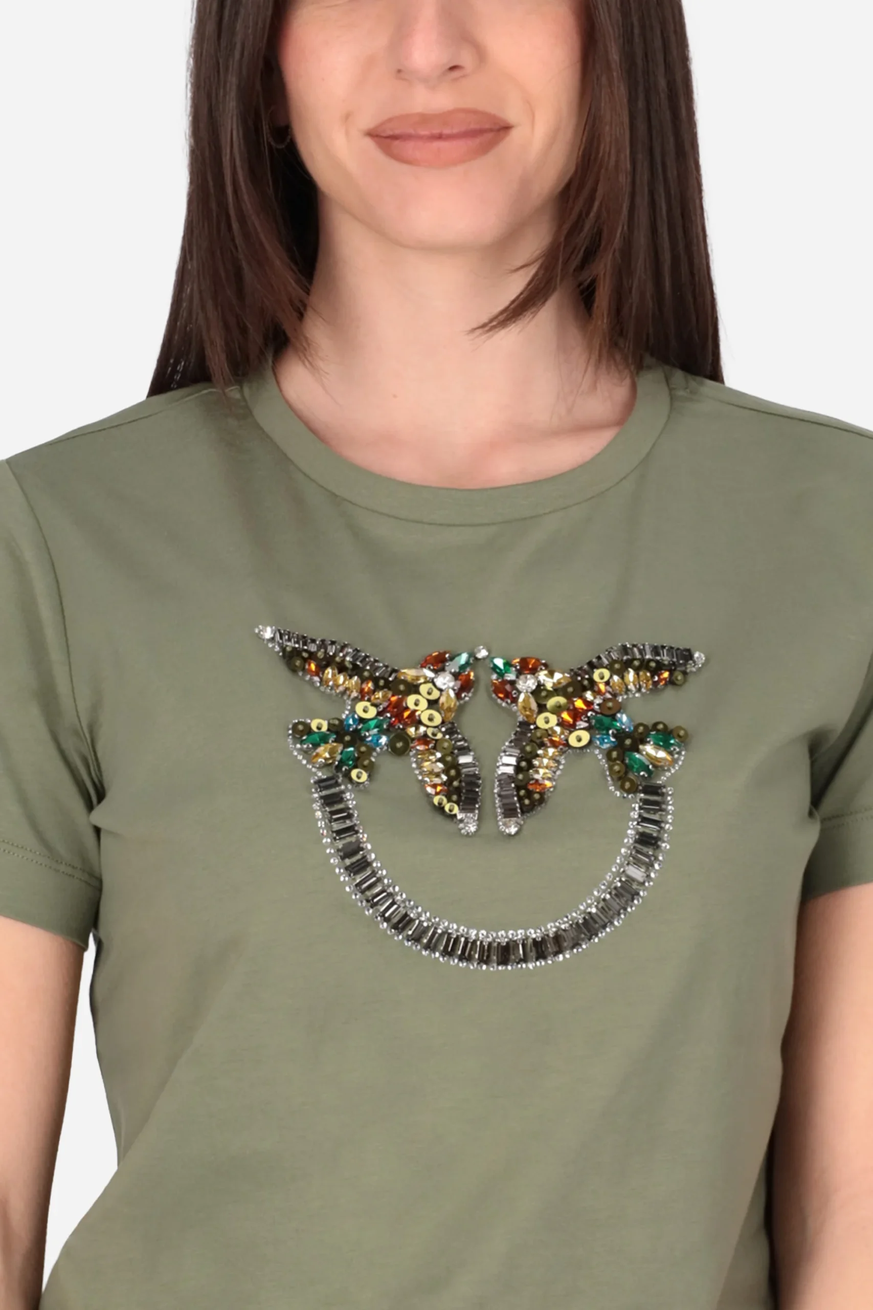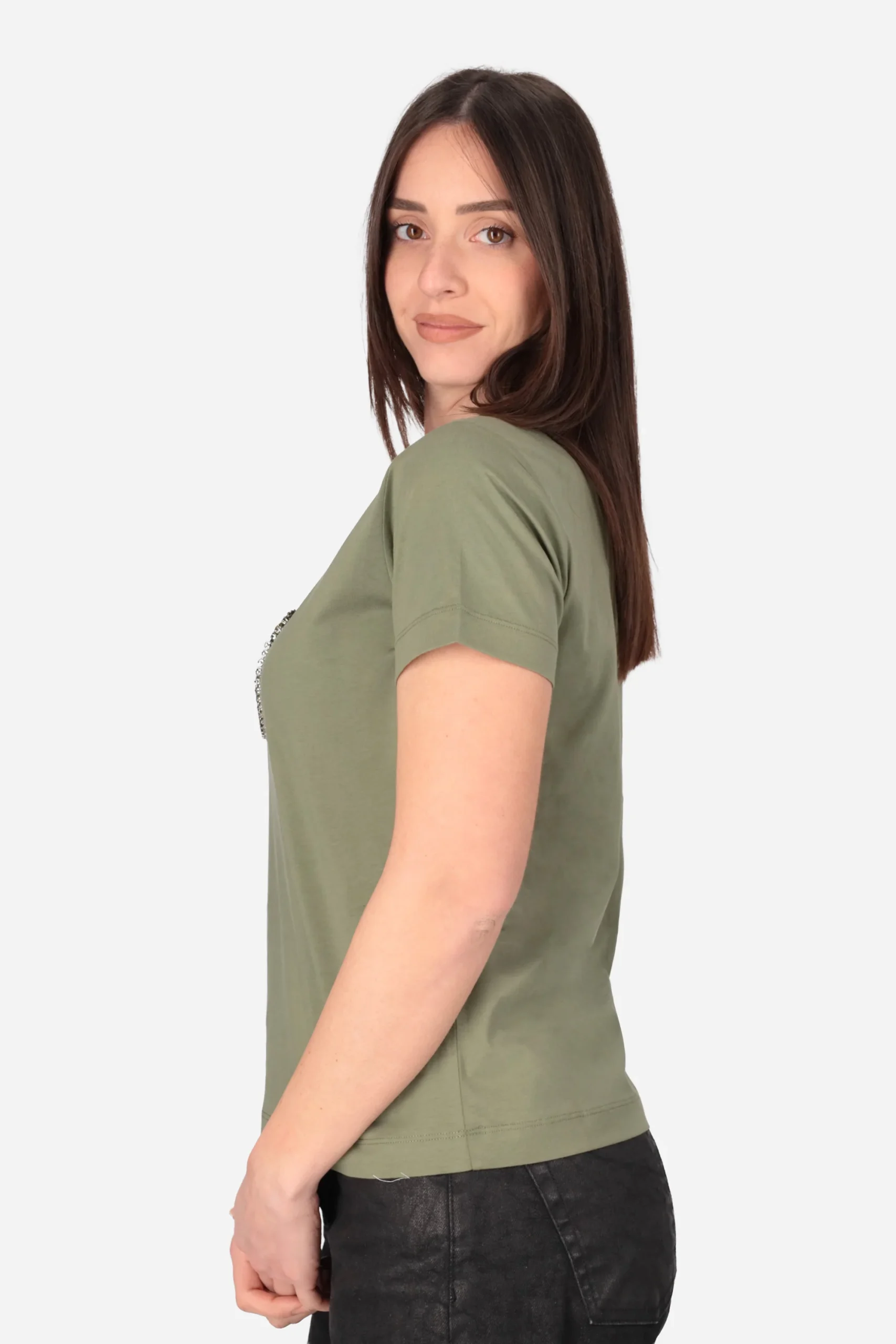 La T-shirt è realizzata in cotone, personalizzata con logo davanti con applicazioni di strass.