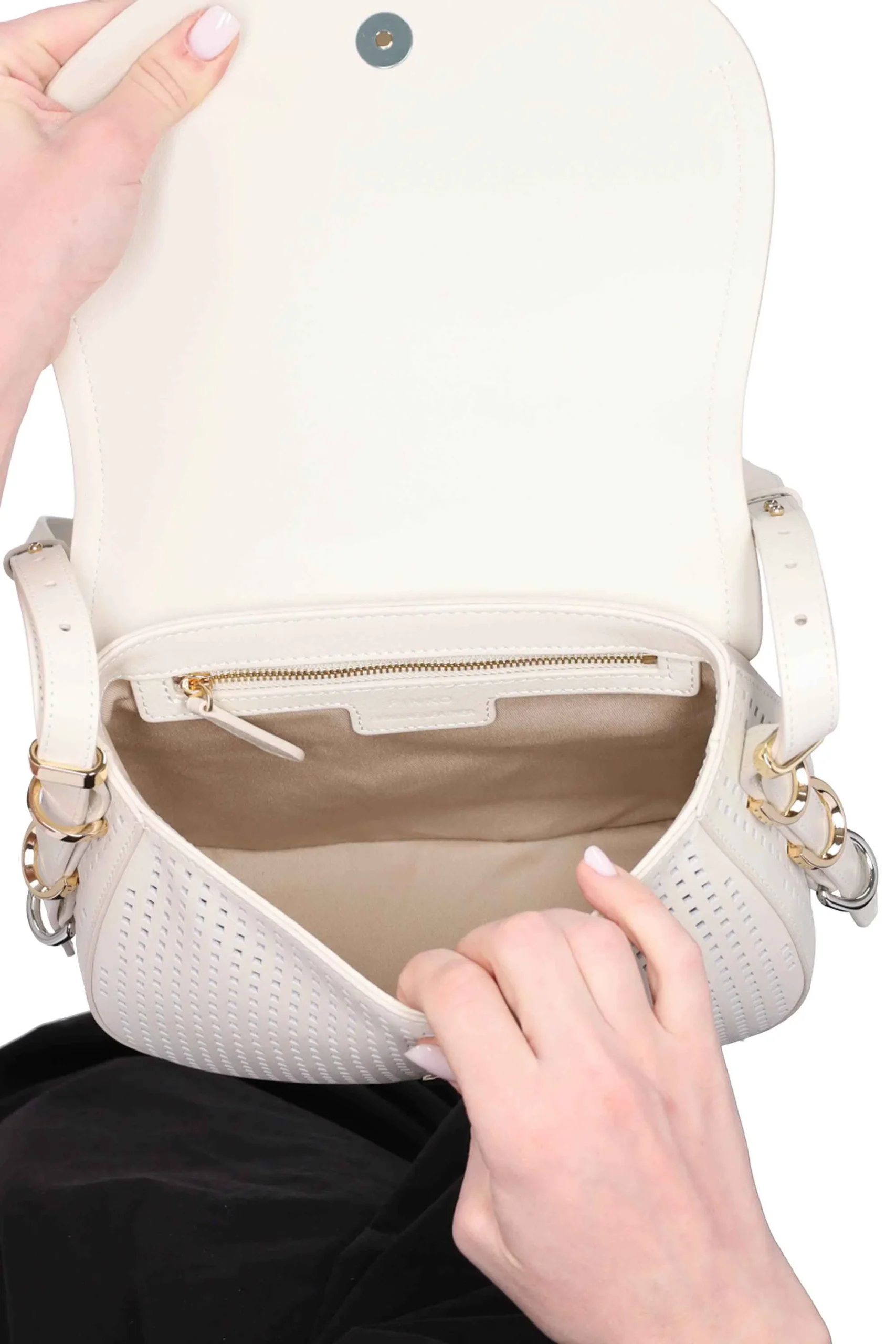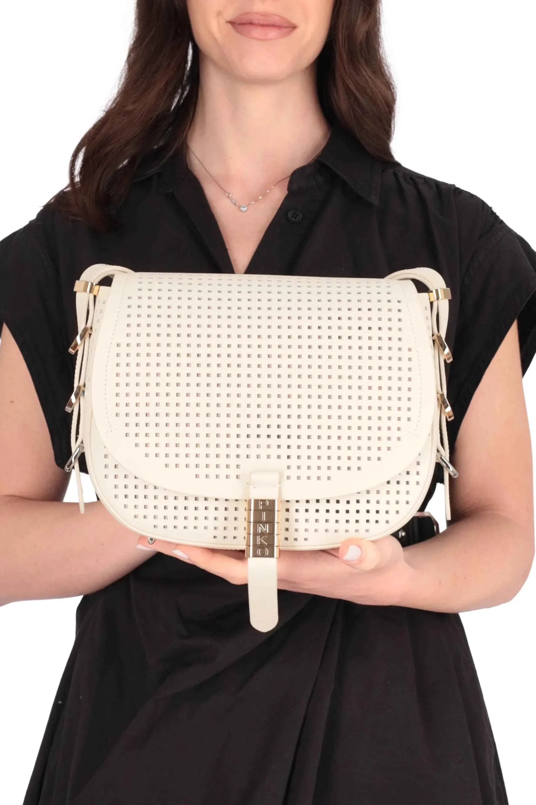 La borsa è realizzata in pelle con effetto pois cut-out all over.