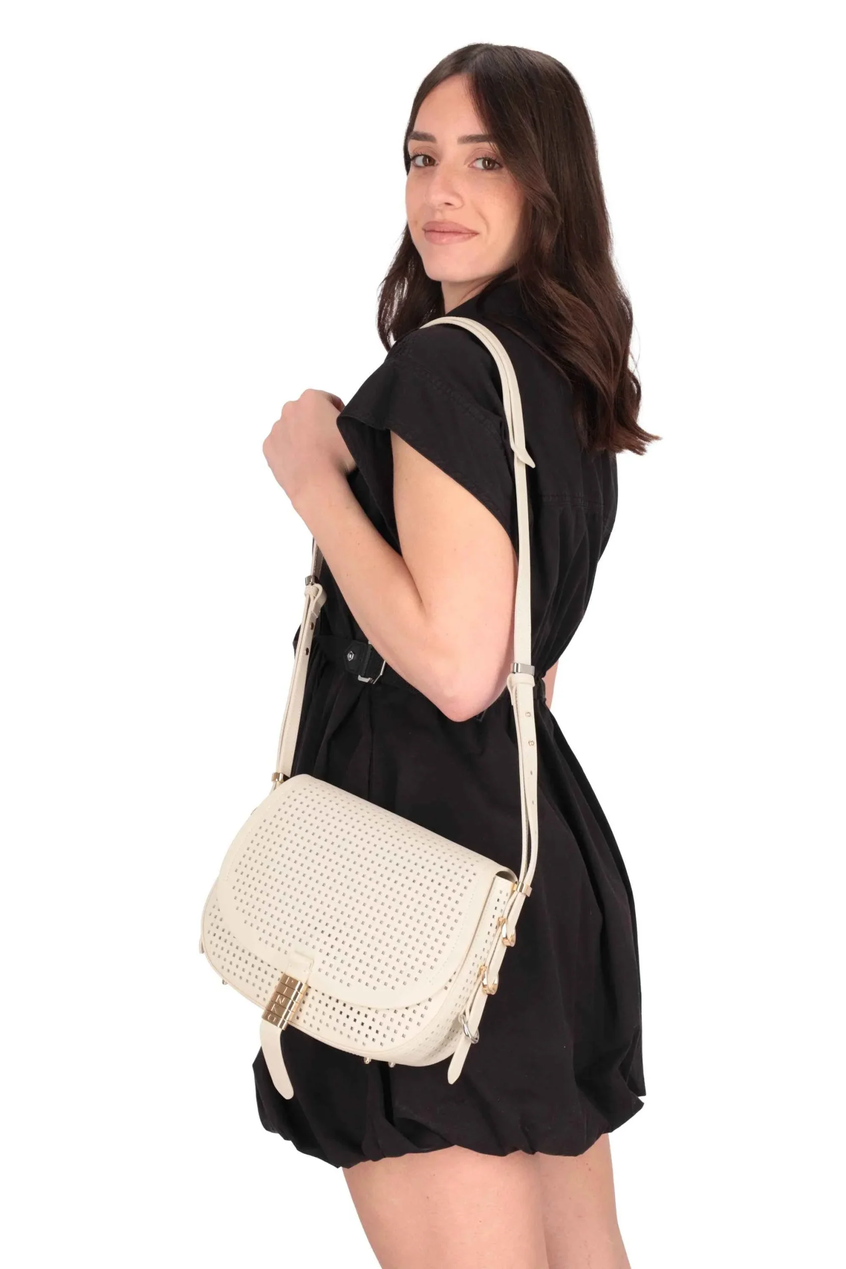 Presenta chiusura a patta con bottone, dettagli in metallo e tracolla regolabile.