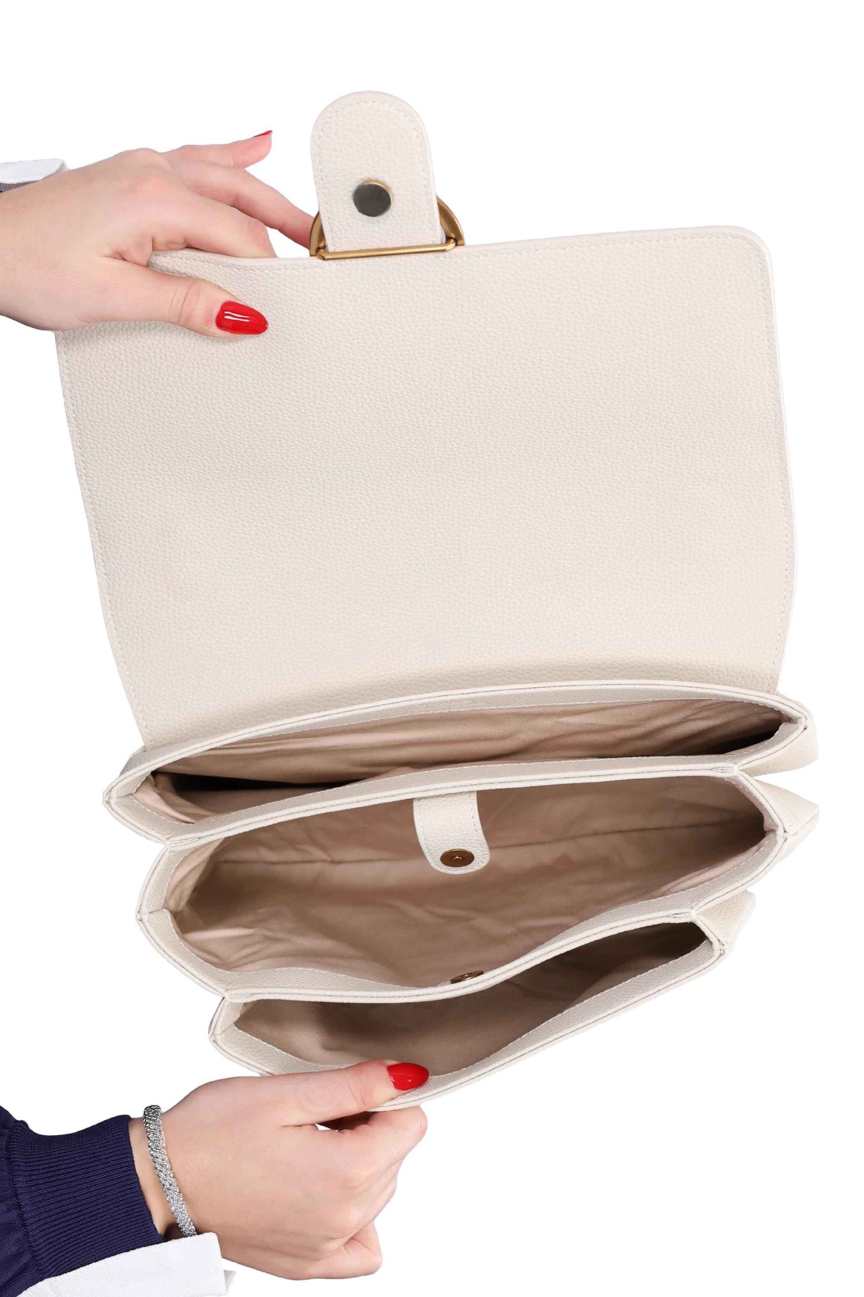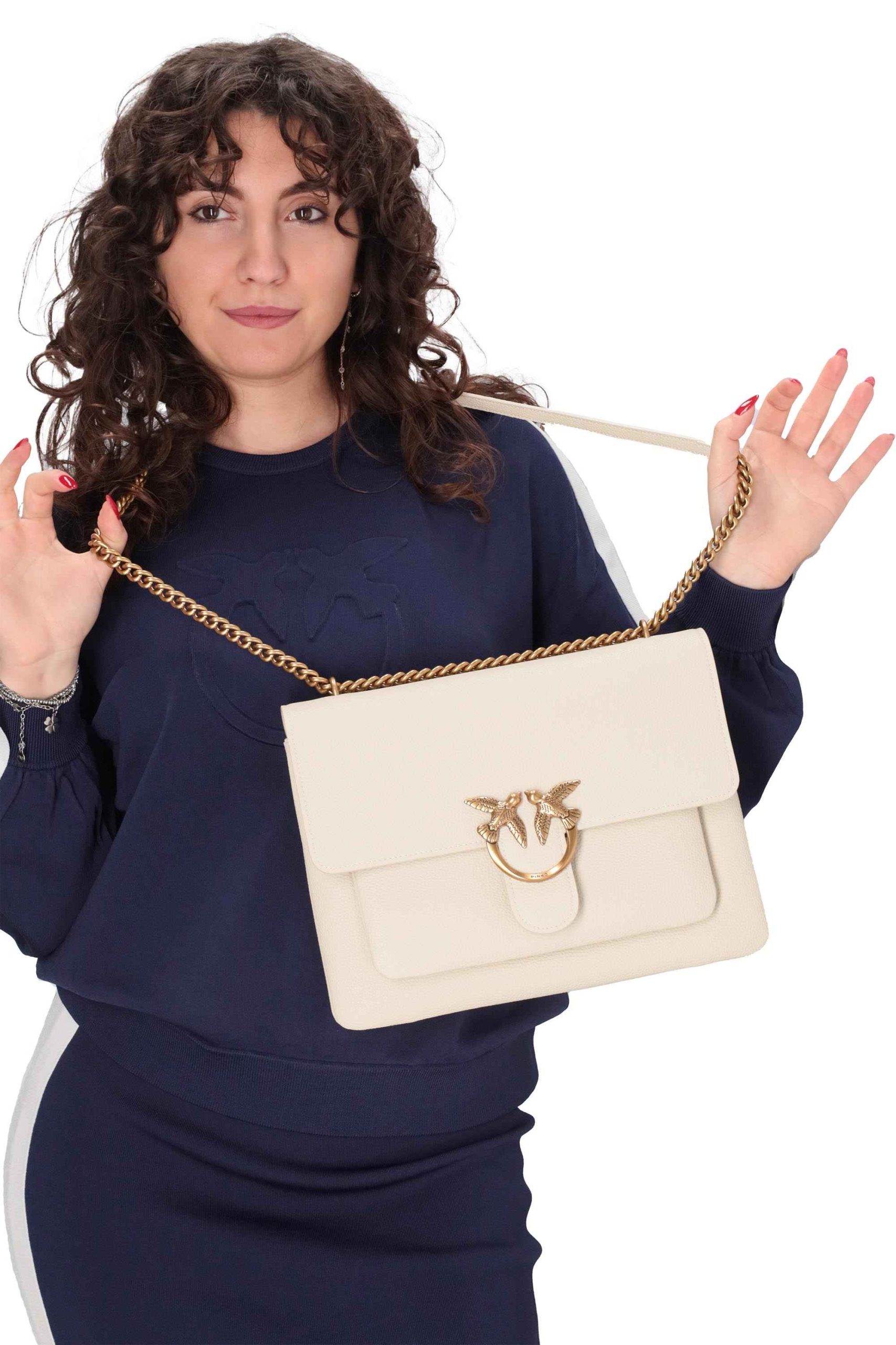 Presenta chiusura a bocciolo e tracolla a catena.