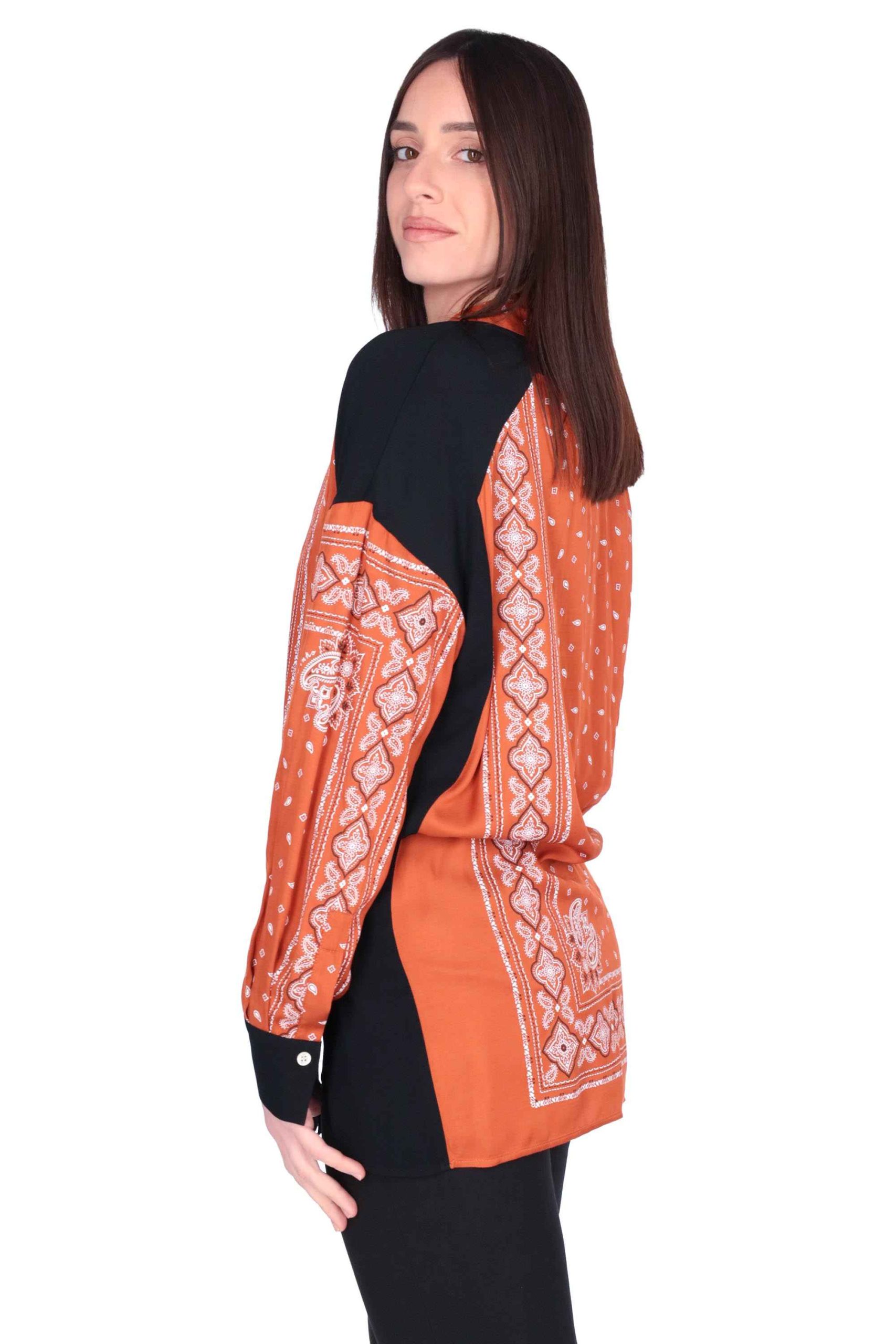La camicia è realizzata in tessuto twill di viscosa con stampa bandana e inserti in leggera georgette di viscosa monocolore.