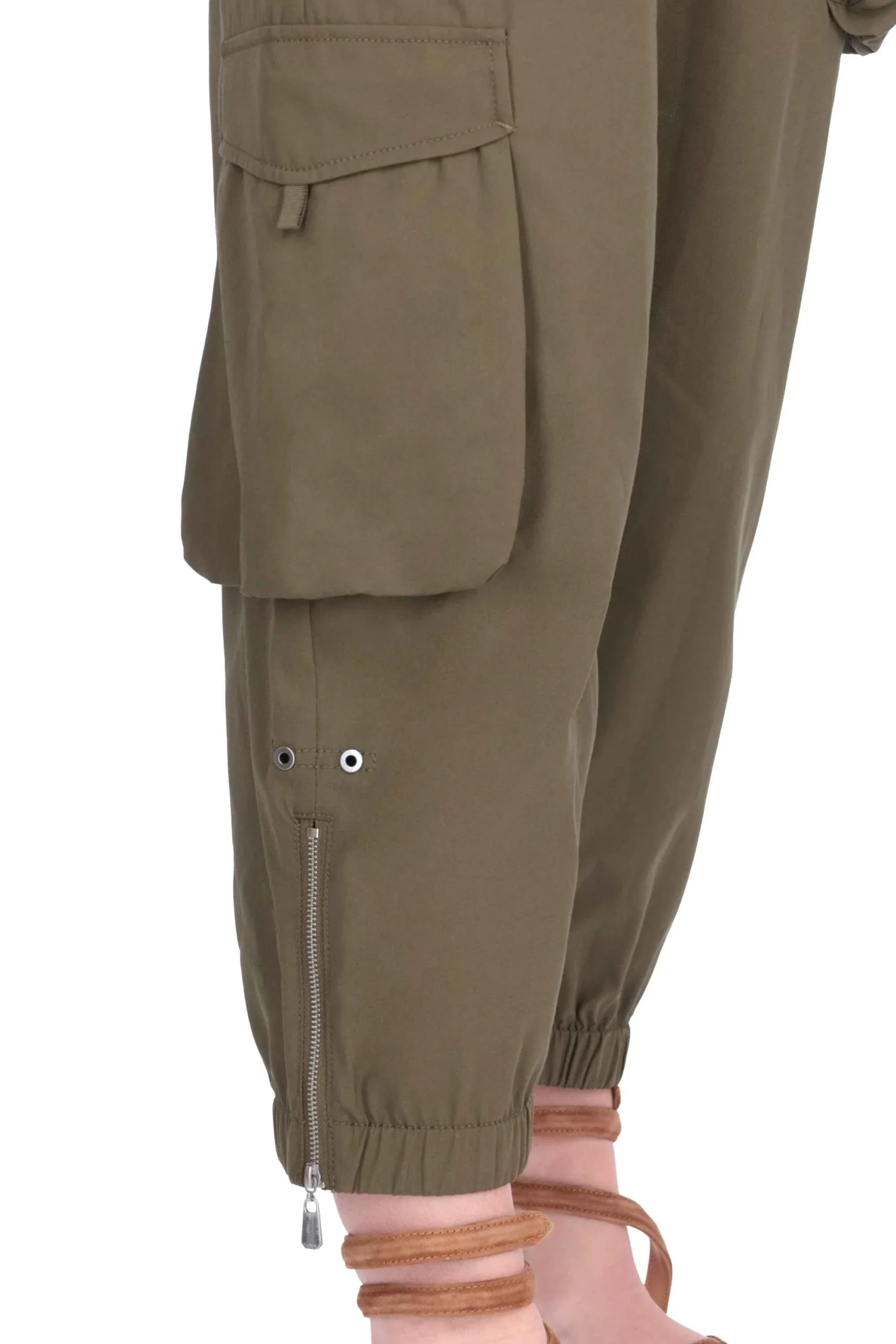 Sono completati da maxi tasche sui fianchi, tasca grande a soffietto su una gamba, elastico e zip a fondo capo, chiusura con zip e doppio bottone automatico in metallo.