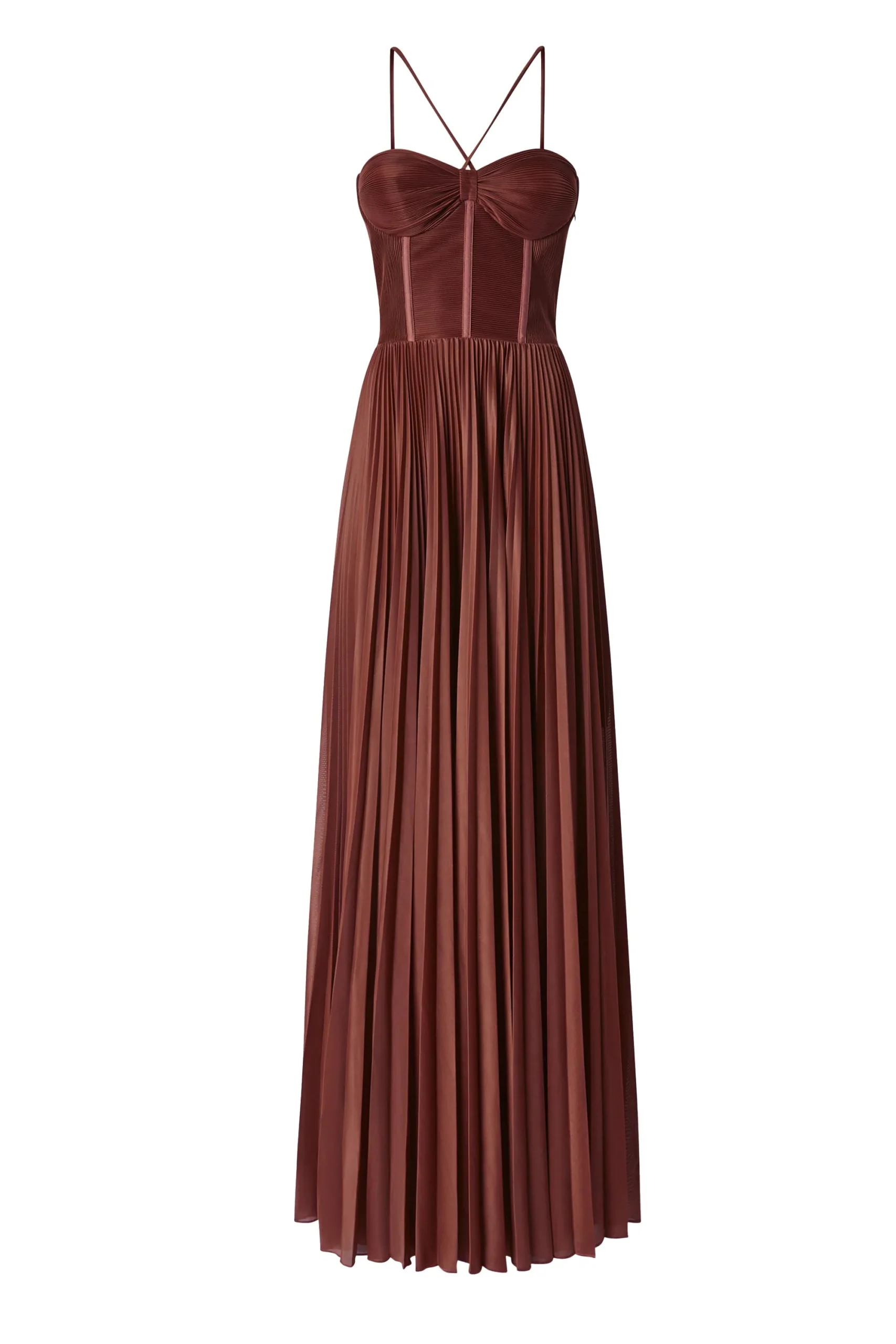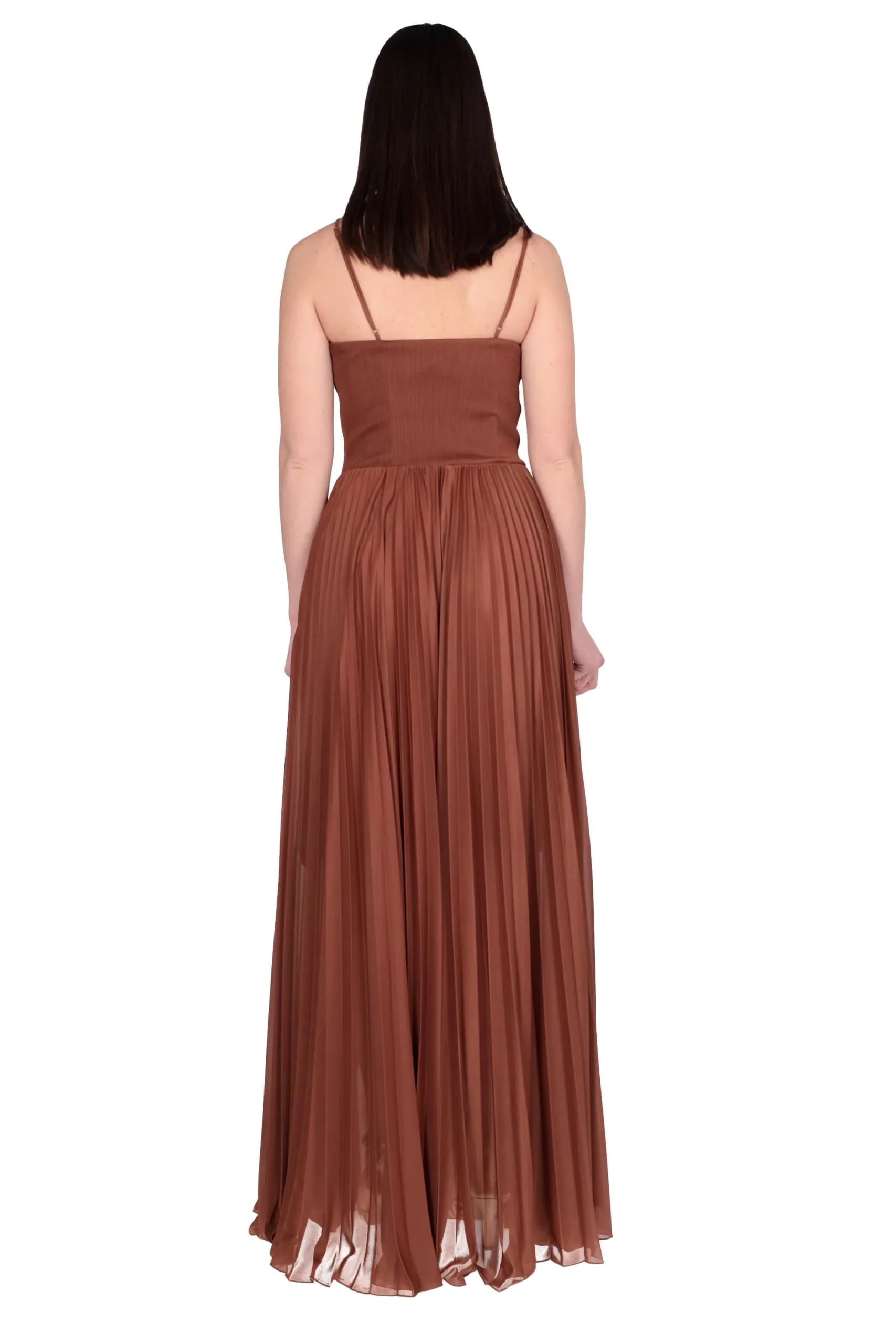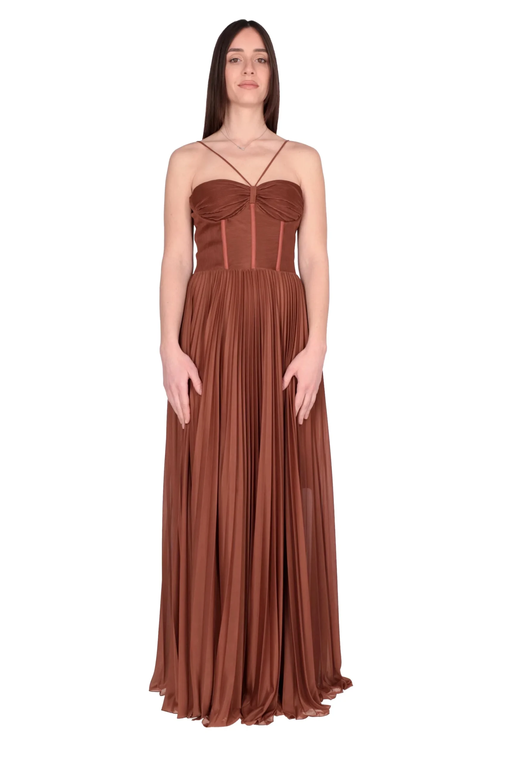 E’ composto da un bustino dal taglio alto, con coppe preformate e spalline sottili regolabili incrociate e da una gonna lunga con volume ampio con pieghe plissè.