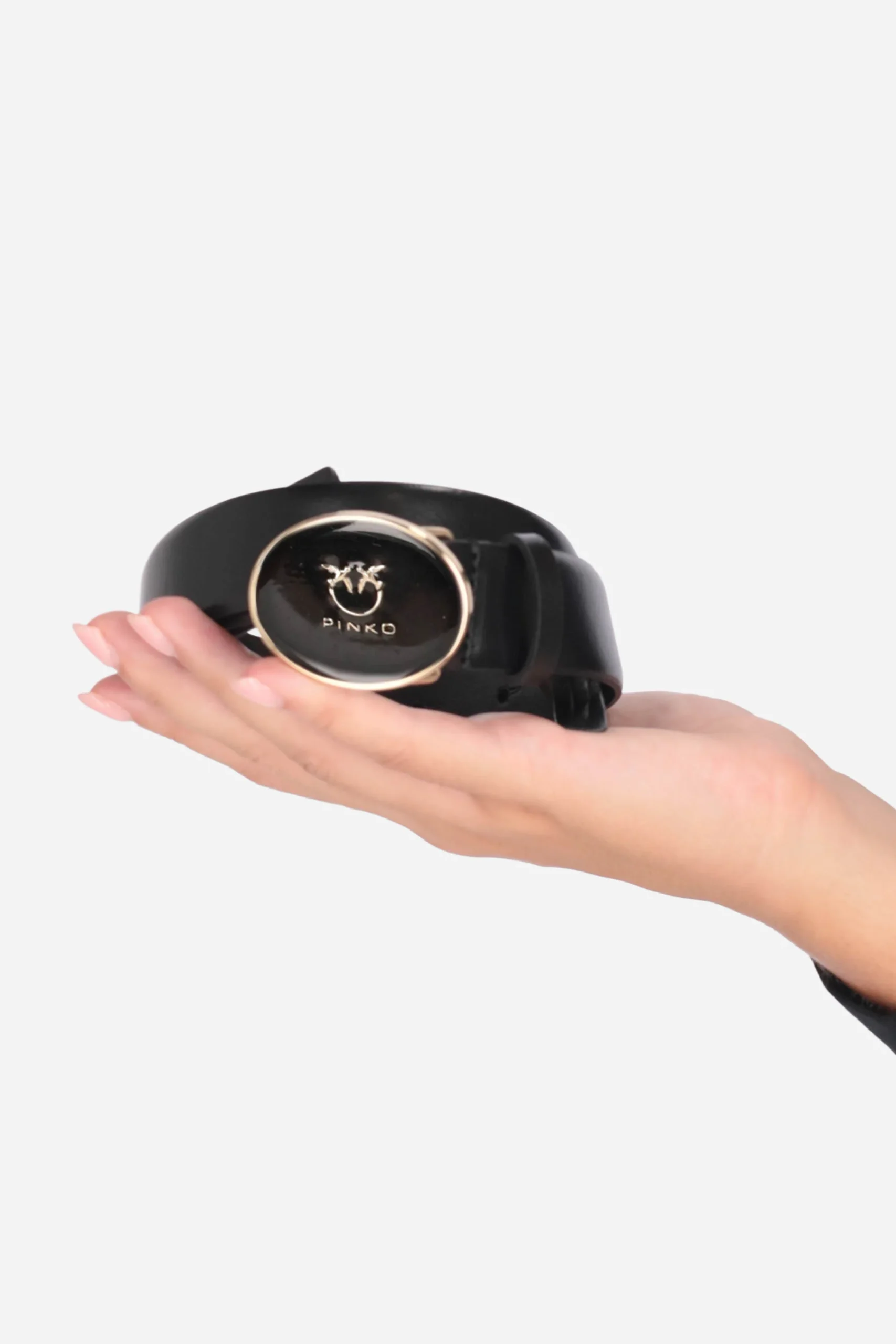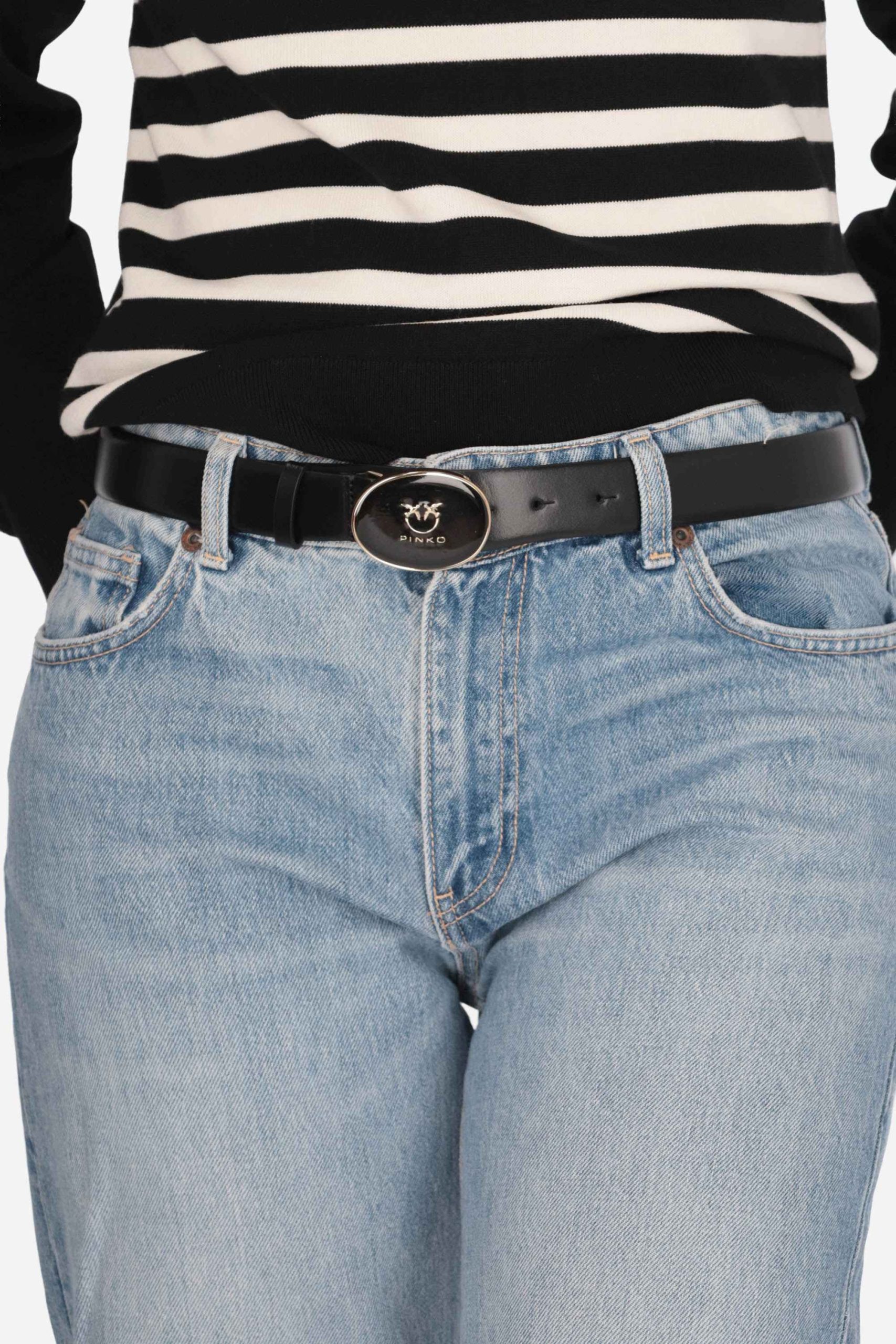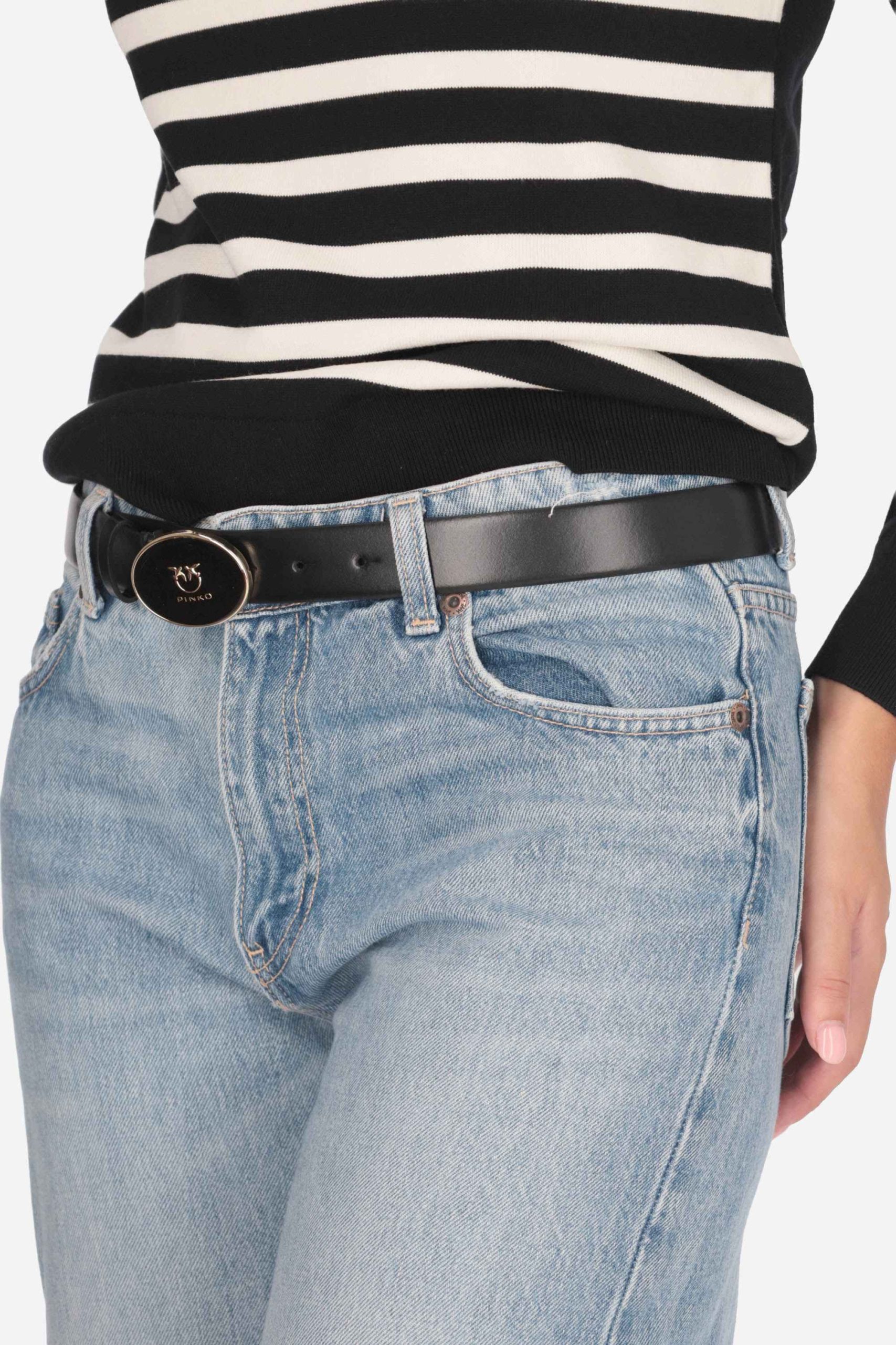 La cintura è realizzata in pelle di vitello con fibbia regolabile con logo metallizzato.
