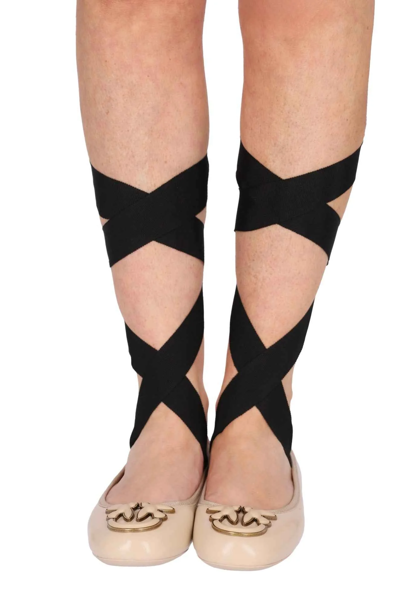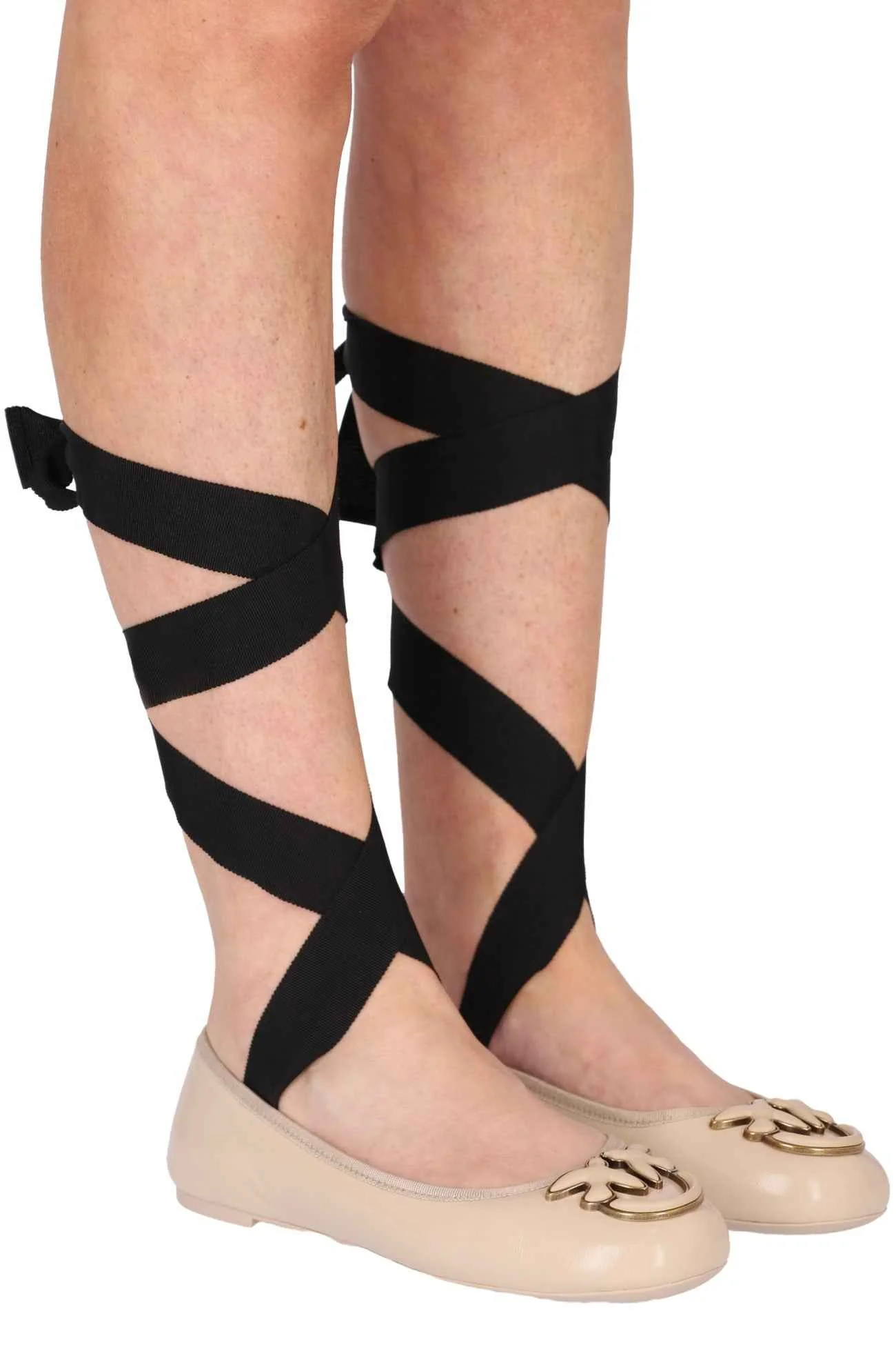 Ballerina in nappa, tacco alto 1cm, suola in gomma, con fasce da poter avvolgere ai polpacci, dettaglio sul davanti, soletta in pelle.