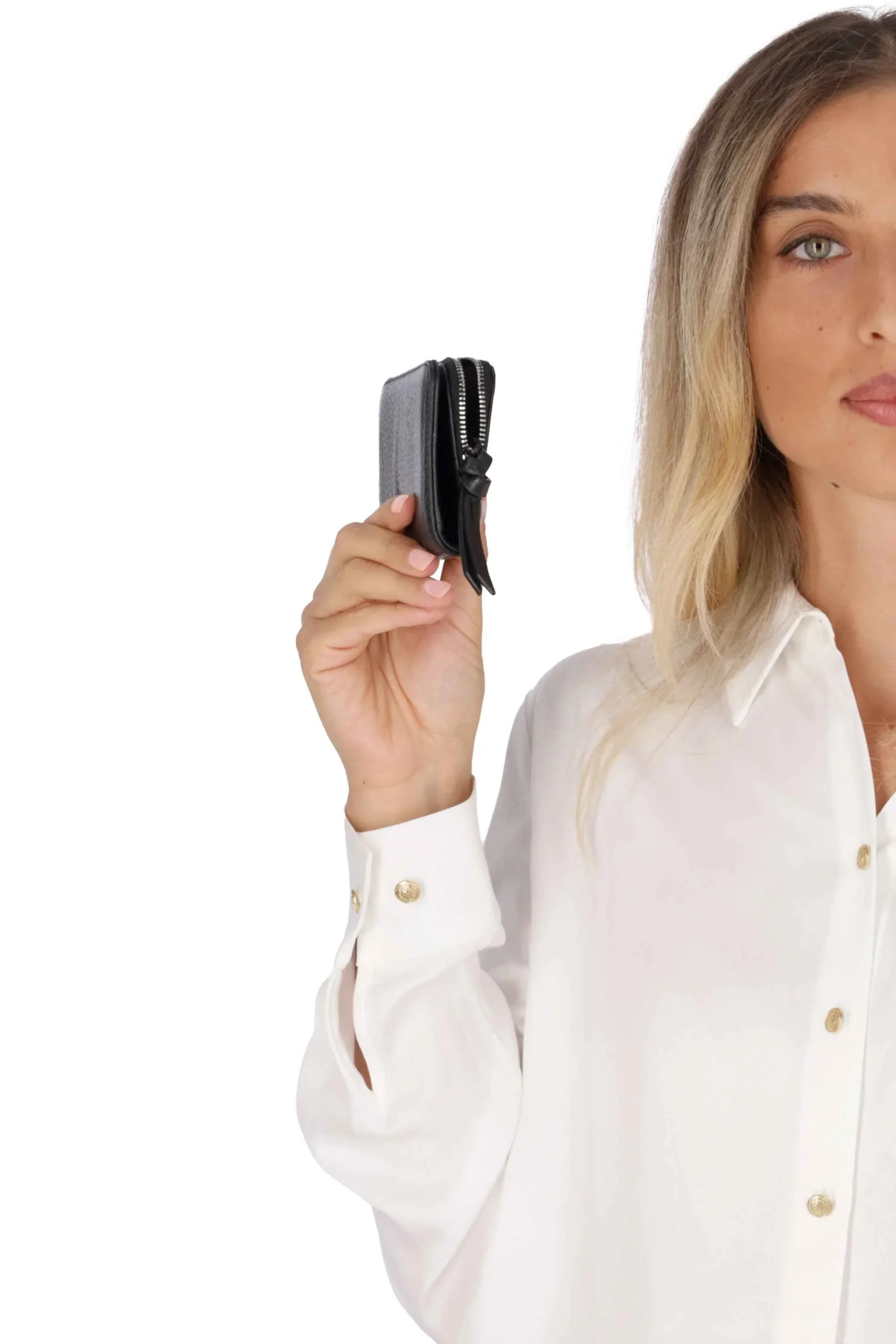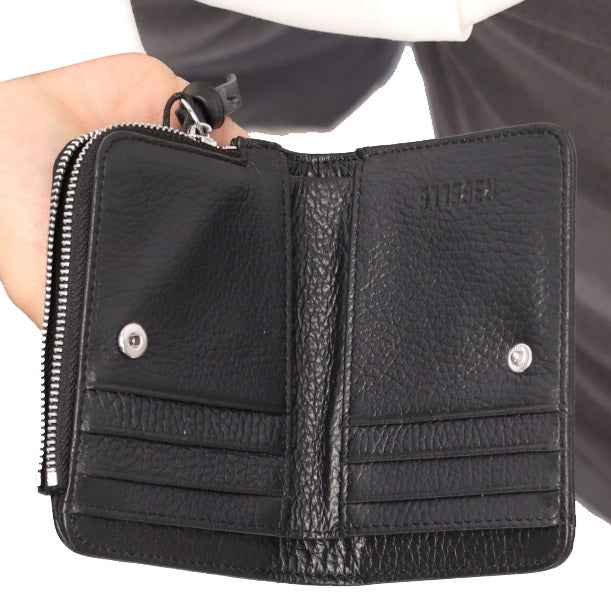 Presenta una chiusura con bottone a pressione, una tasca esterna con zip, divisori per carte di credito e banconote.