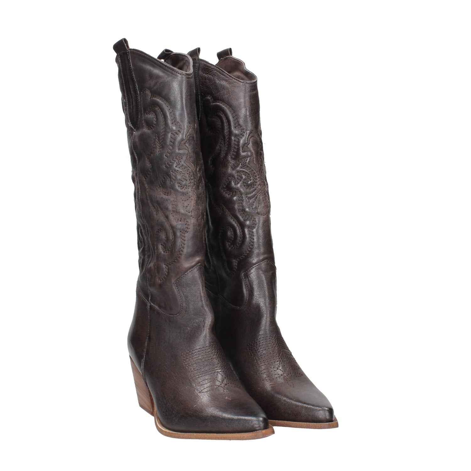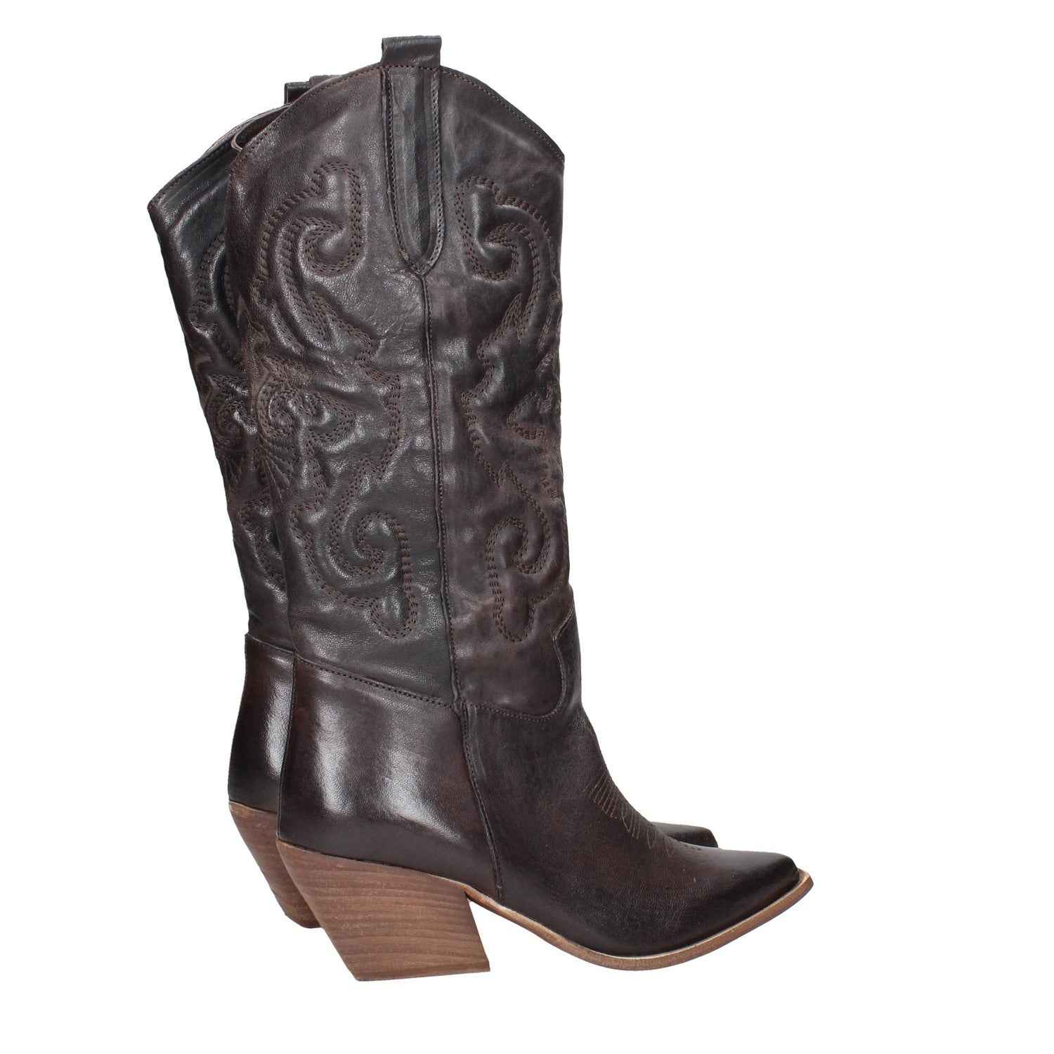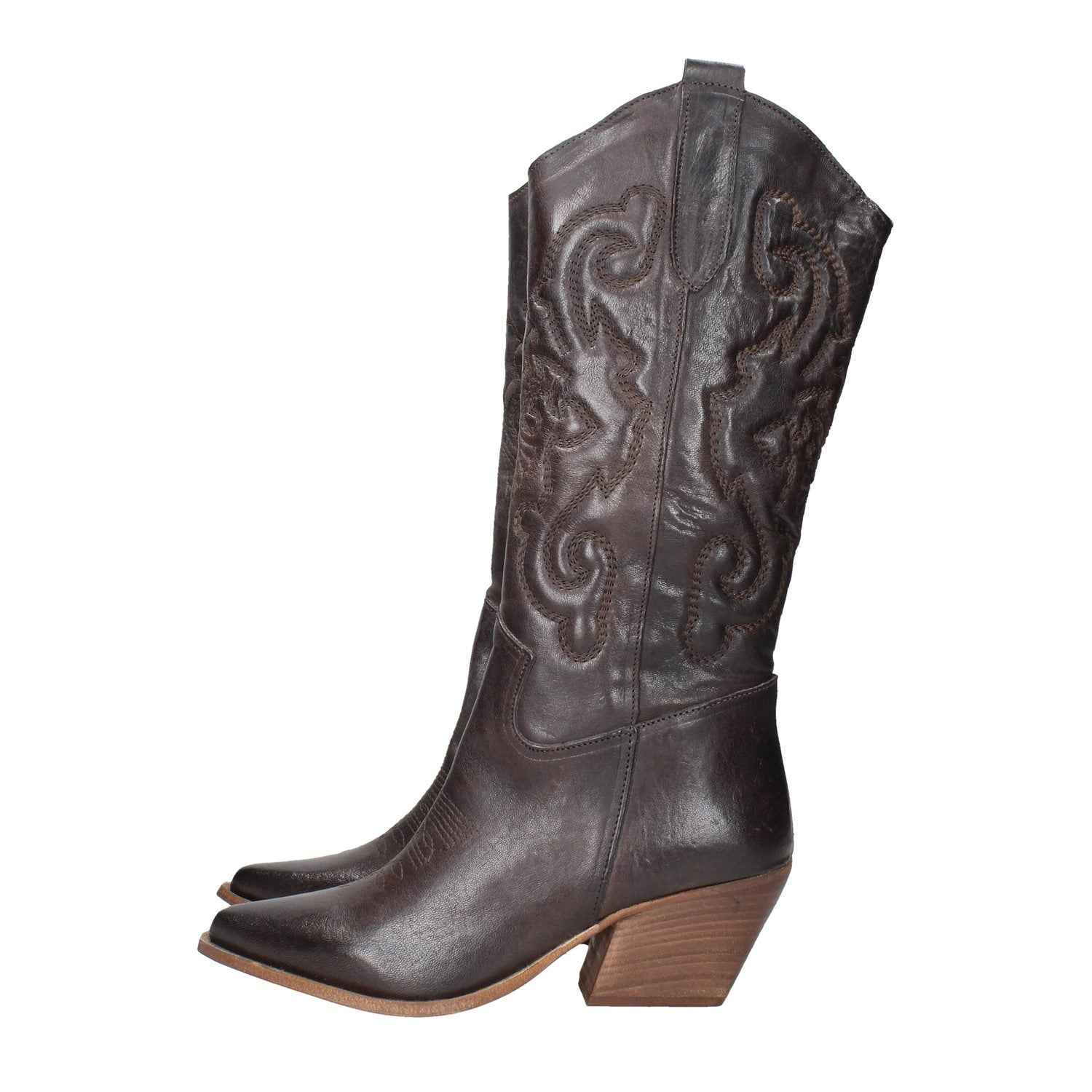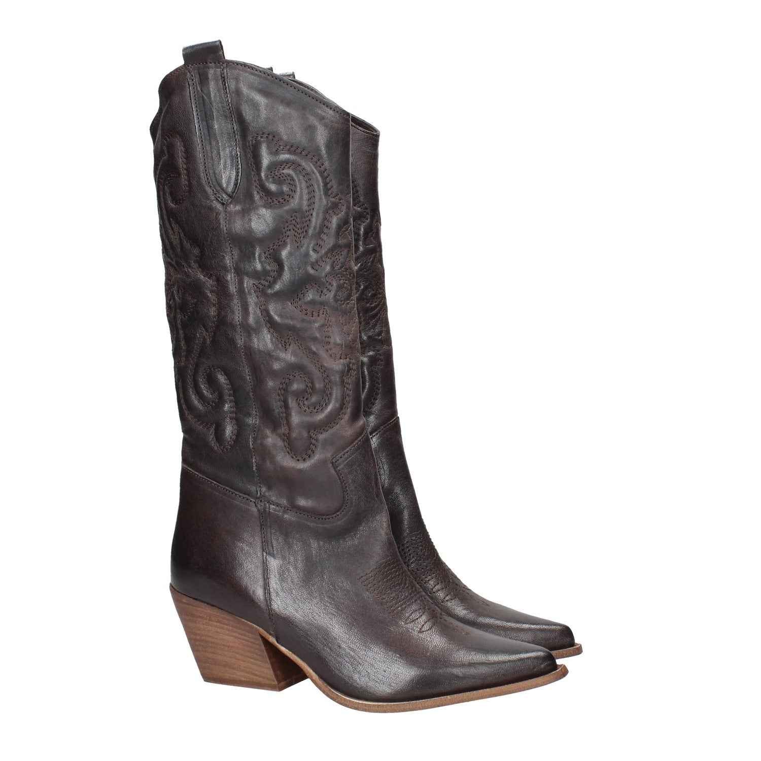 Texano in pelle, tacco alto 7cm, suola in gomma, modello slip-on, interno foderato.