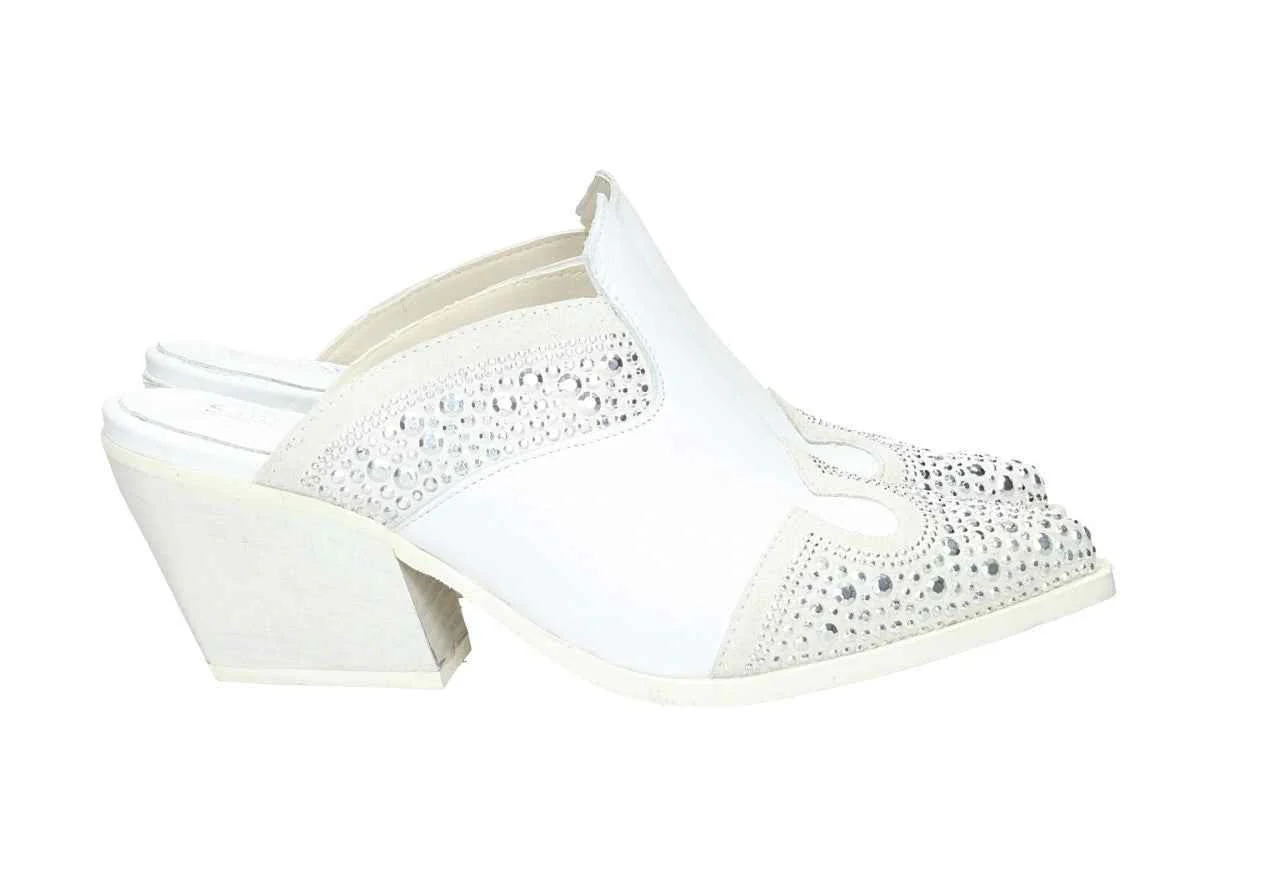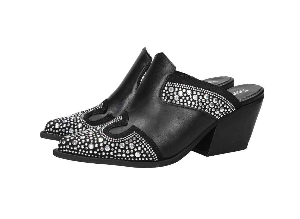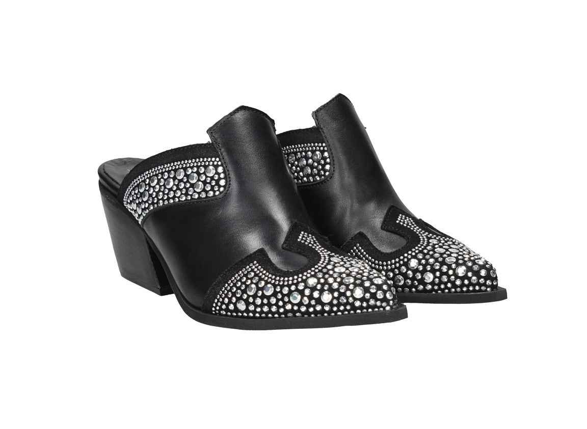 Sabot in pelle con strass, tacco alto 7cm, suola in gomma, con soletta in pelle.
