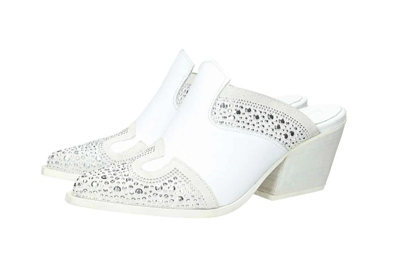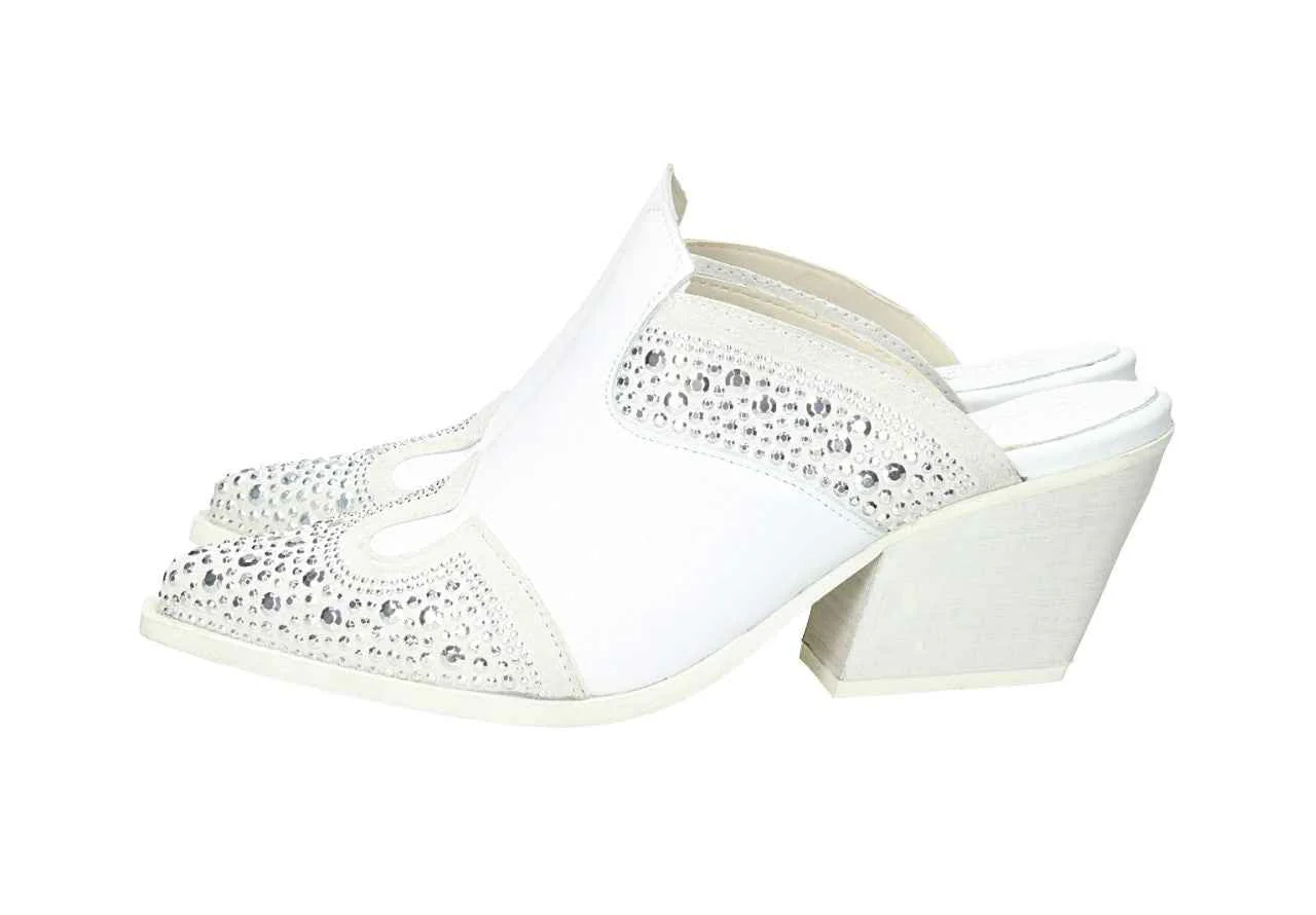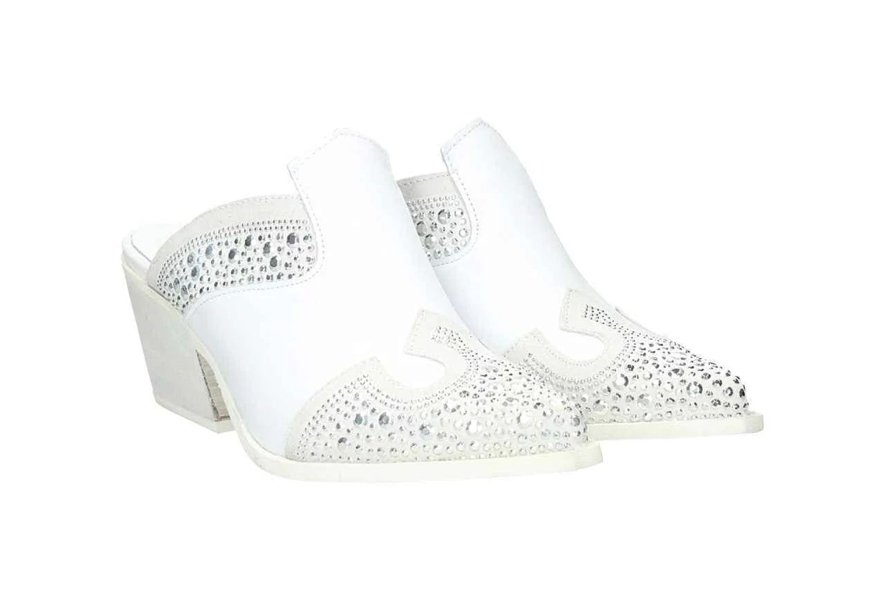 Sabot in pelle con strass, tacco alto 7cm, suola in gomma, con soletta in pelle.