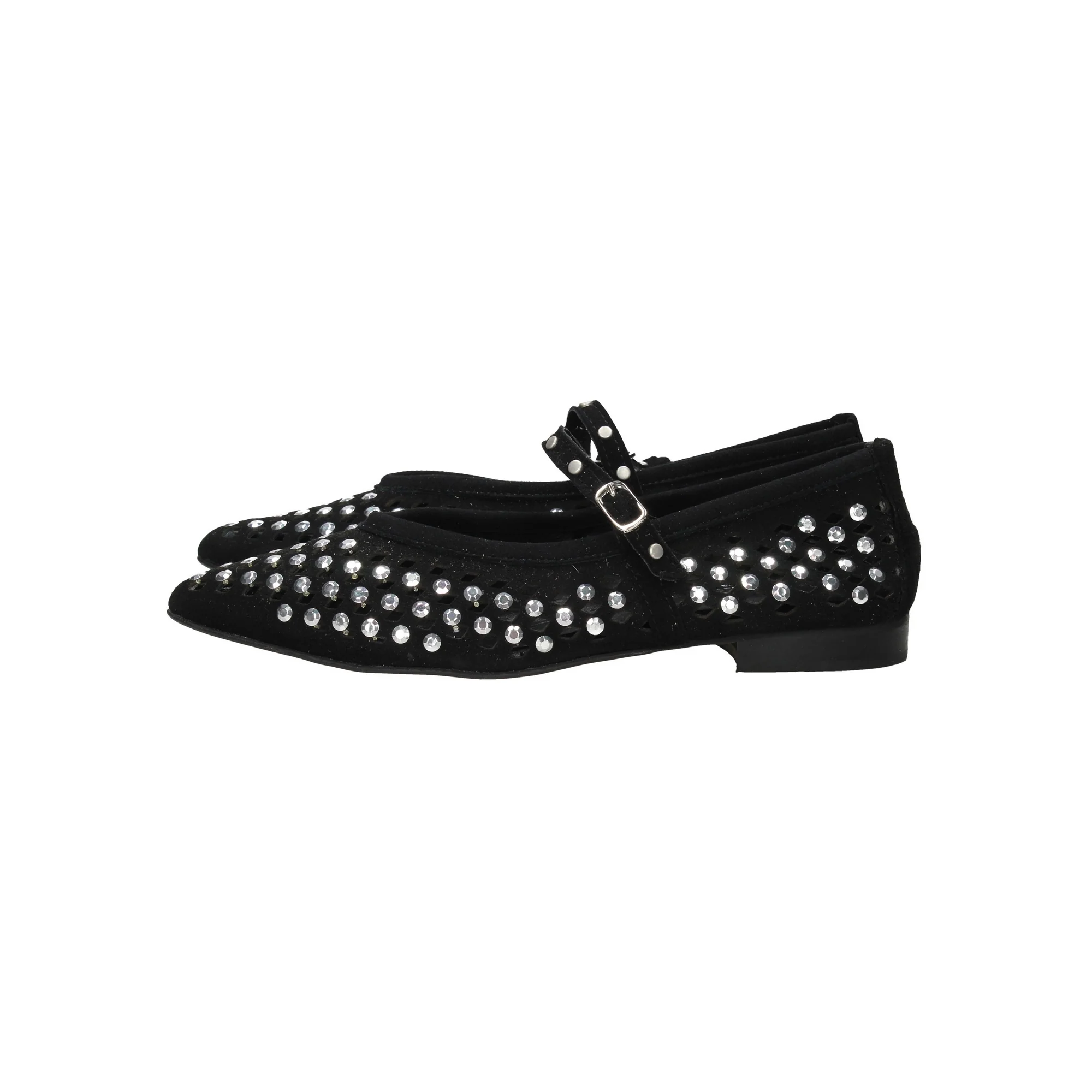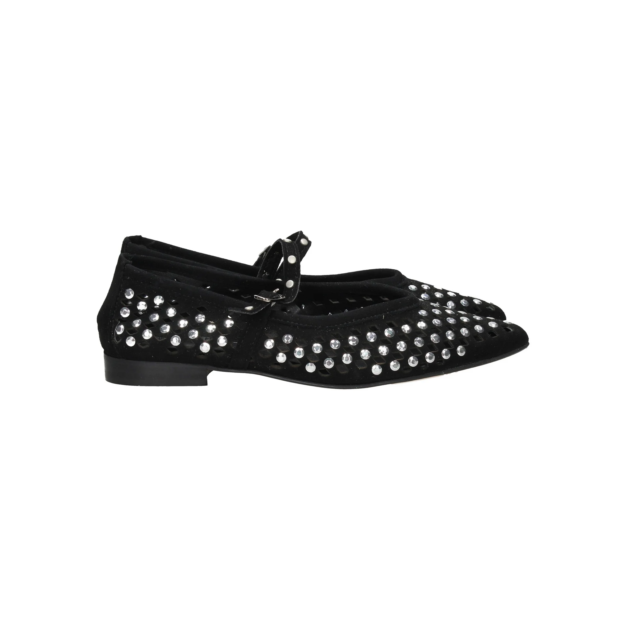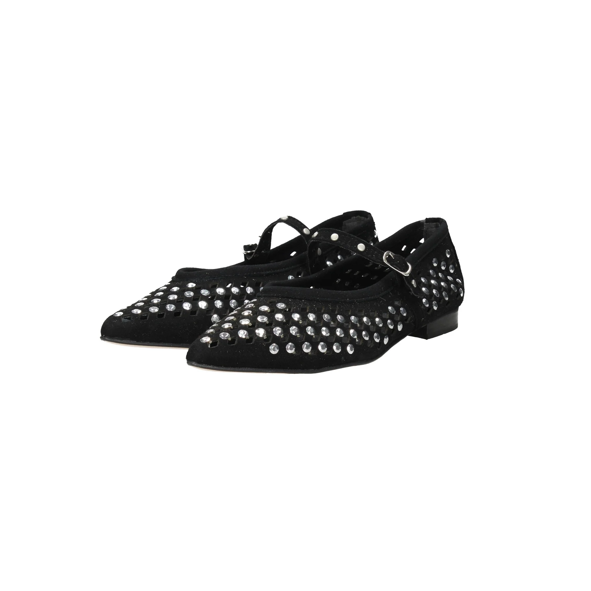 La ballerina è realizzata in camoscio traforato con borchie applicate.