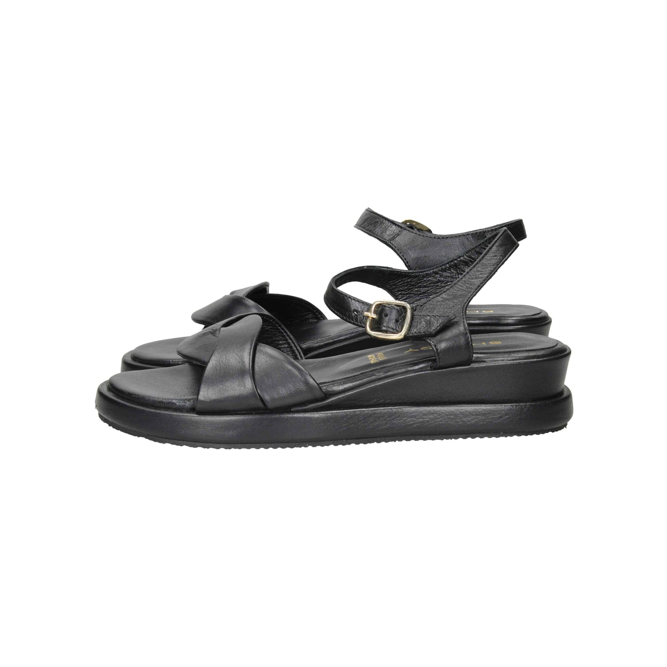 Sandalo in pelle, zeppa alta 4cm, suola in gomma, fondo antiscivolo, con cinturino regolabile, soletta in pelle.