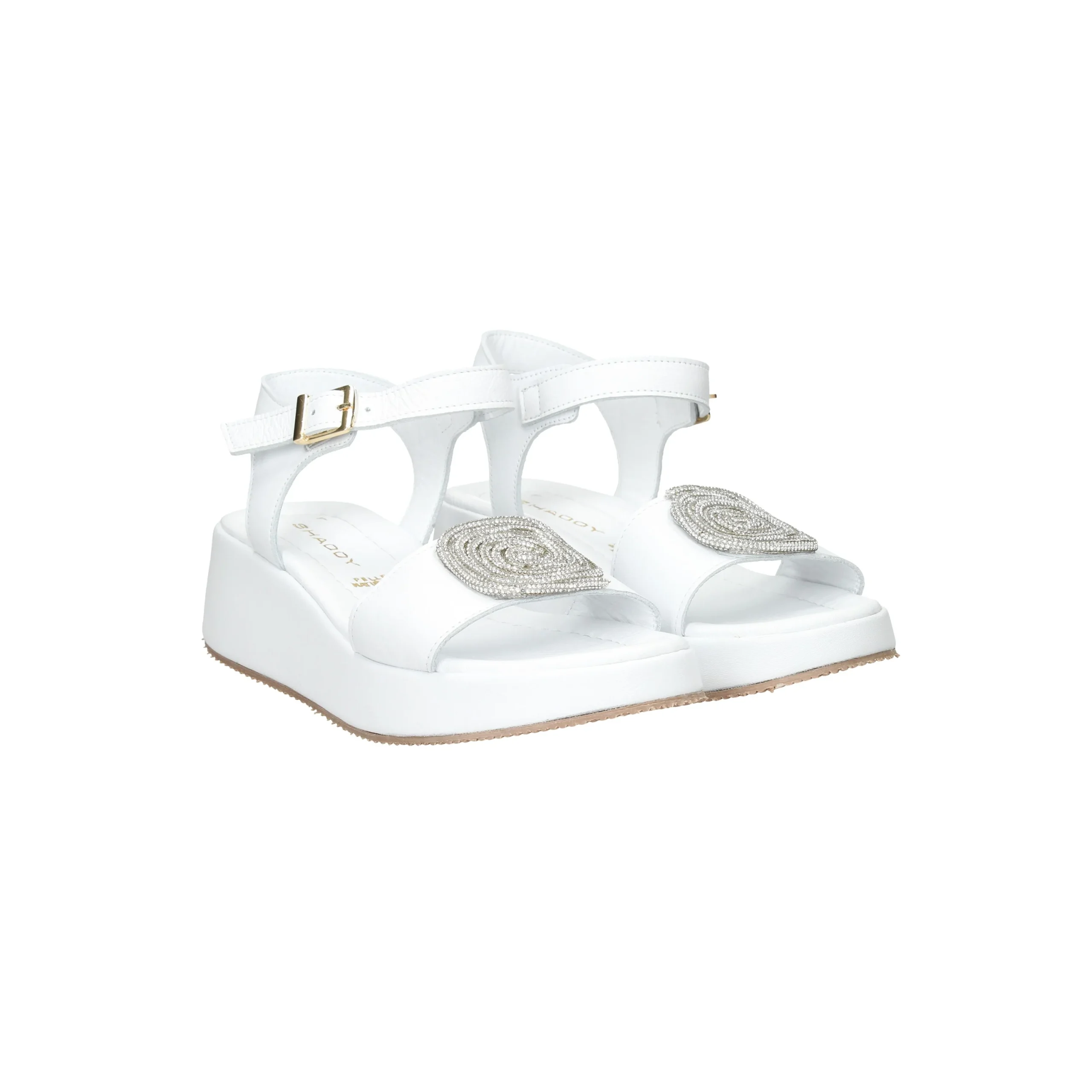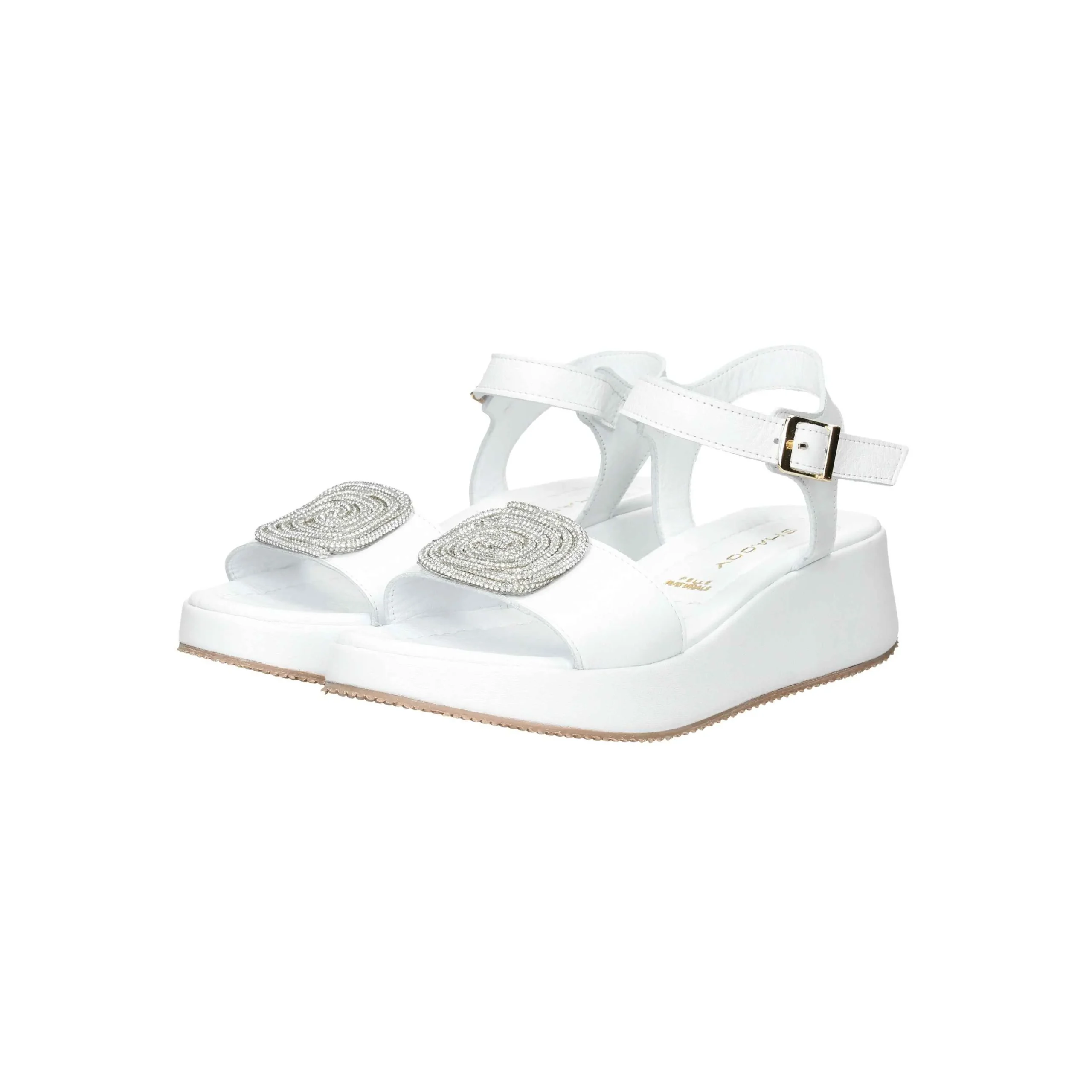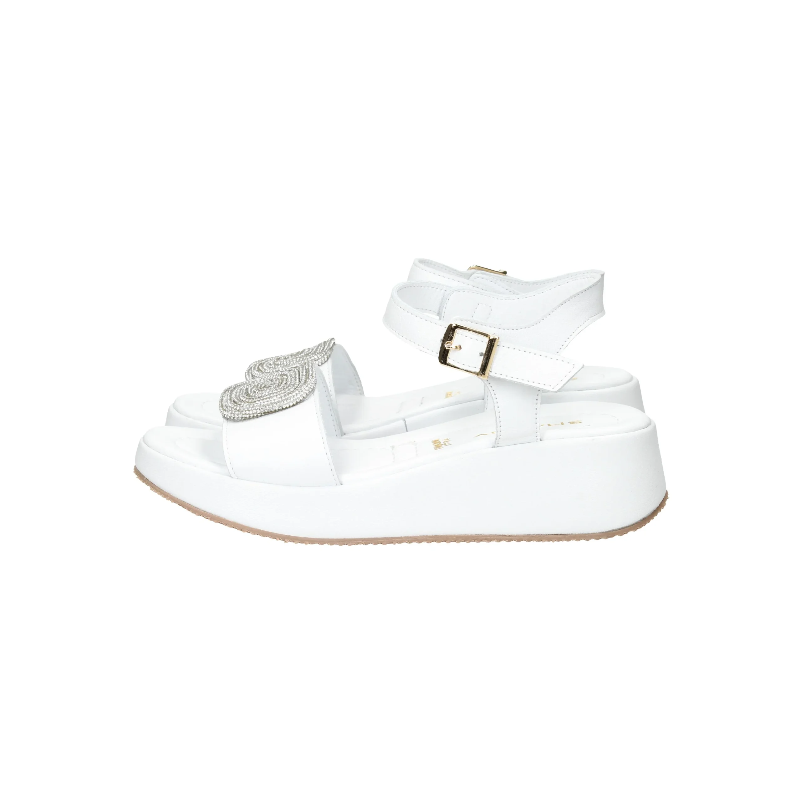 Presenta fascia sul davanti con strass e cinturino con fibbia regolabile, plantare in pelle.