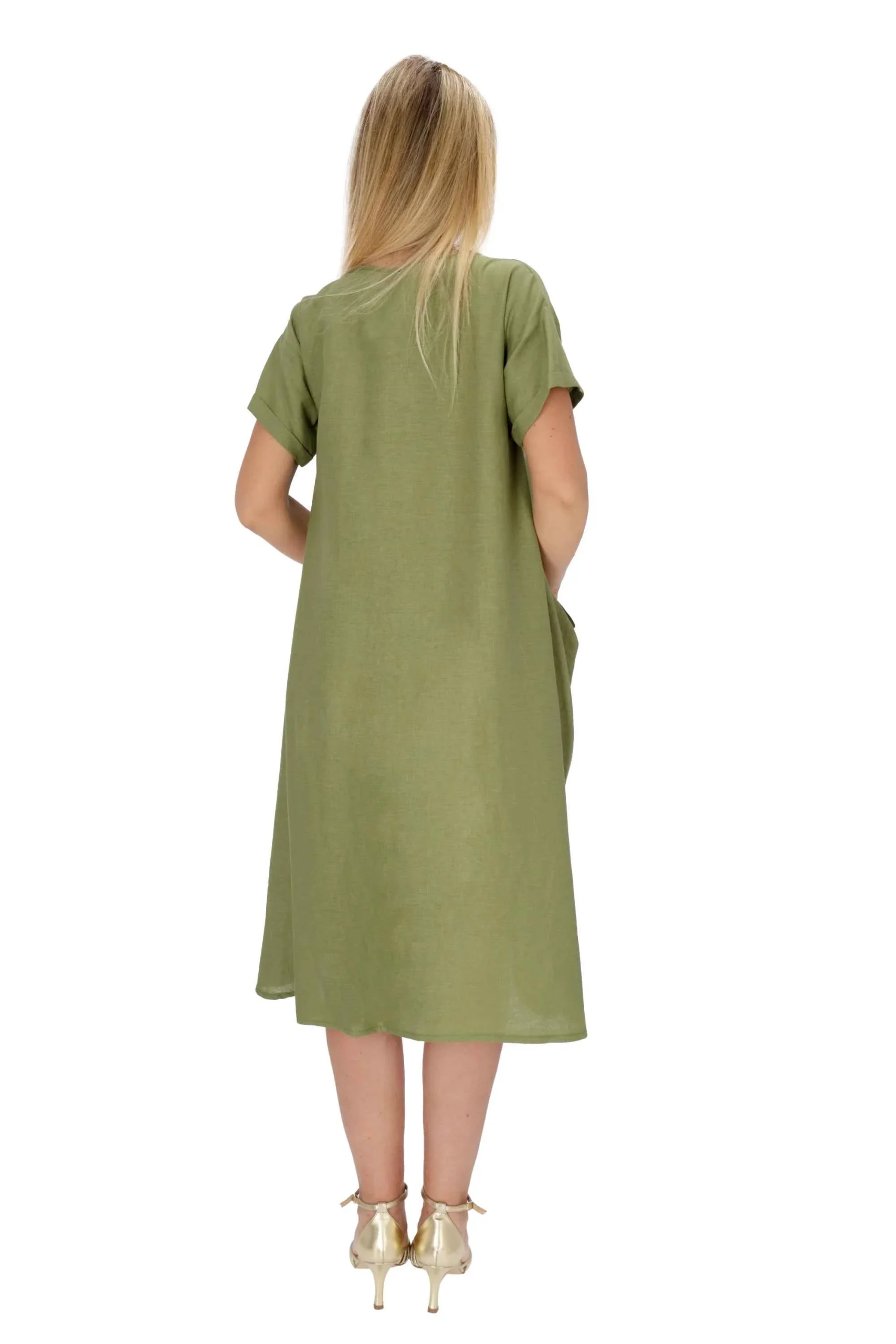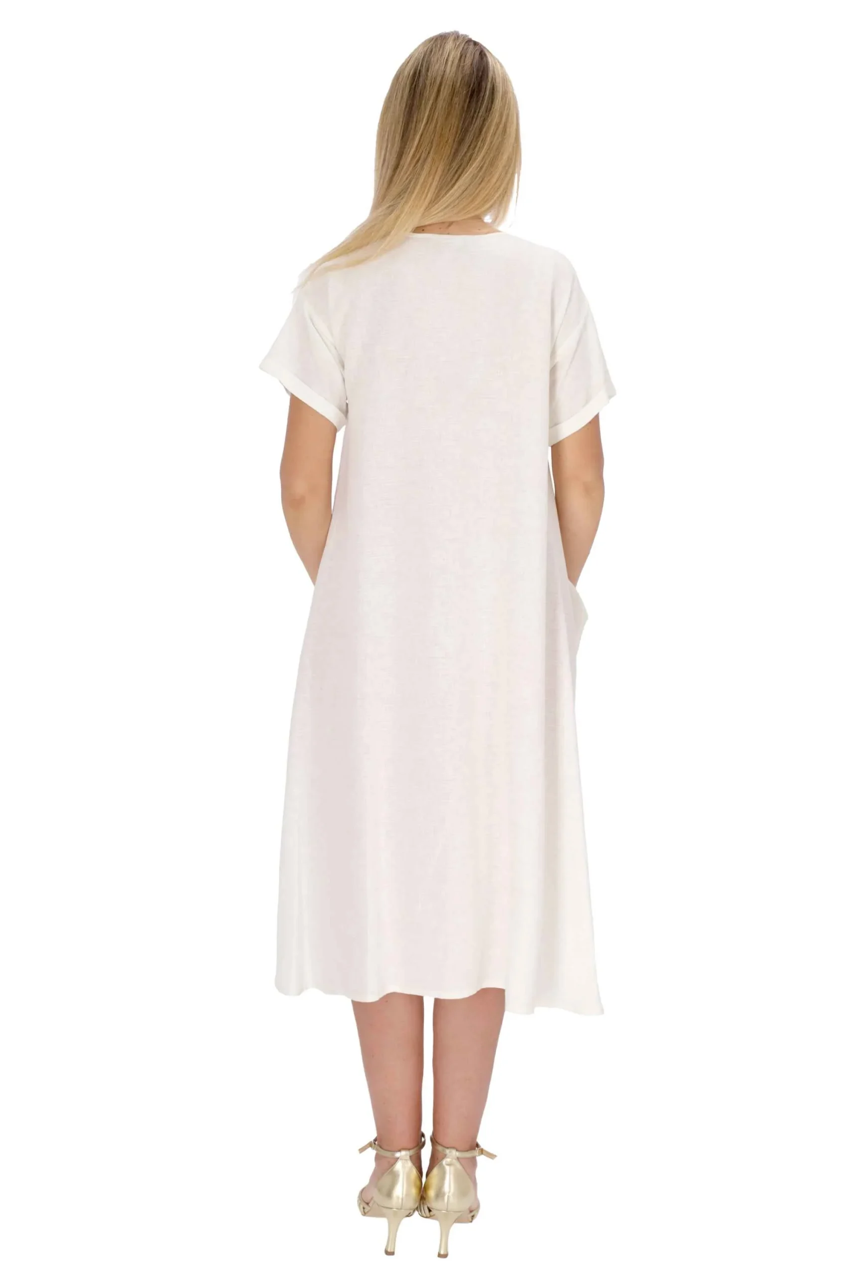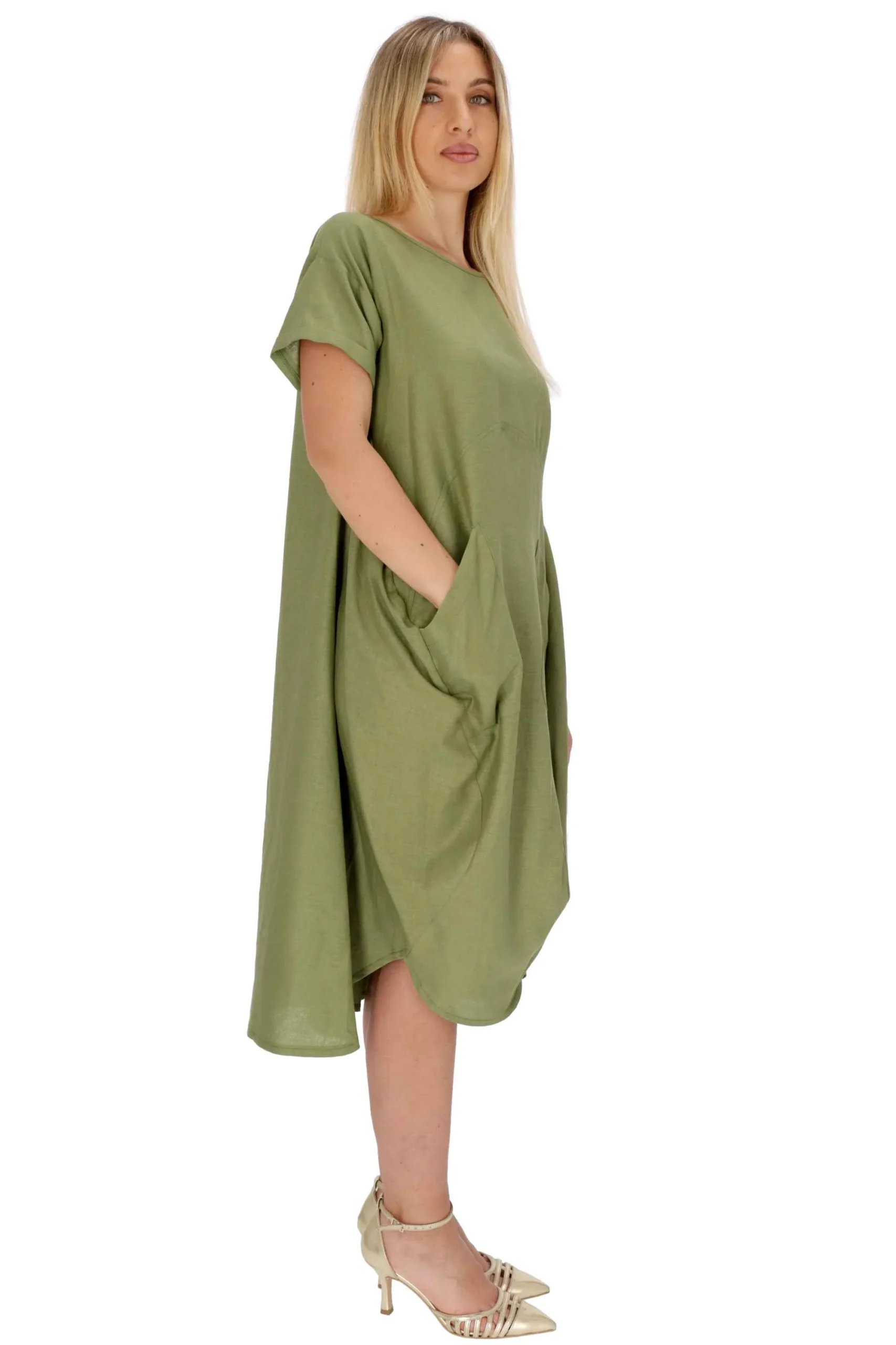 L’abito è realizzato in lino e viscosa, dal modello ampio.