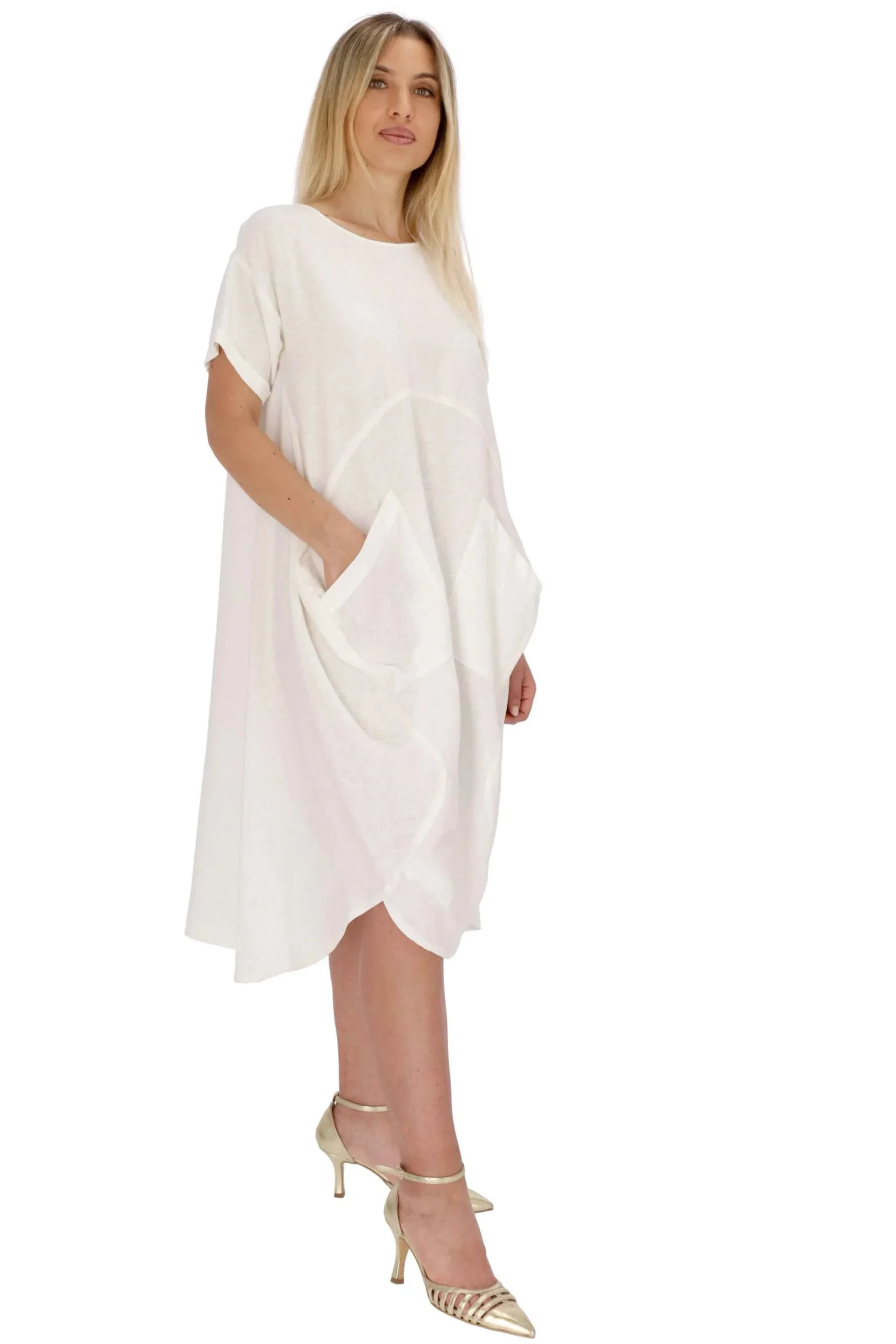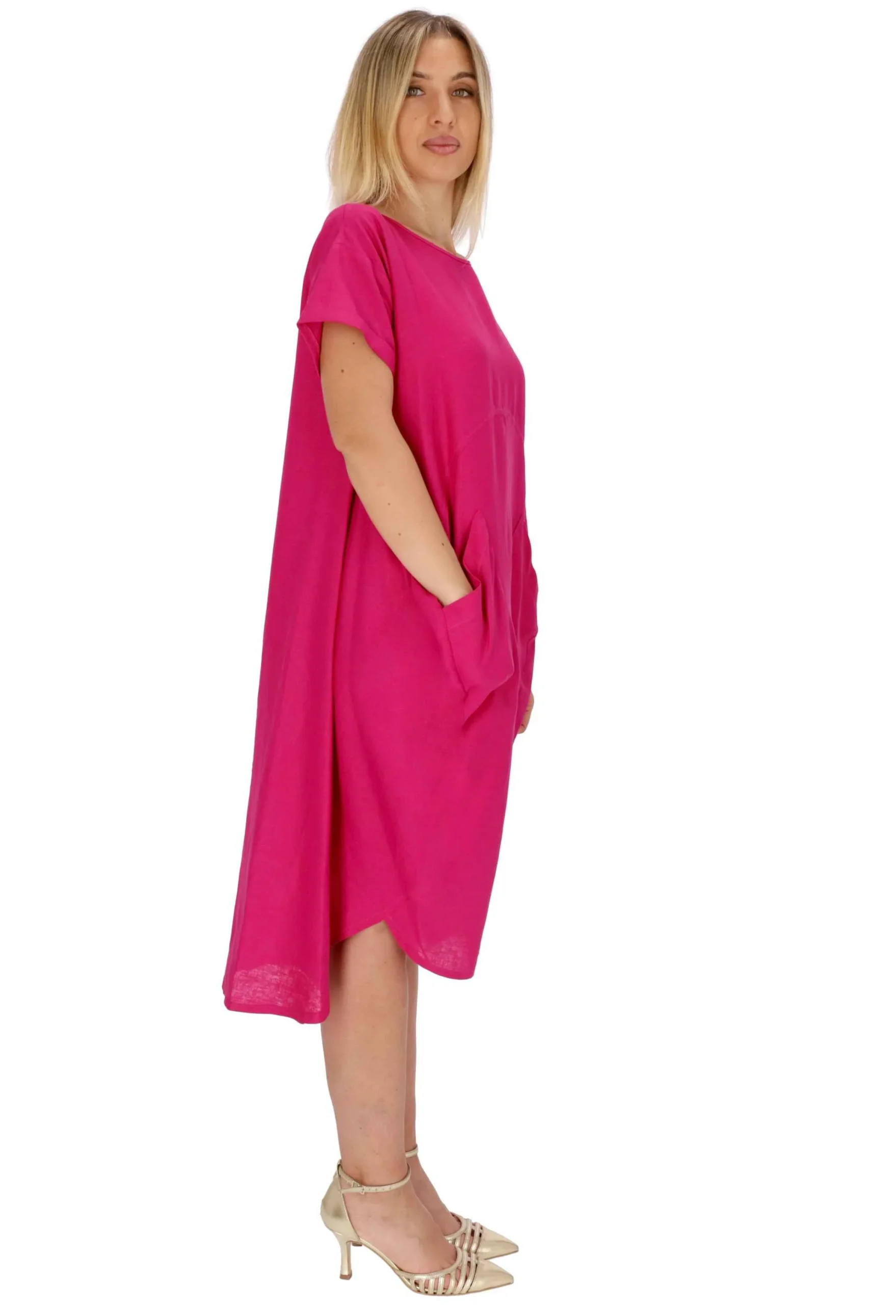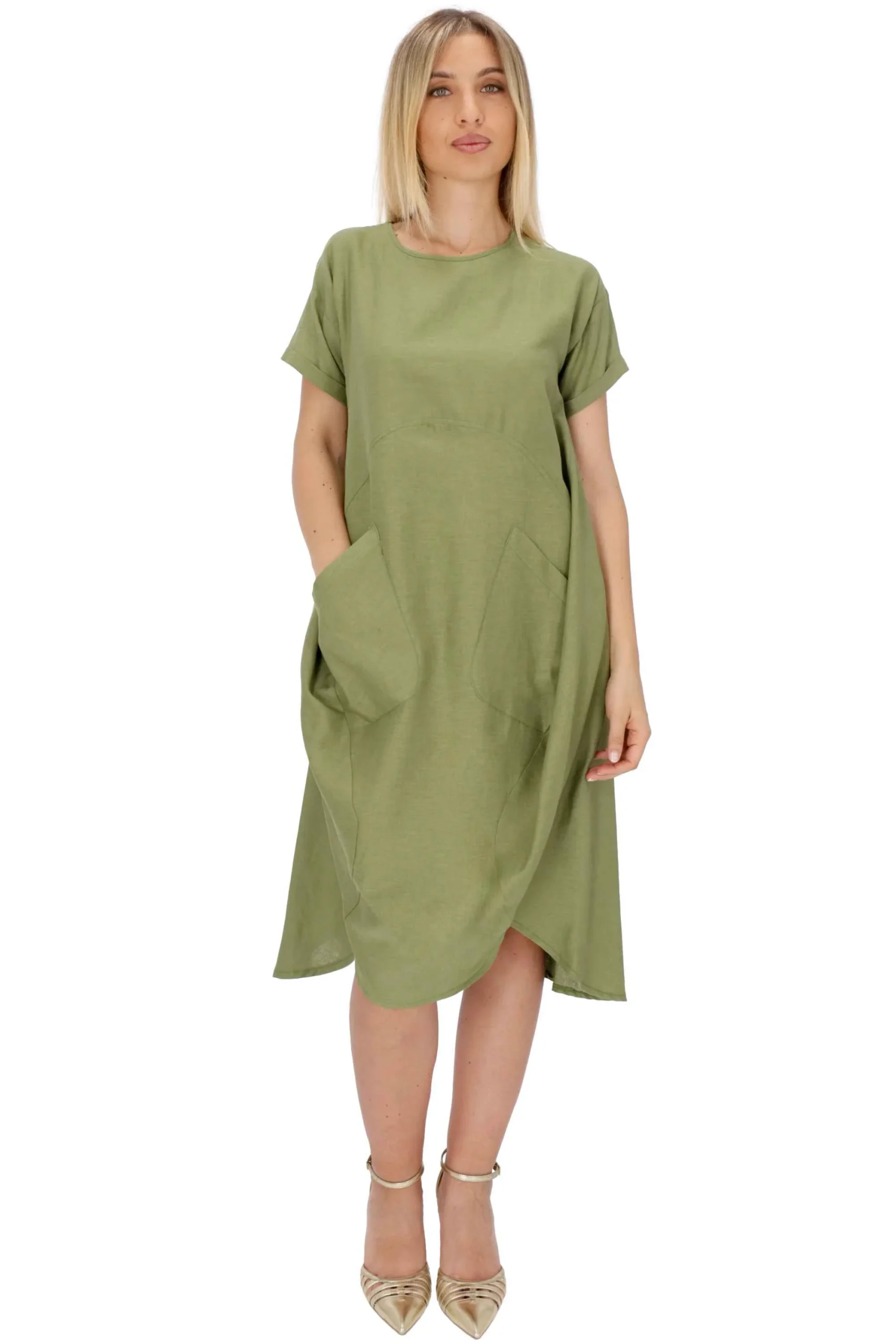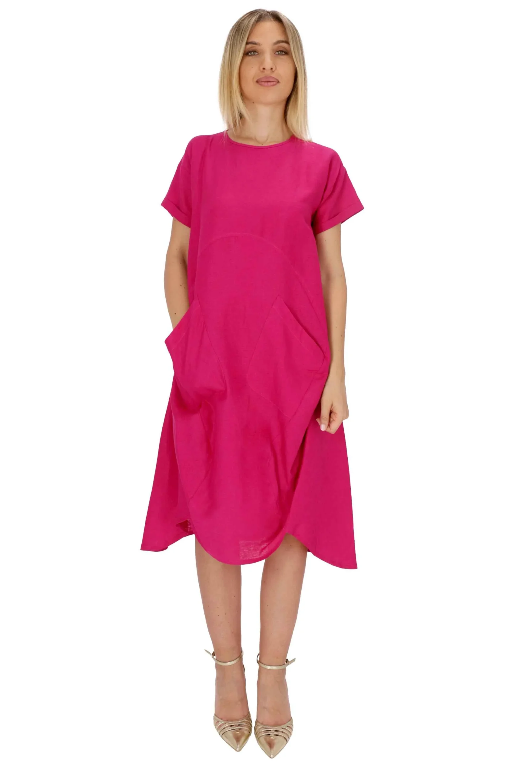 L’abito è realizzato in lino e viscosa, dal modello ampio.