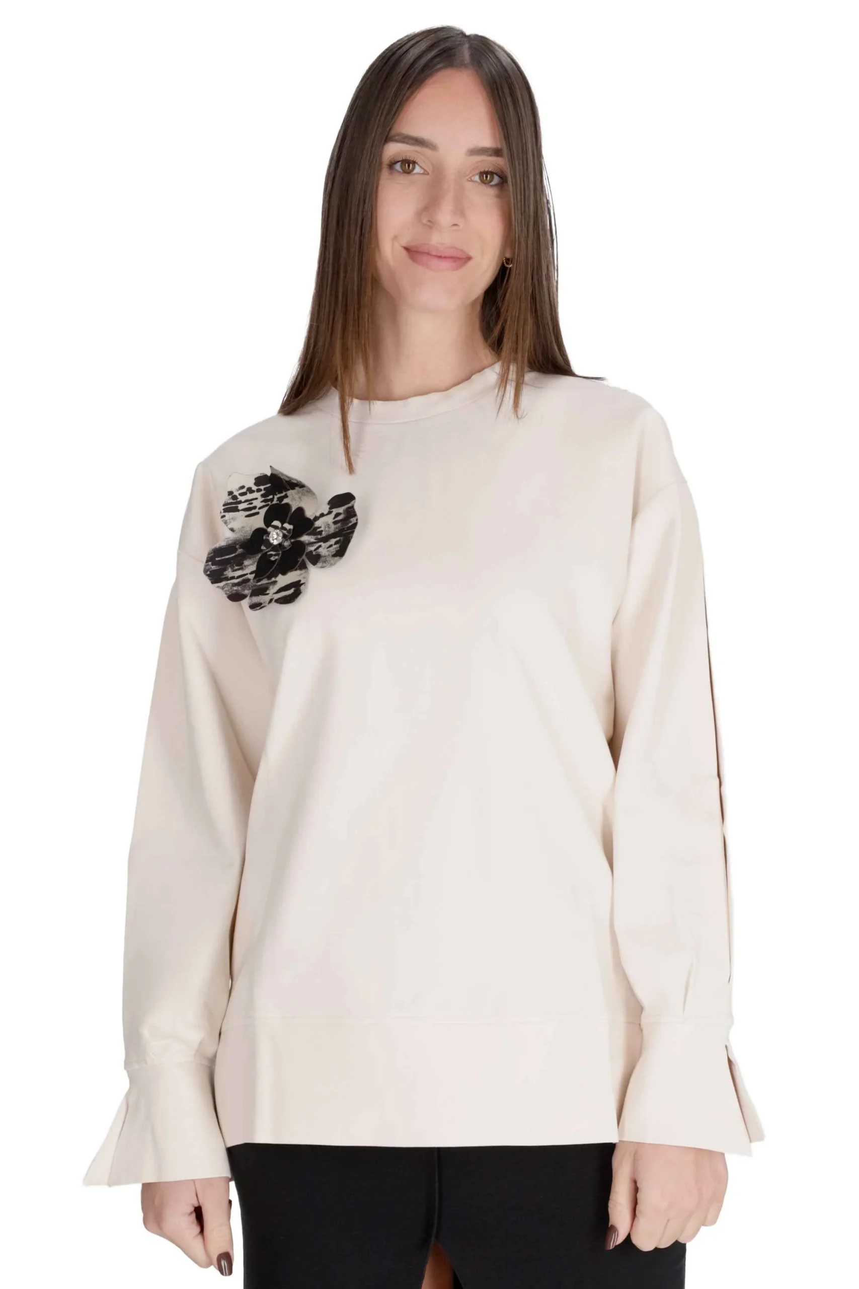 Presenta girocollo, maniche lunghe e bordi rifiniti a coste.