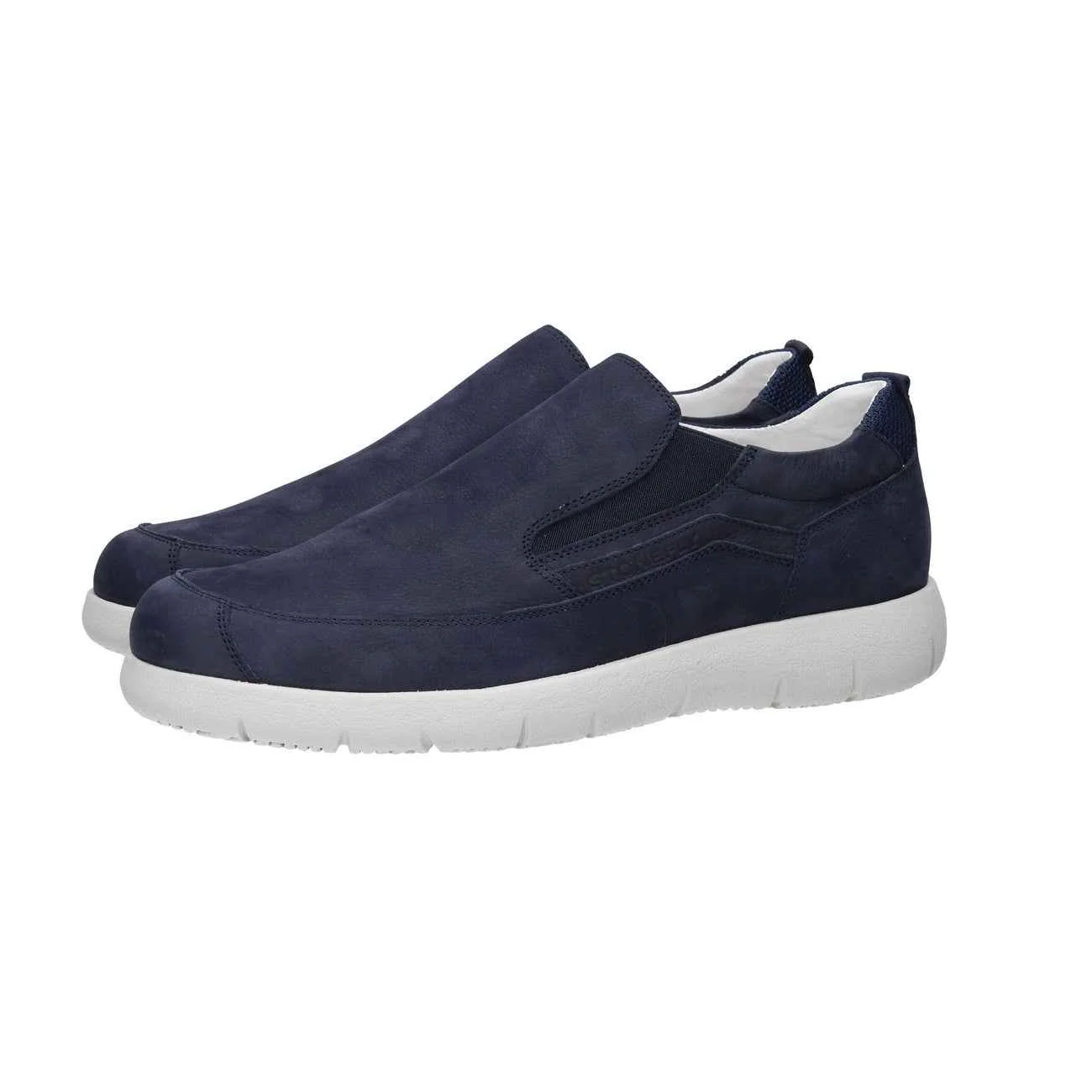 Mocassino in nabuk, suola in gomma, fondo antiscivolo, modello slip on, interno in pelle.