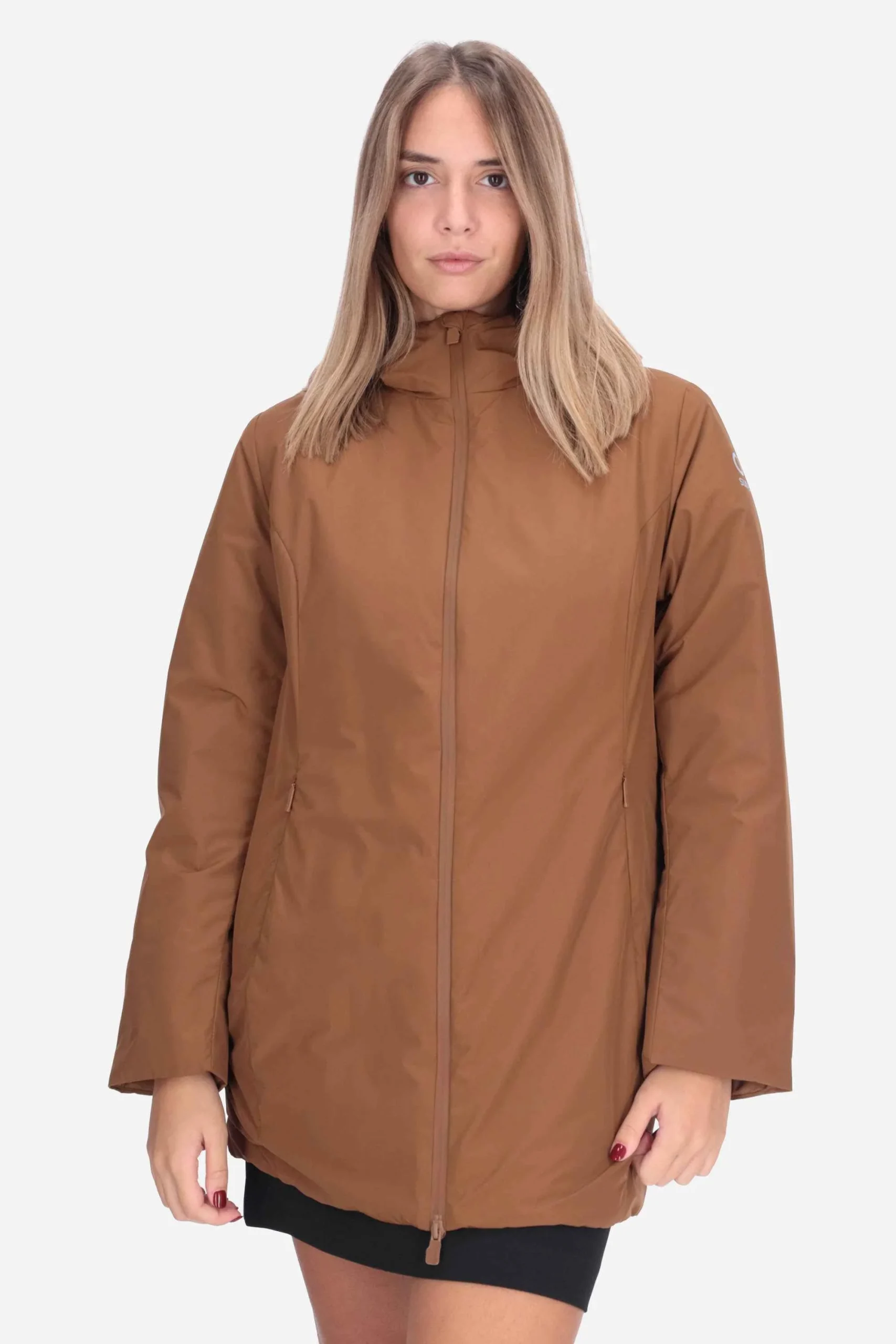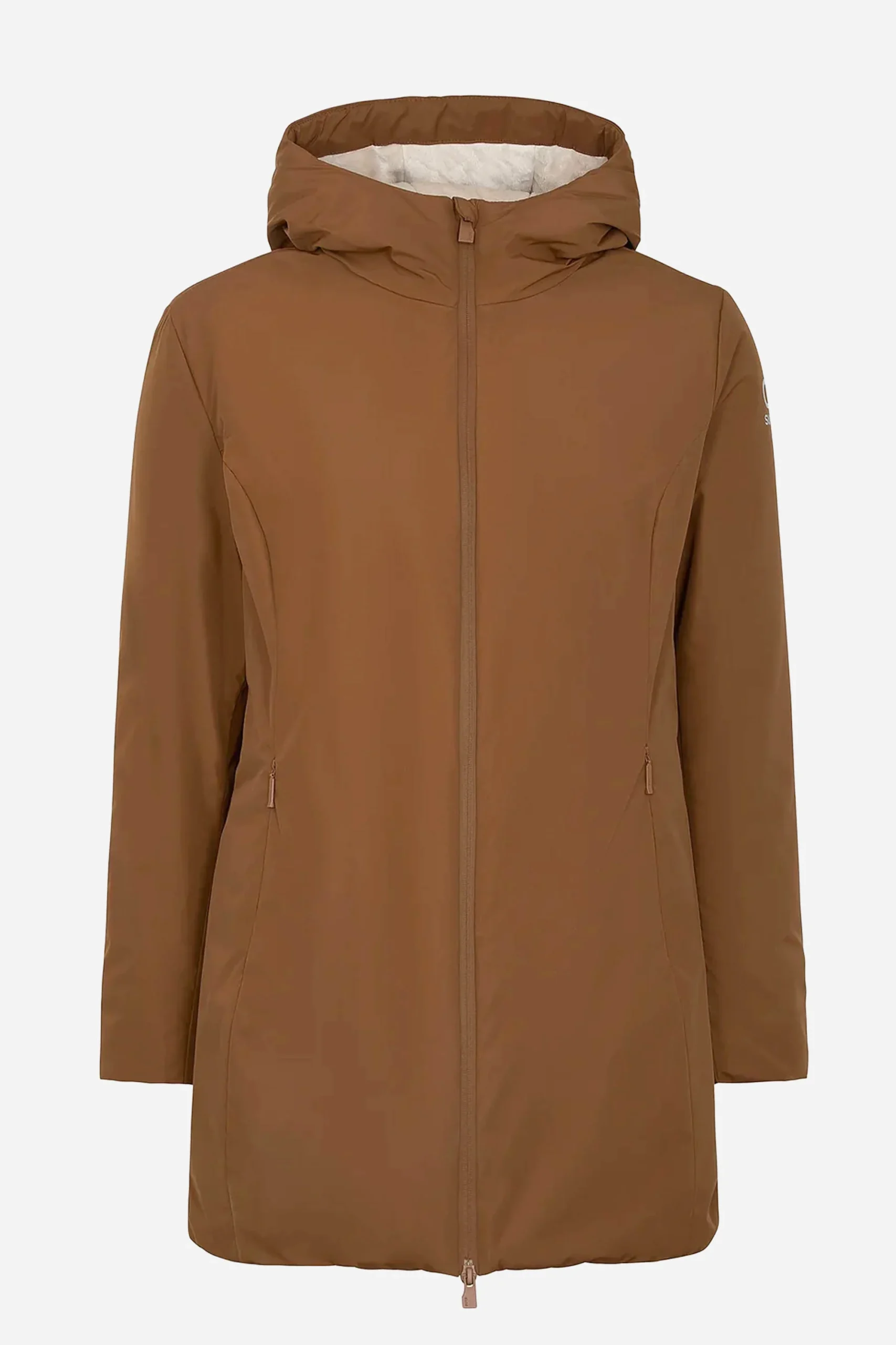 Il giubbotto lungo è realizzato in nylon tecnico interno interamente rivestito in eco fur rasata, morbida e tecnica.