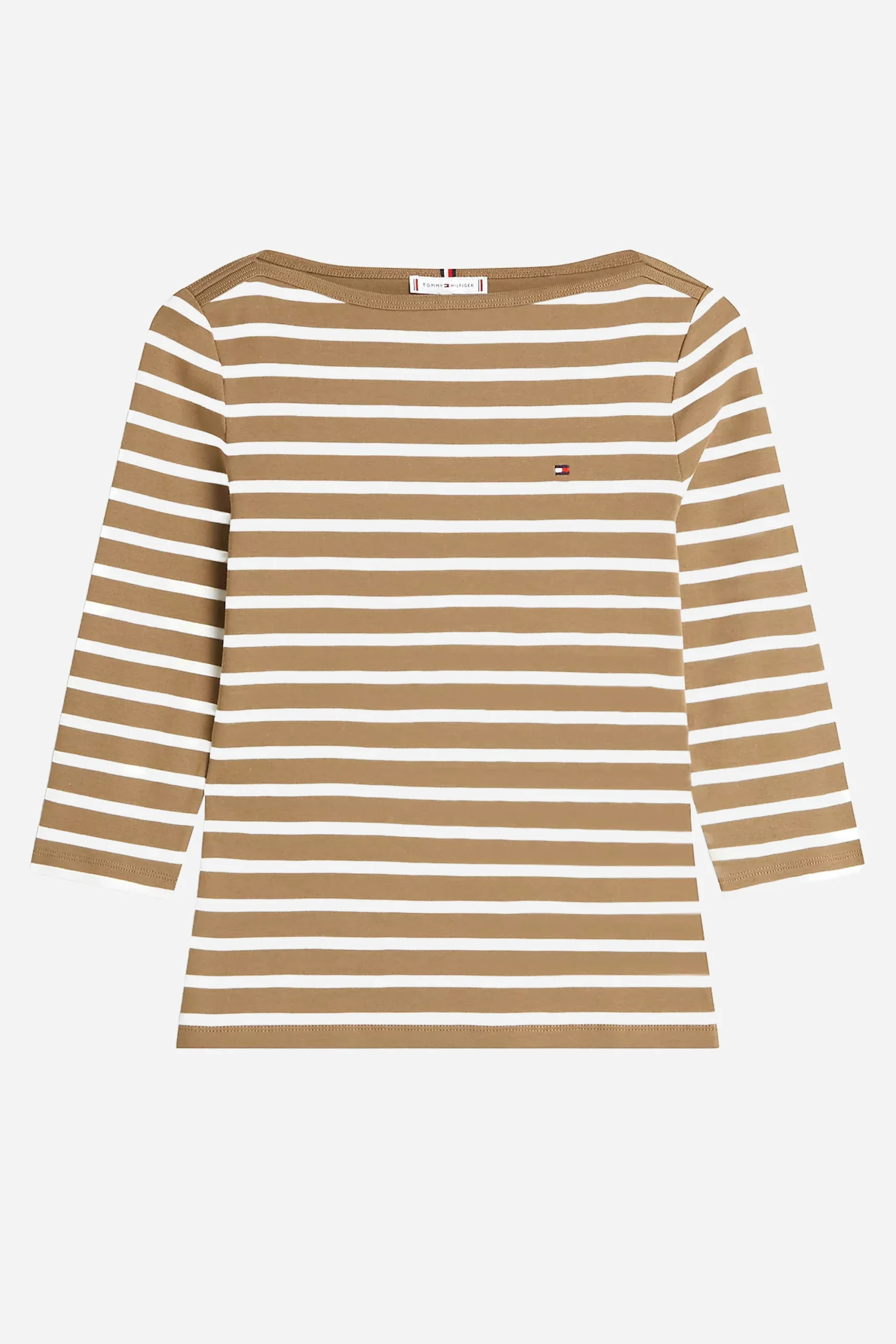 Presenta motivo a righe orizzontali, scollatura a barca e maniche 3/4.