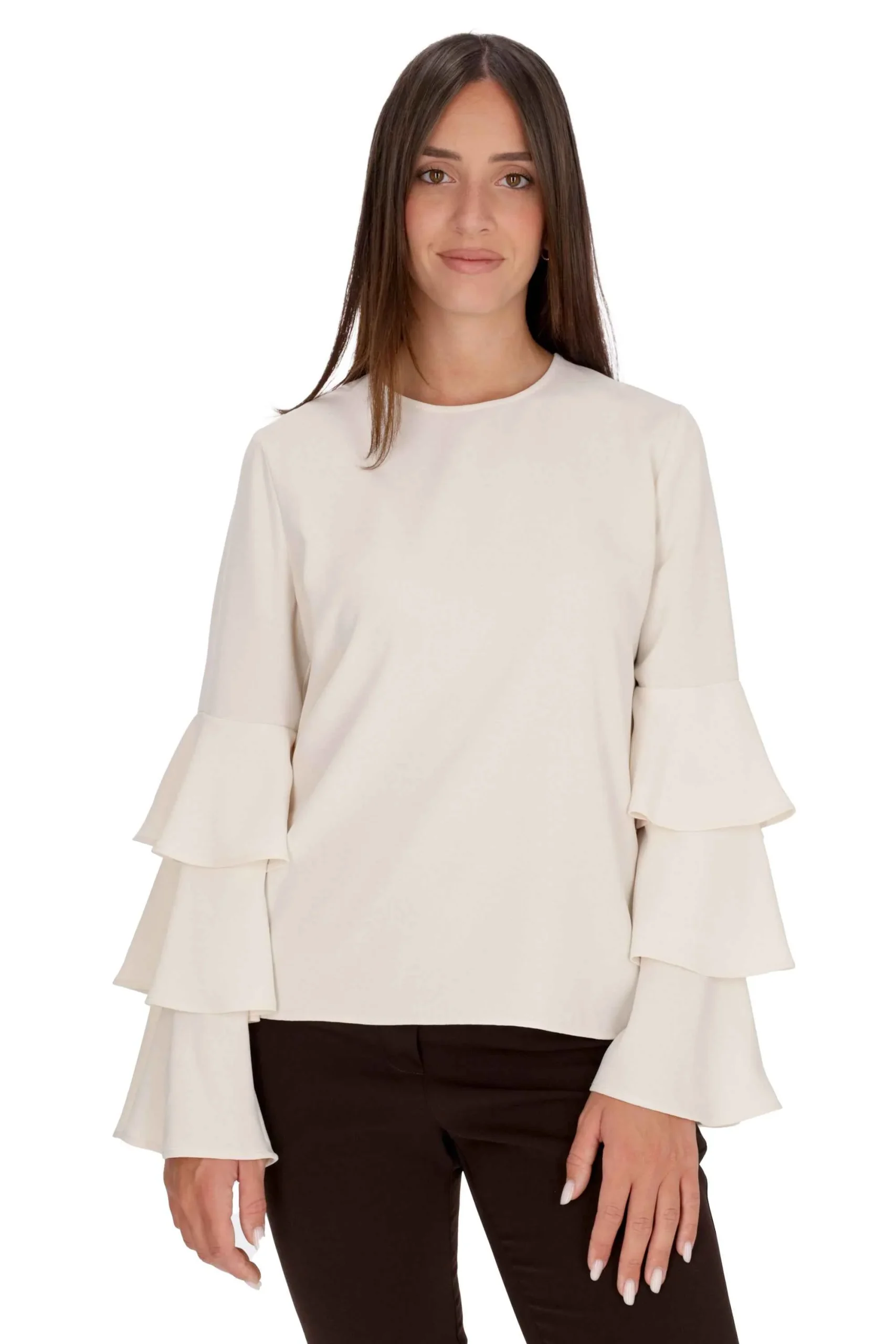 Presenta scollatura rotonda, chiusura con cut out a goccia sul davanti, piega sul davanti, polsini con bottone e maniche lunghe con spalle leggermente scese.