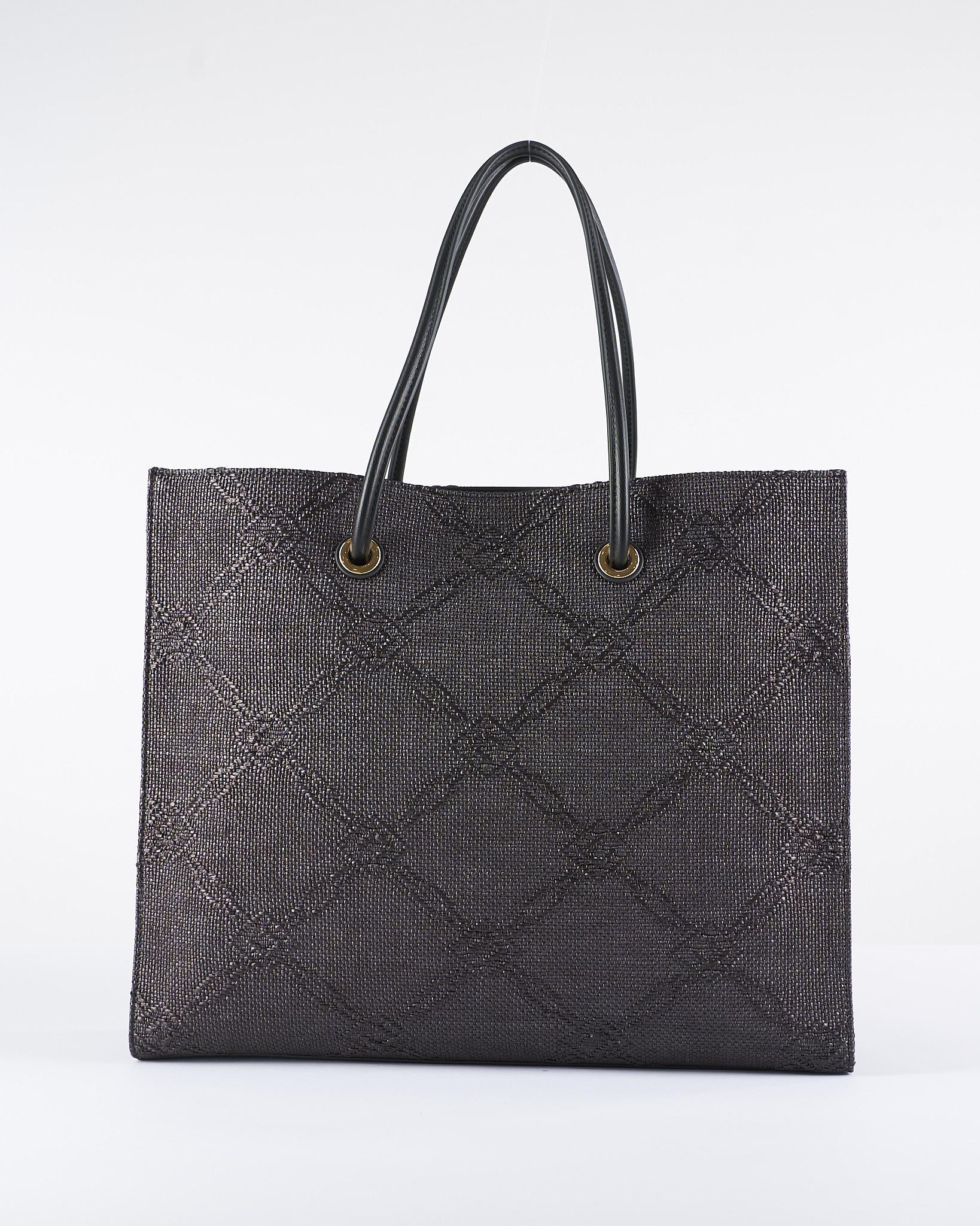 Borsa tote grande realizzata in rafia jacquard con disegno a losanghe, impreziosita da dettagli in metallo dorato per una nota di luce. Una patch con logo ricamato completa l’accessorio.