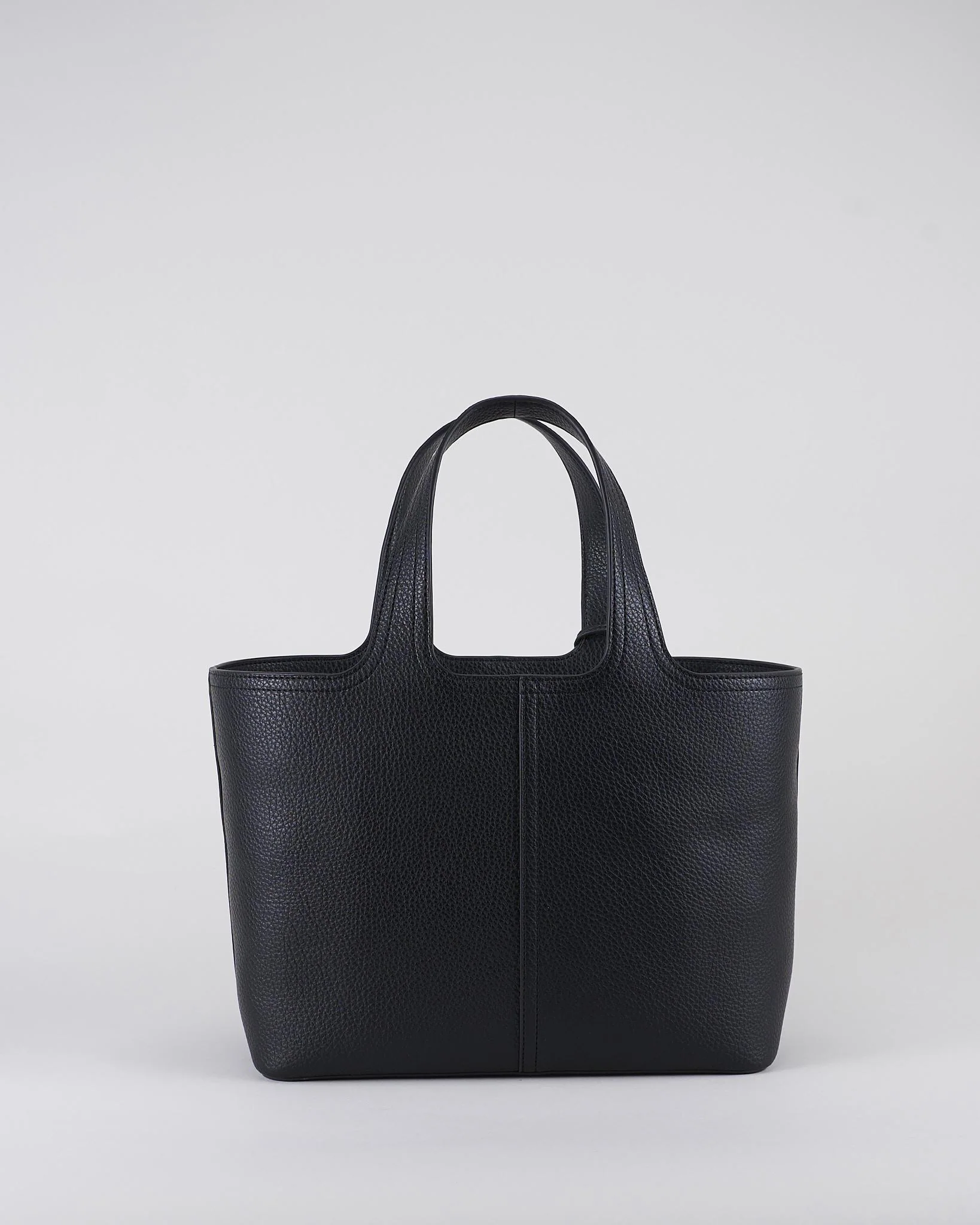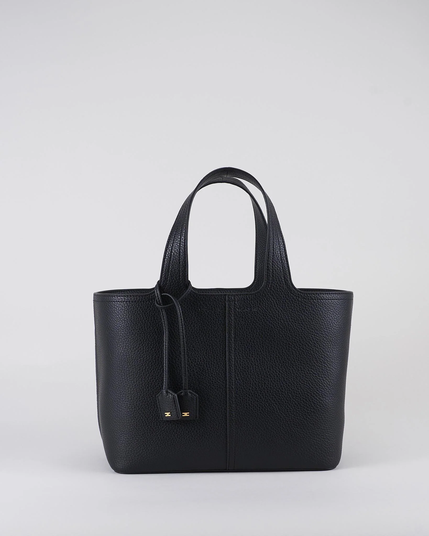 Borsa tote media realizzata in materiale sintetico con effetto pelle. Un accessorio ispirato alla valigeria classica decora il manico, impreziosito dai dettagli con logo.