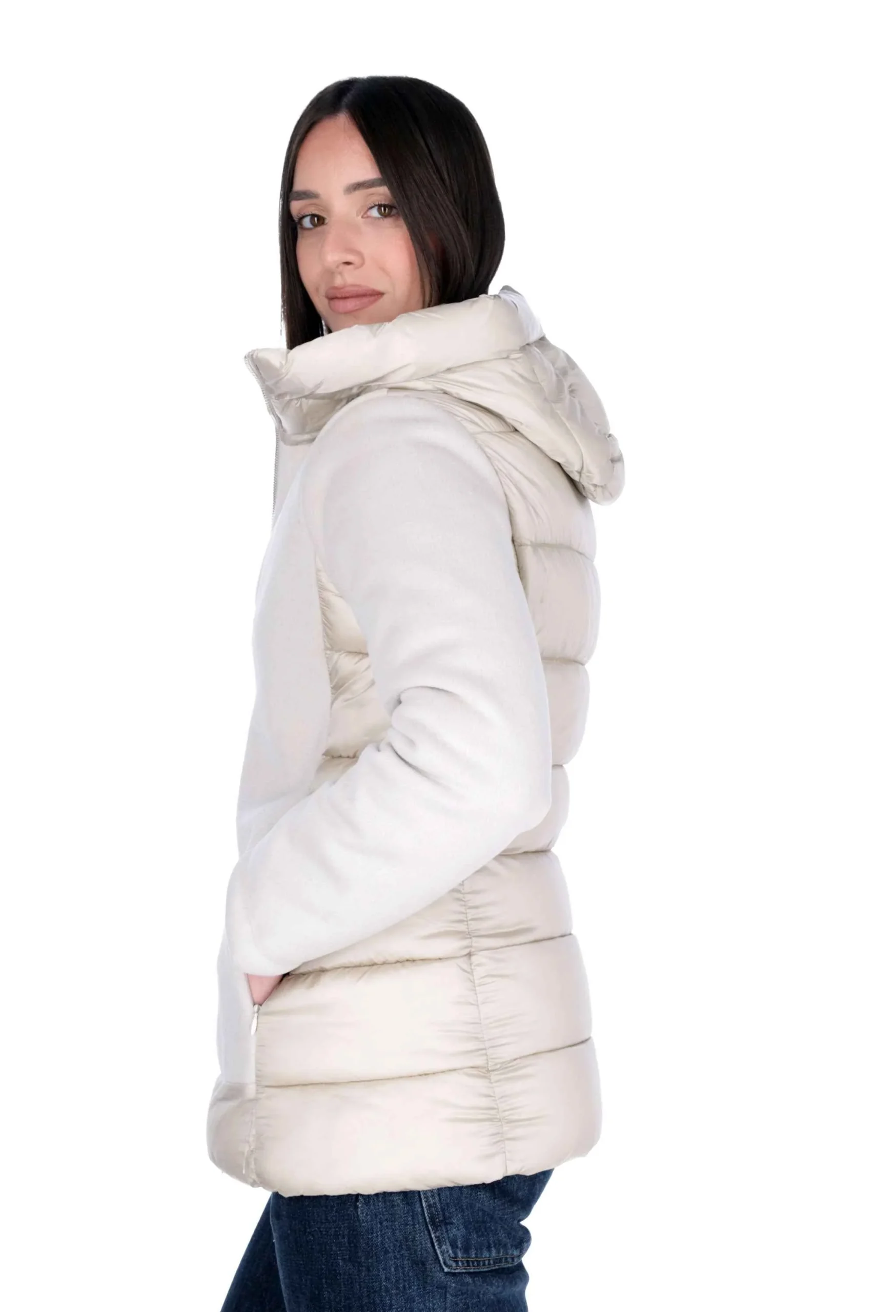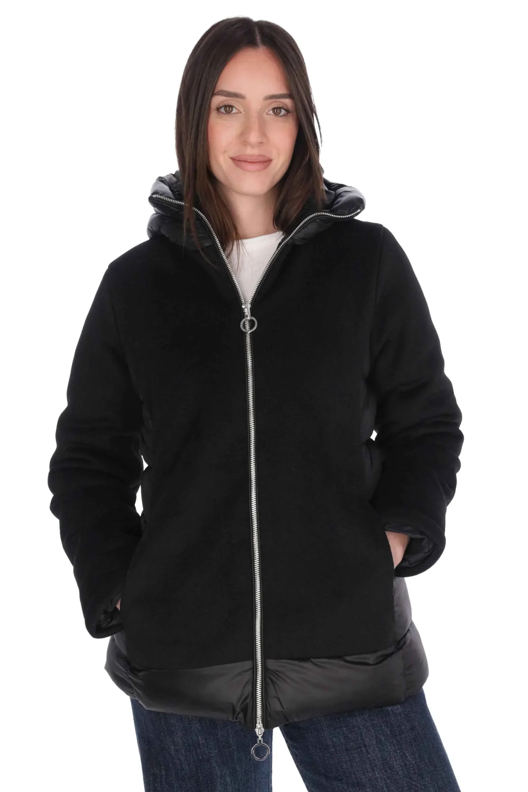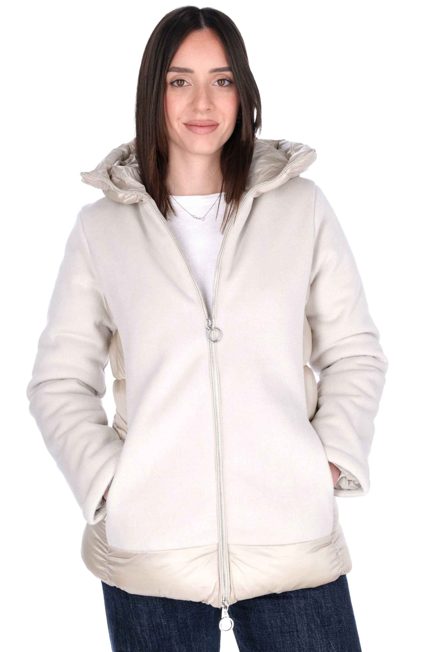 Presenta cappuccio, tasche sui fianchi e chiusura con zip doppio cursore.