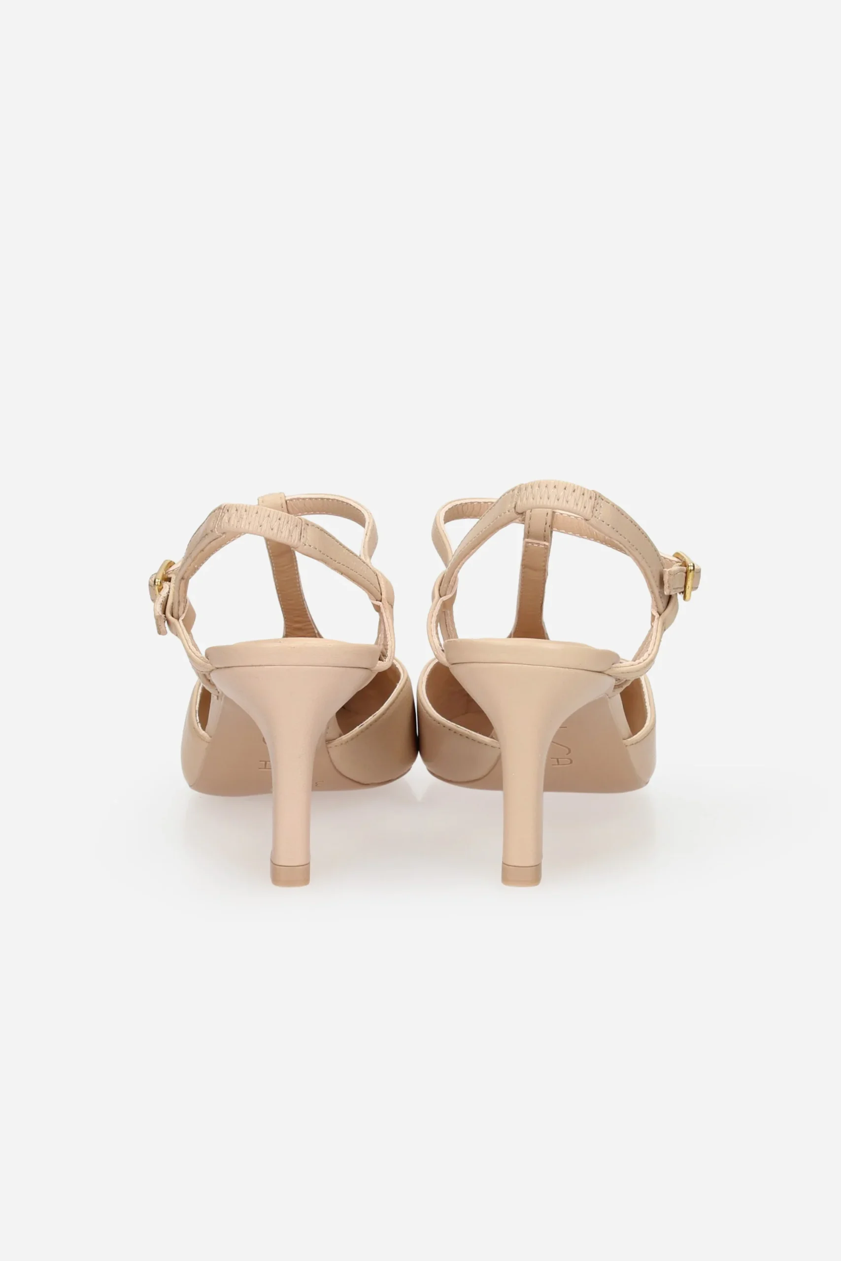 Presenta cinturino a T , fascia al tallone con elastico e chiusura con fibbia regolabile, plantare in pelle.