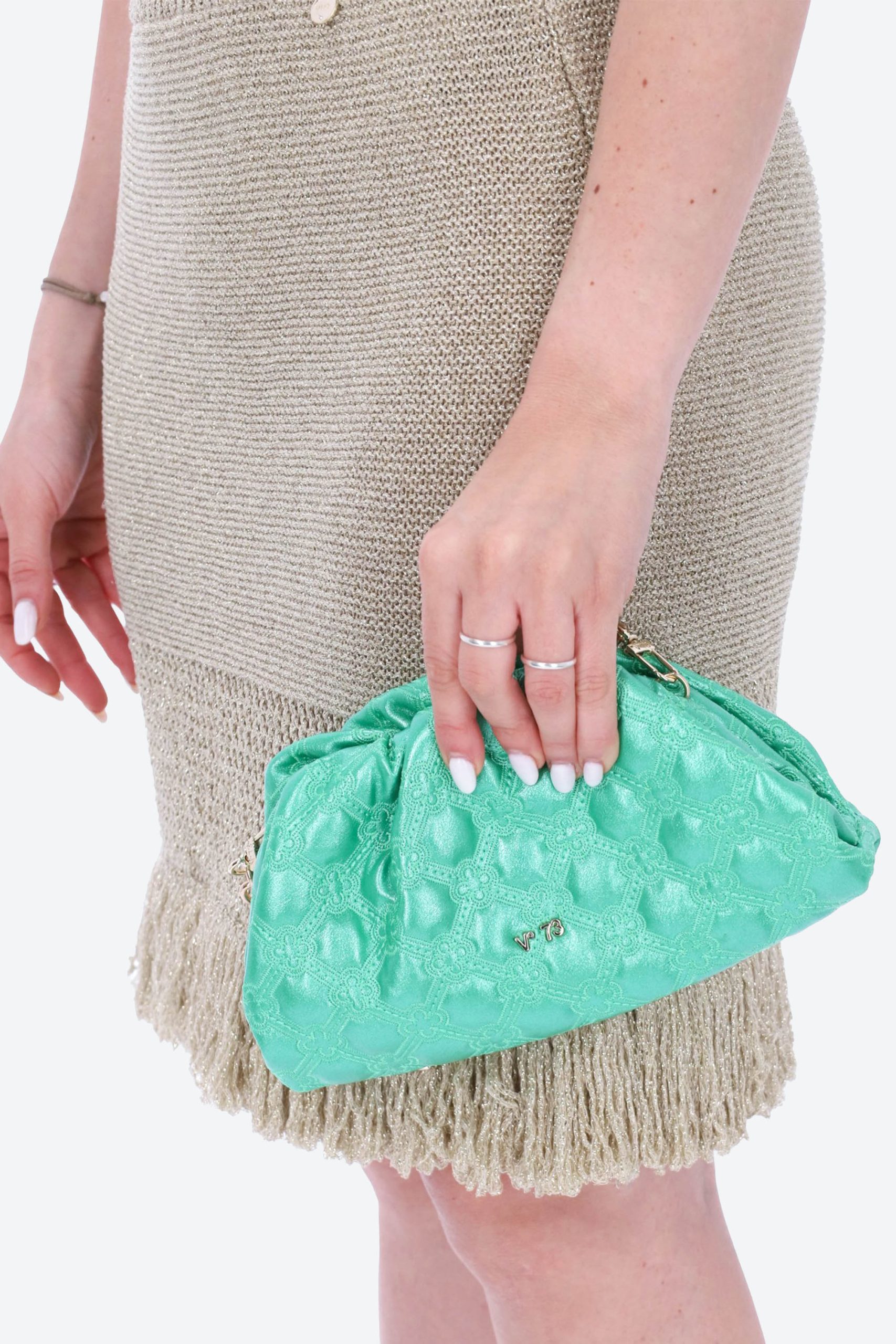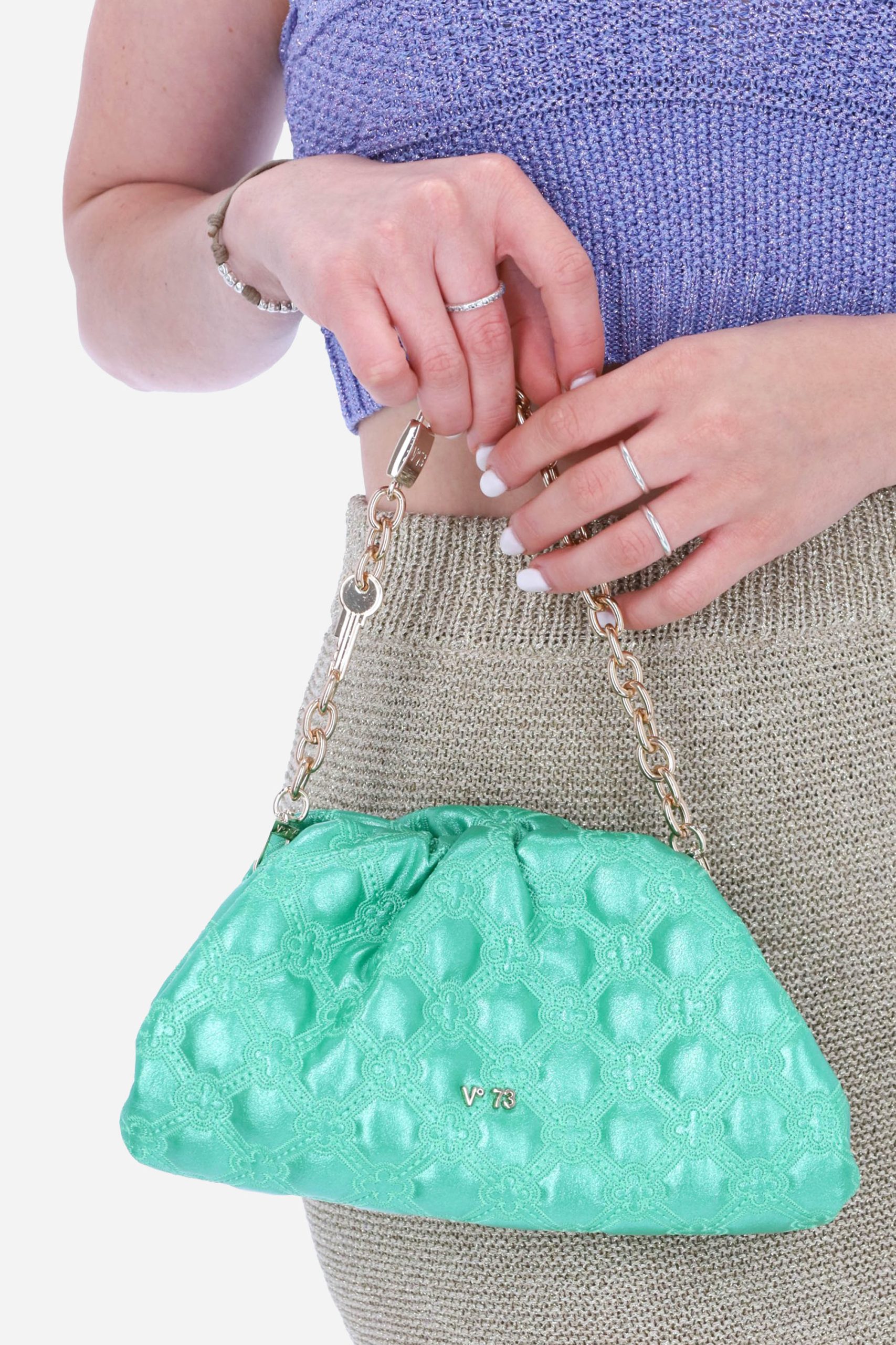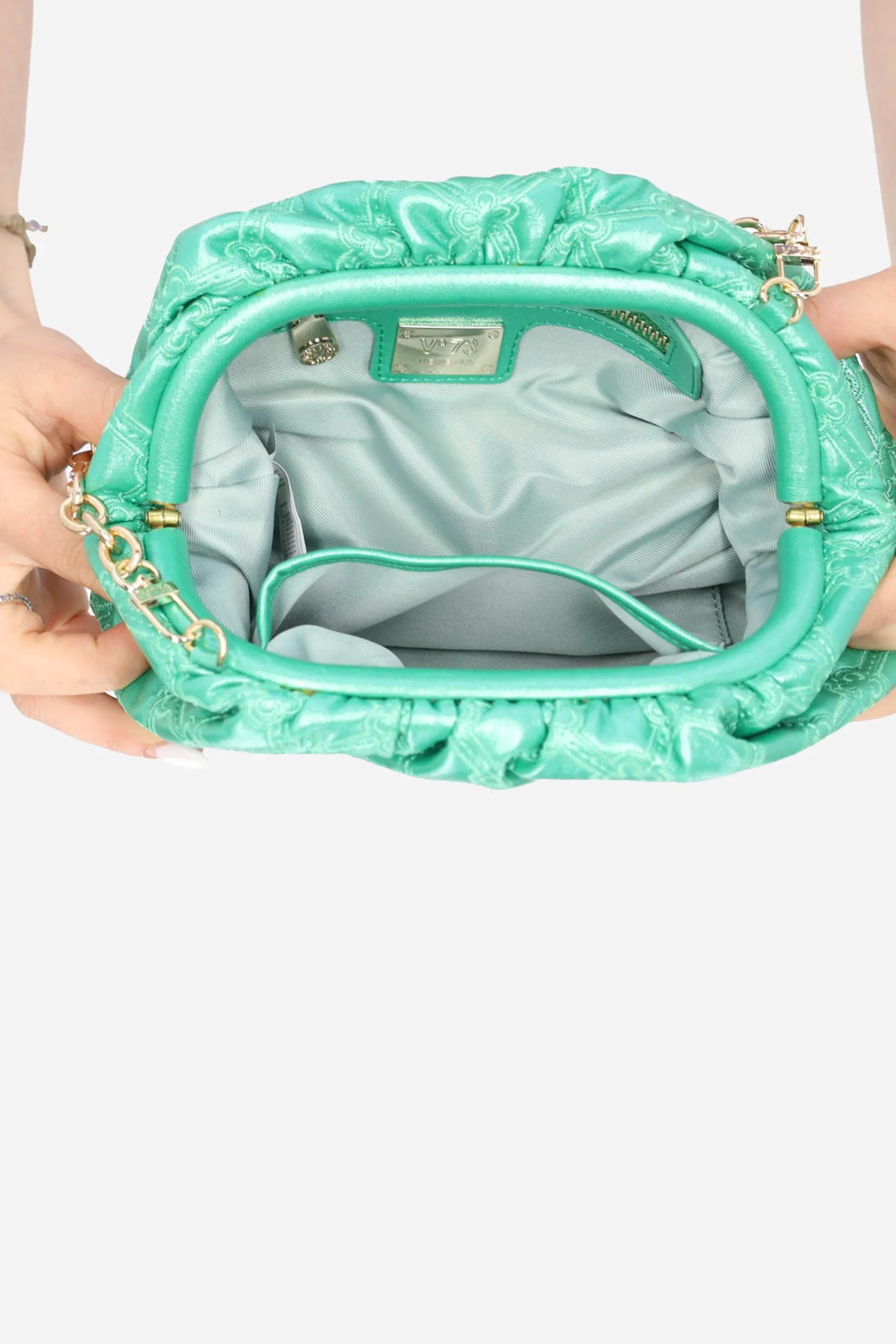 La borsa è realizzata in nappa laminata, con motivo trapuntato e logo in metallo sul davanti.