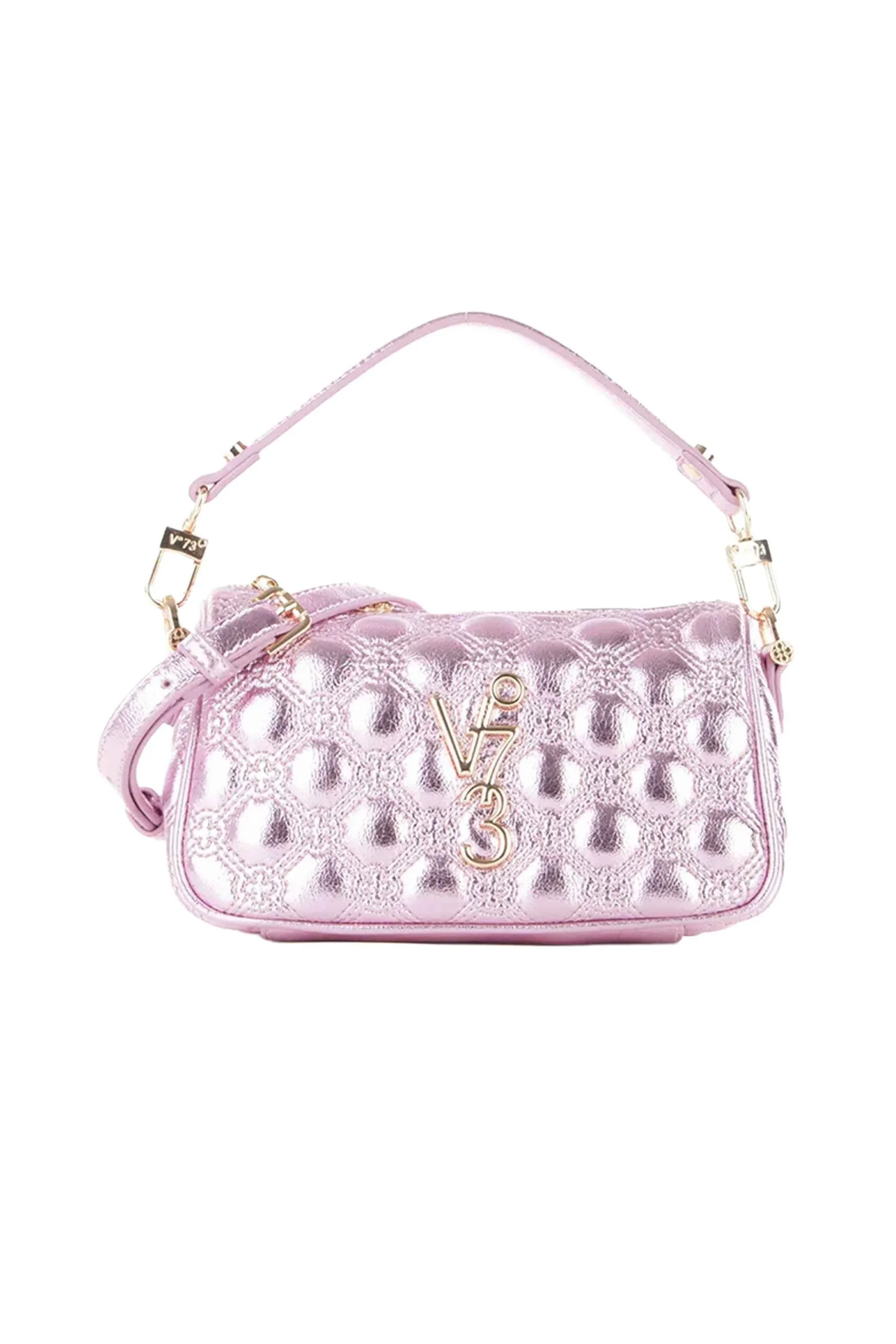 La borsa è realizzata in poliuretano con effetto metallizzato e motivo trapuntato.