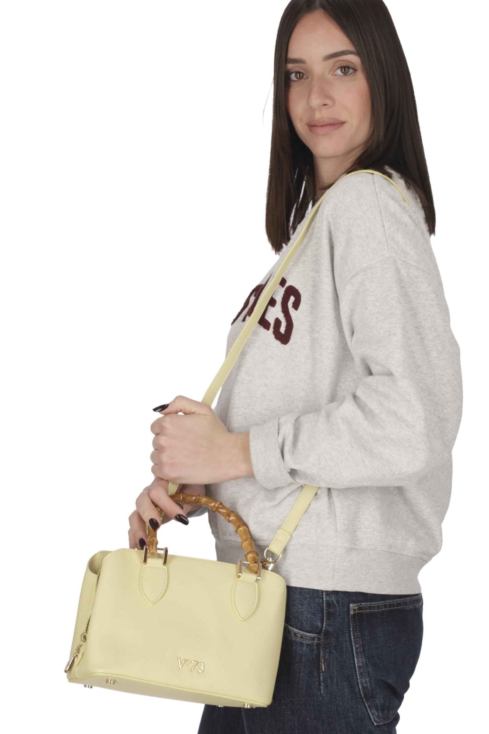 Presenta manici superiori in bamboo, chiusura zip e bottone a pressione, tracolla regolabile e rimovibile.