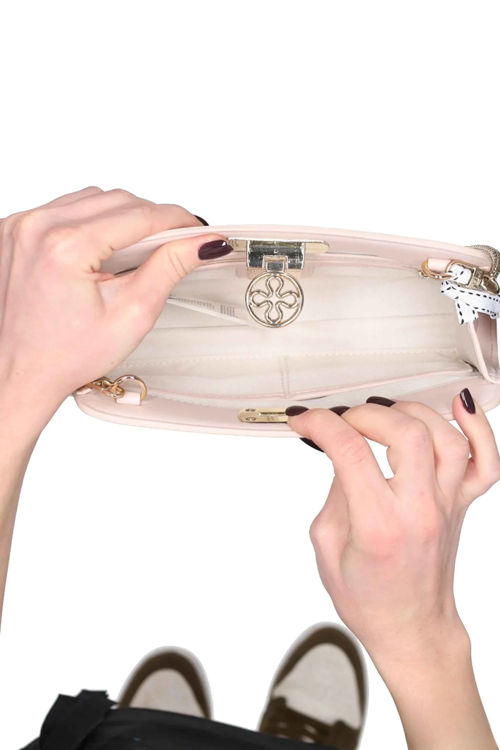 Presenta chiusura con bottone a girello, tracolla a catena rimovibile e interno foderato con tasca a parete con zip.