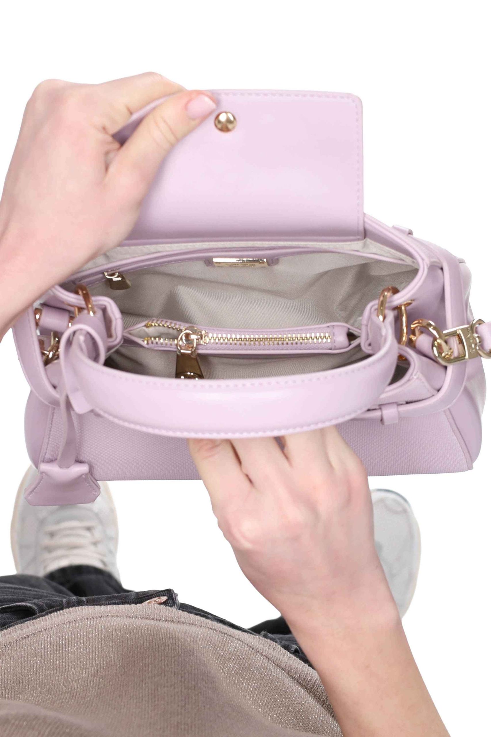 Presenta manico superiore, charms e logo sul davanti, tracolla regolabile e rimovibile, chiusura con bottone a pressione.