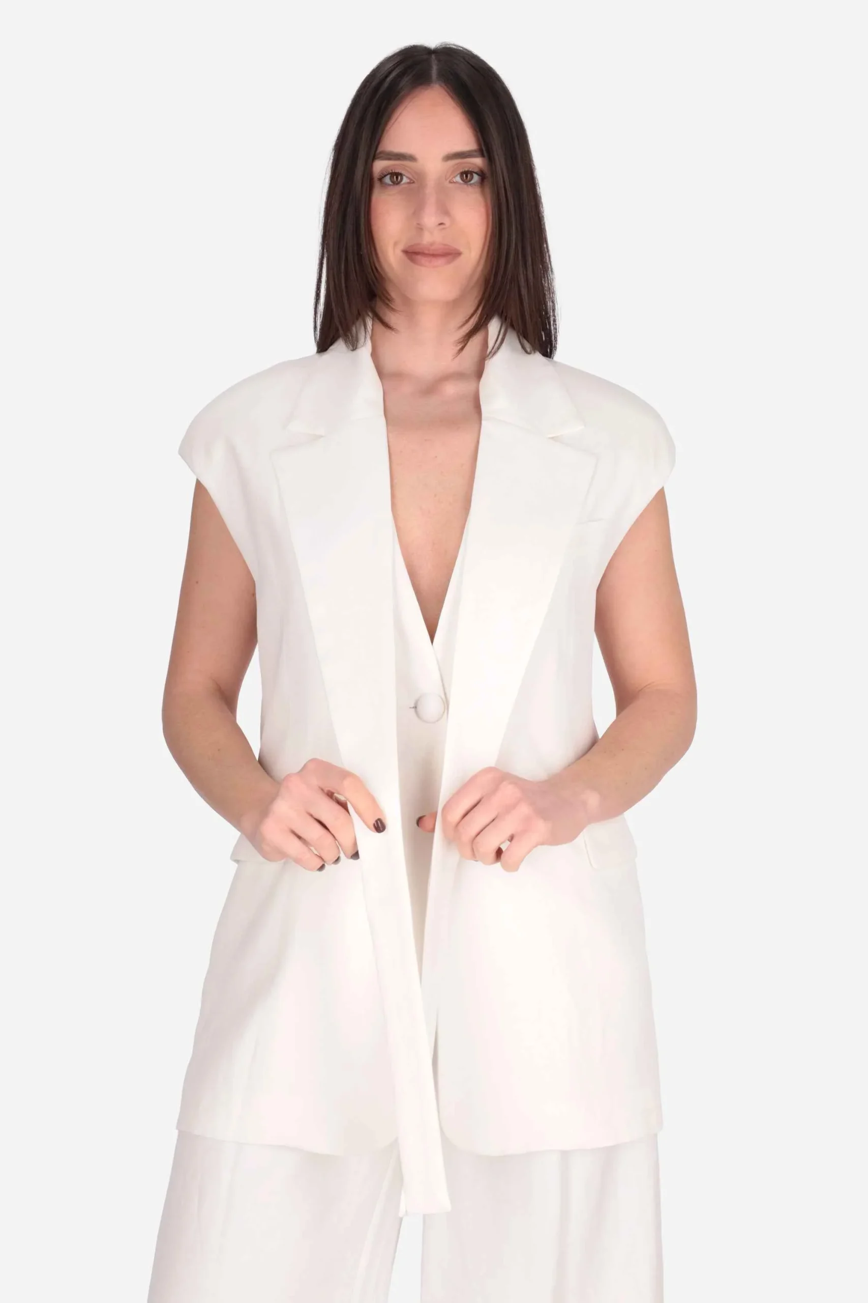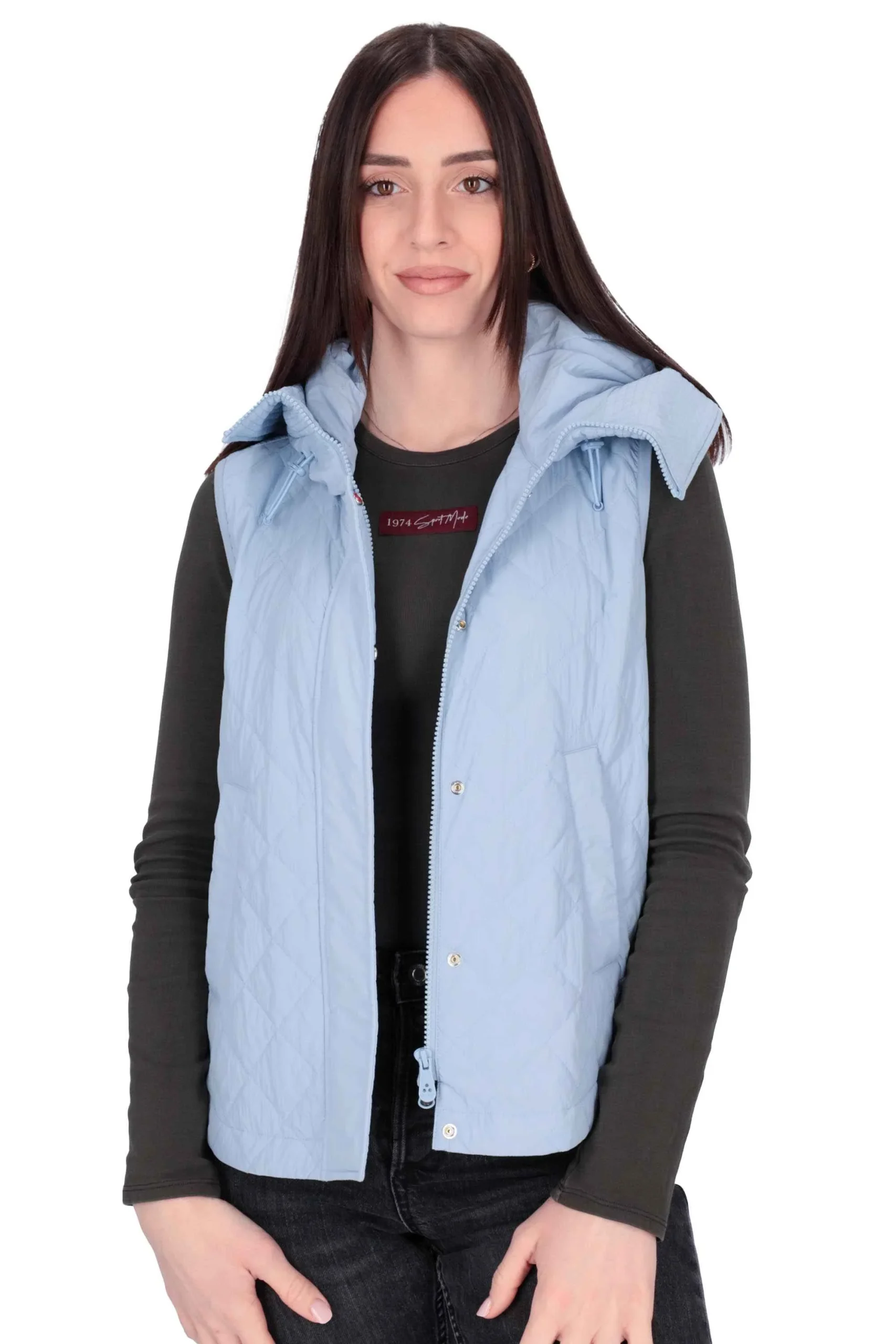 È un modello smanicato con cintura in abbinamento, collo ampio, chiusura con bottone a pressione, tasche sul davanti e una interna con logo.