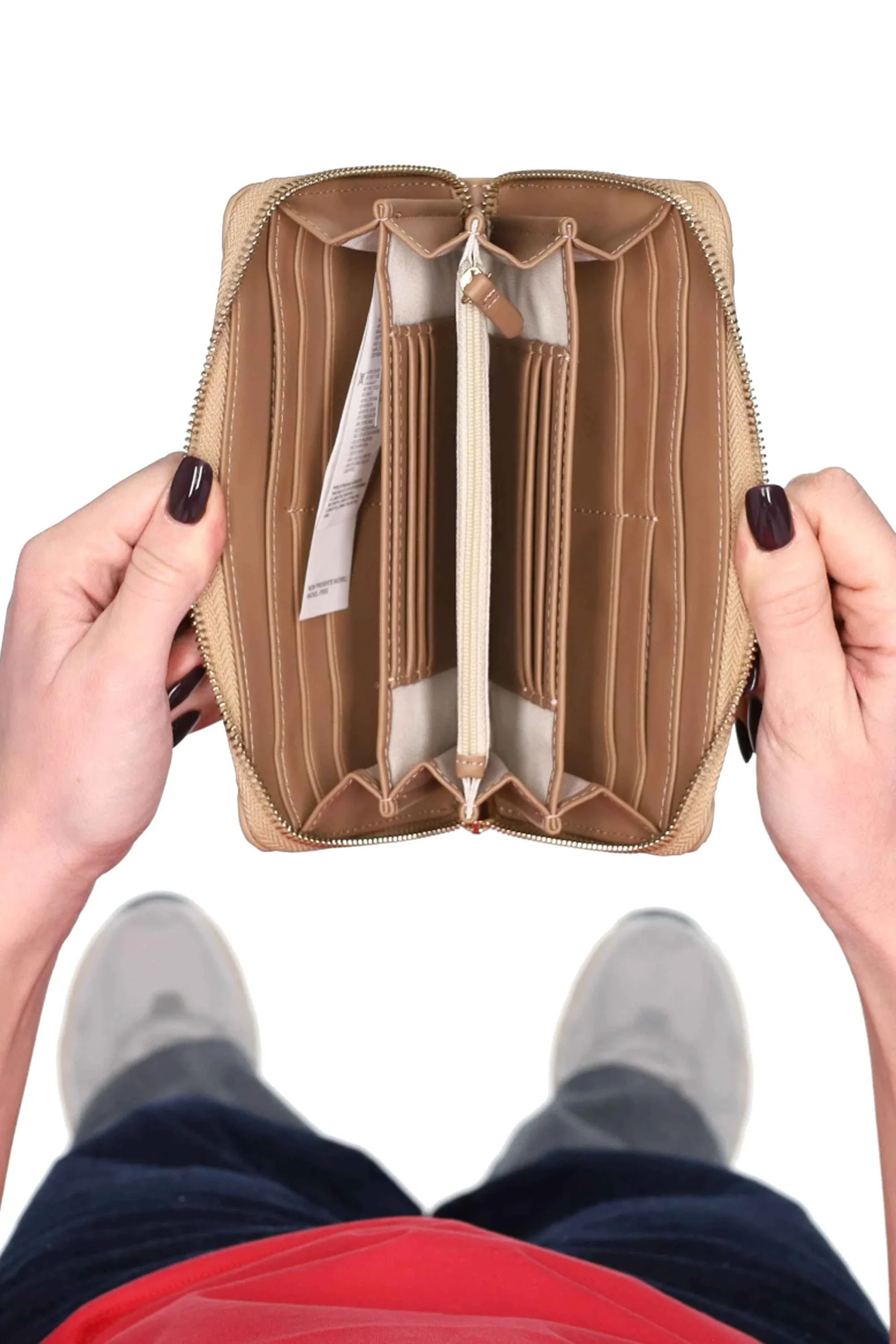 Presenta logo in metallo sul davanti, chiusura con zip e interno diviso in scomparti con tasca a zip per monete.