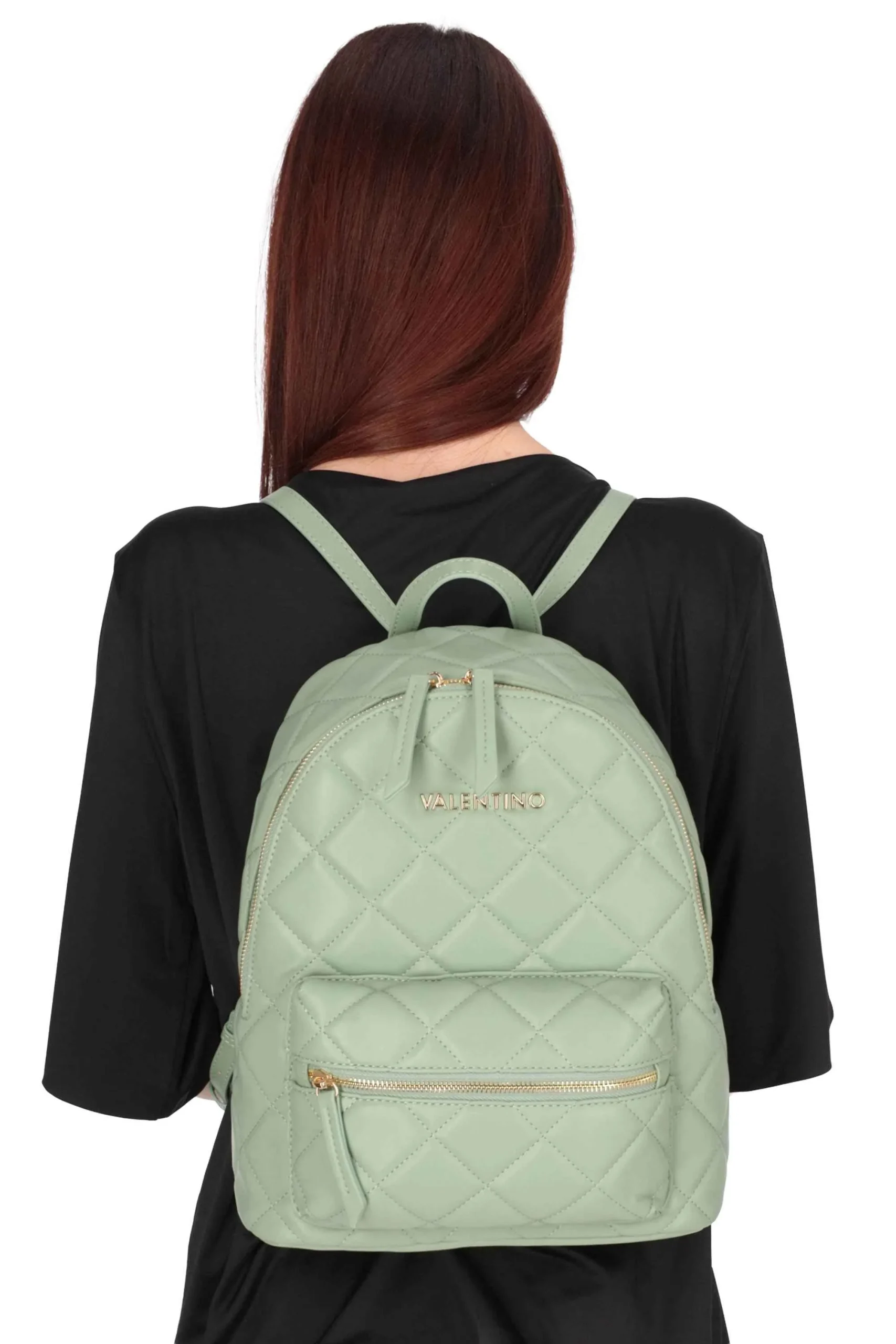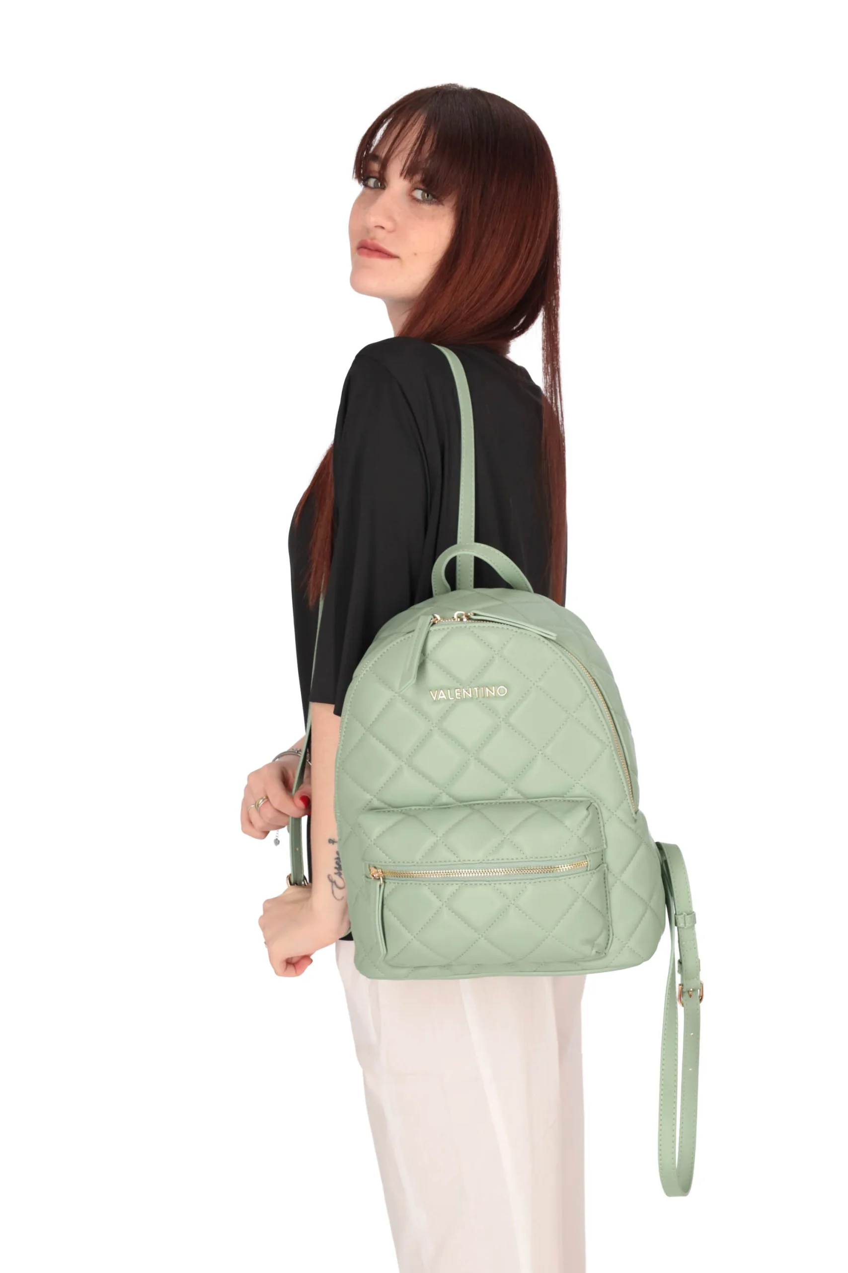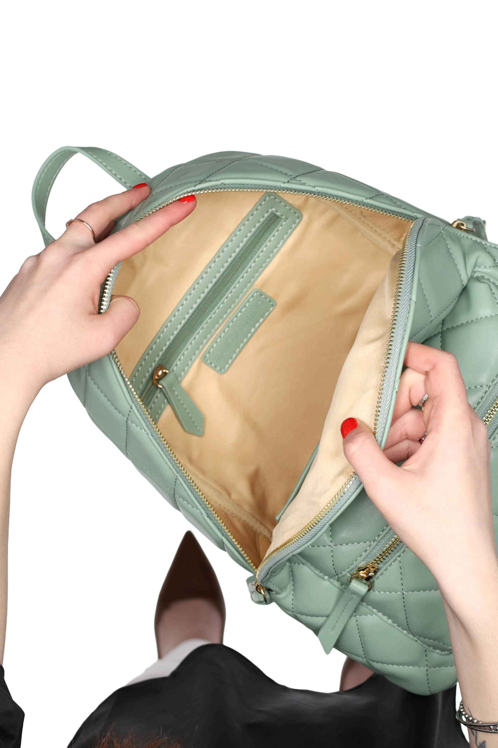 Lo zaino è realizzato in poliuretano con motivo trapuntato e in metallo sul davanti.