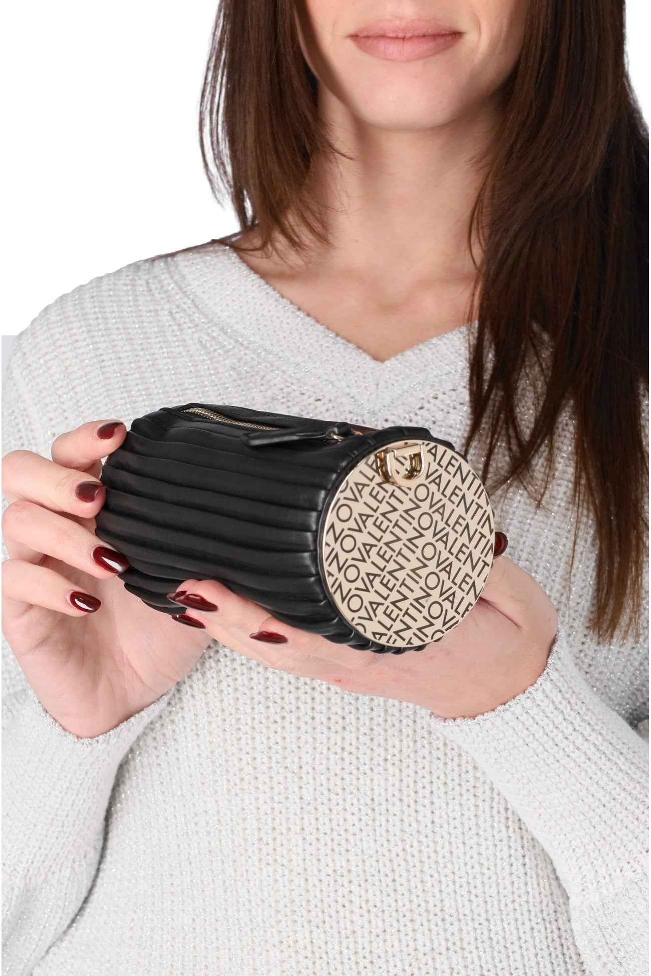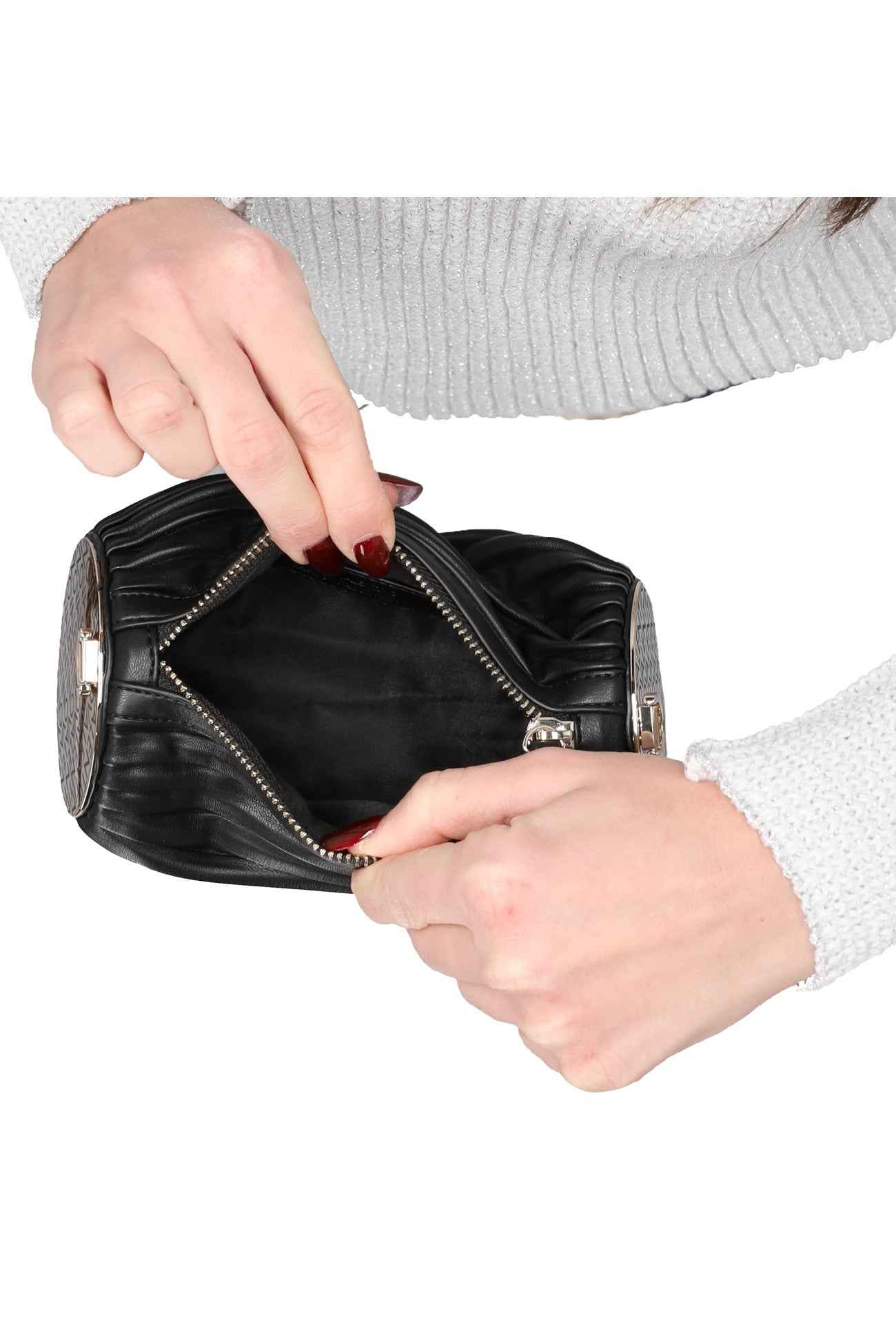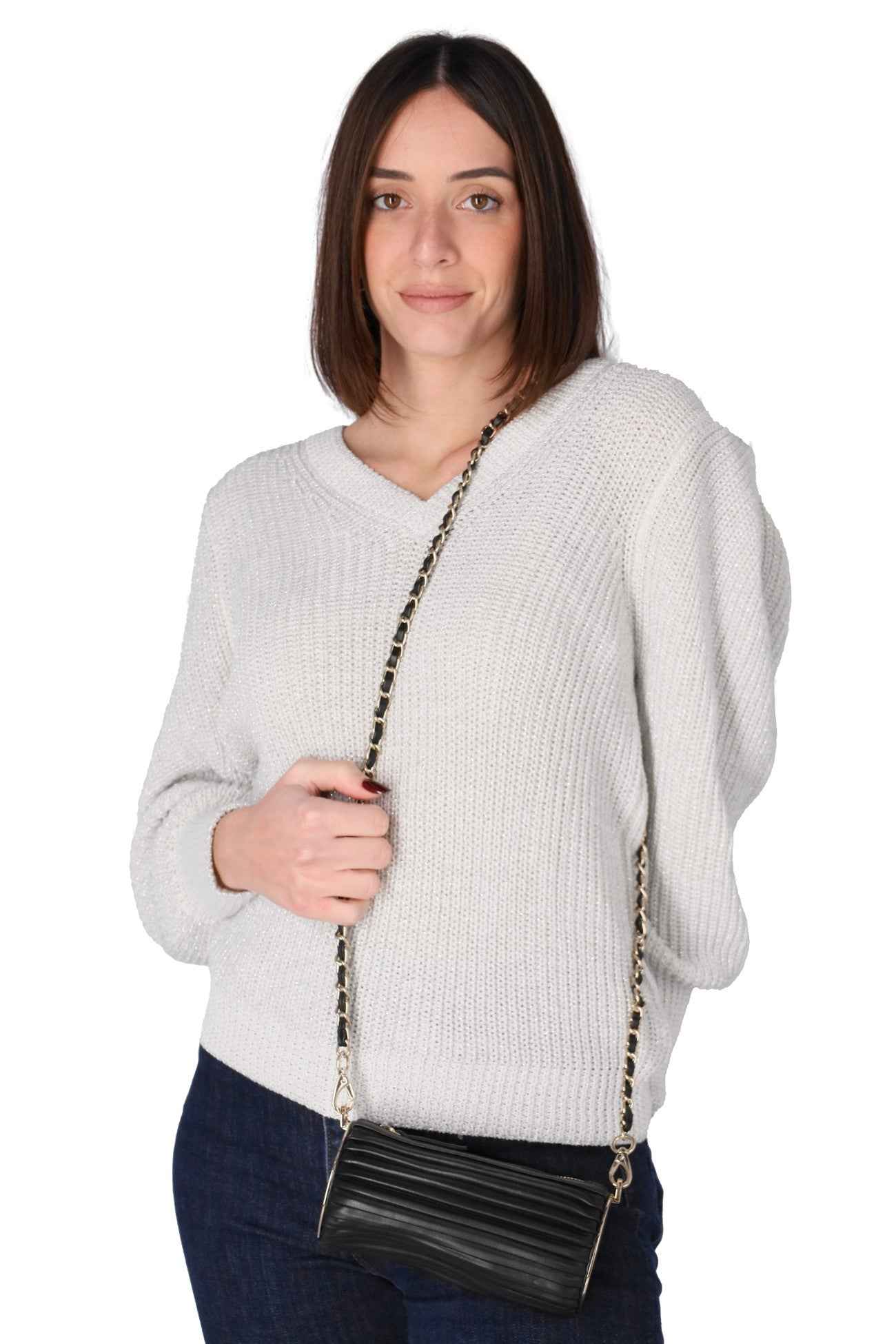 Presenta una tracolla a catena removibile e chiusura con bottone a girello.
