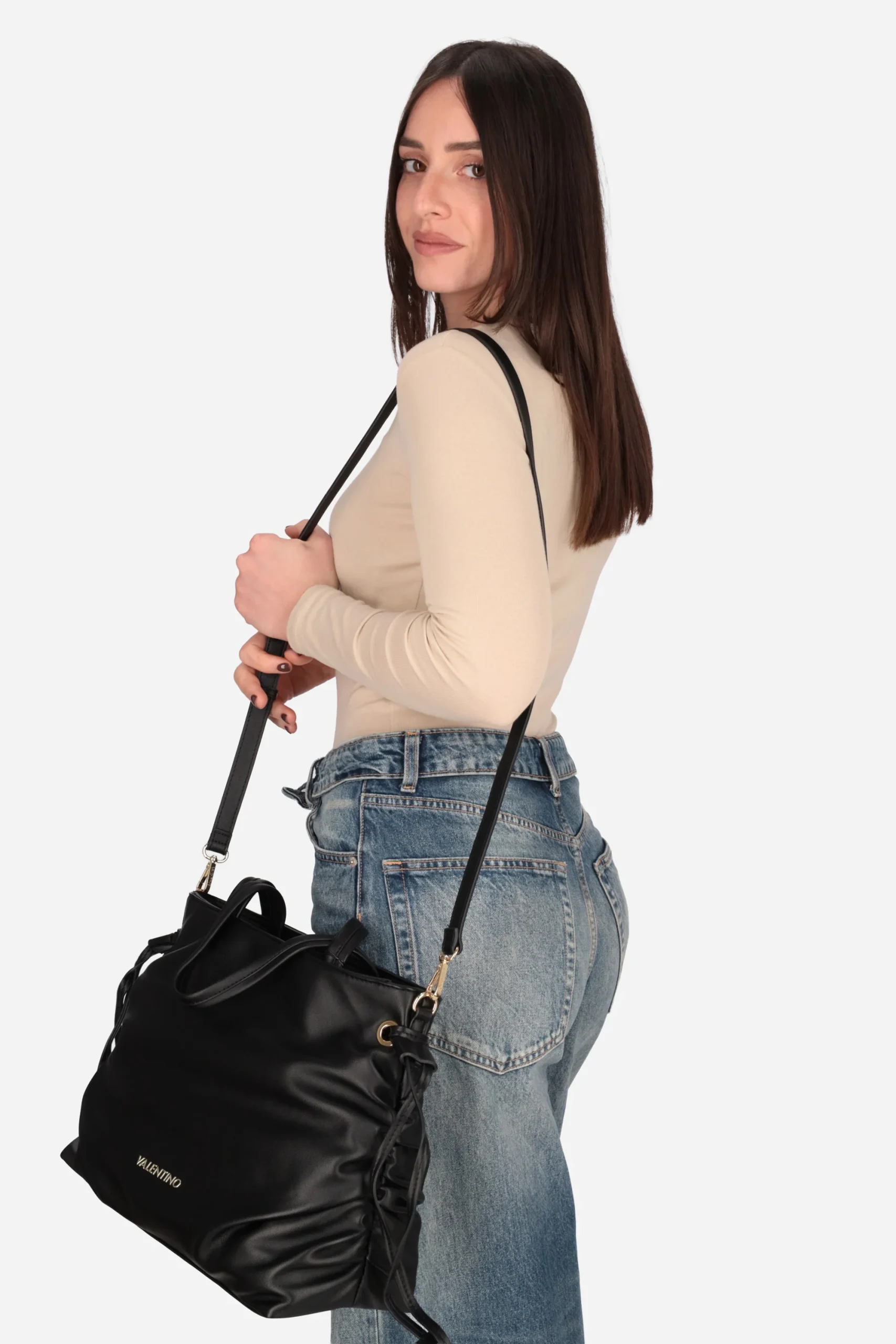 Presenta manici superiori, tracolla regolabile e rimovibile, chiusura con zip e coulisse laterali.