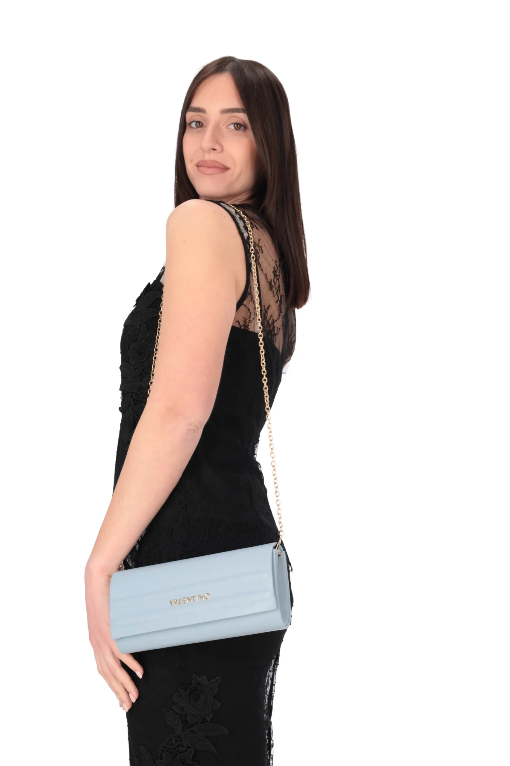 Presenta chiusura a patta con bottone e tracolla a catena rimovibile.